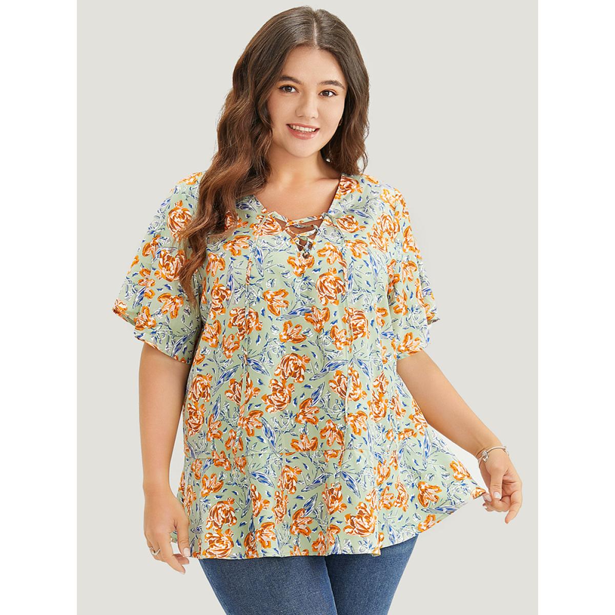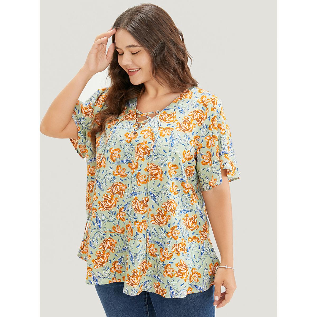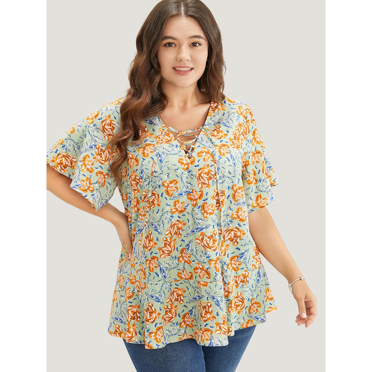 Plus Size Mint Floral Ruffle Sleeve Lace Up V Neck Blouse Women Elegant Short sleeve V-neck Dailywear Blouses BloomChic 12/L