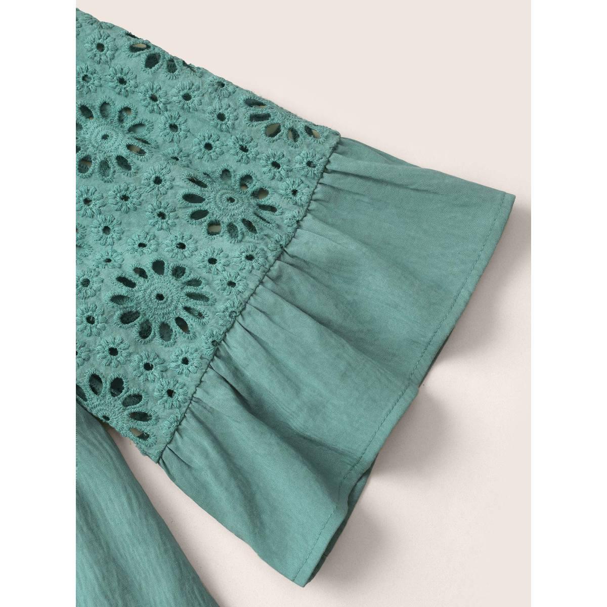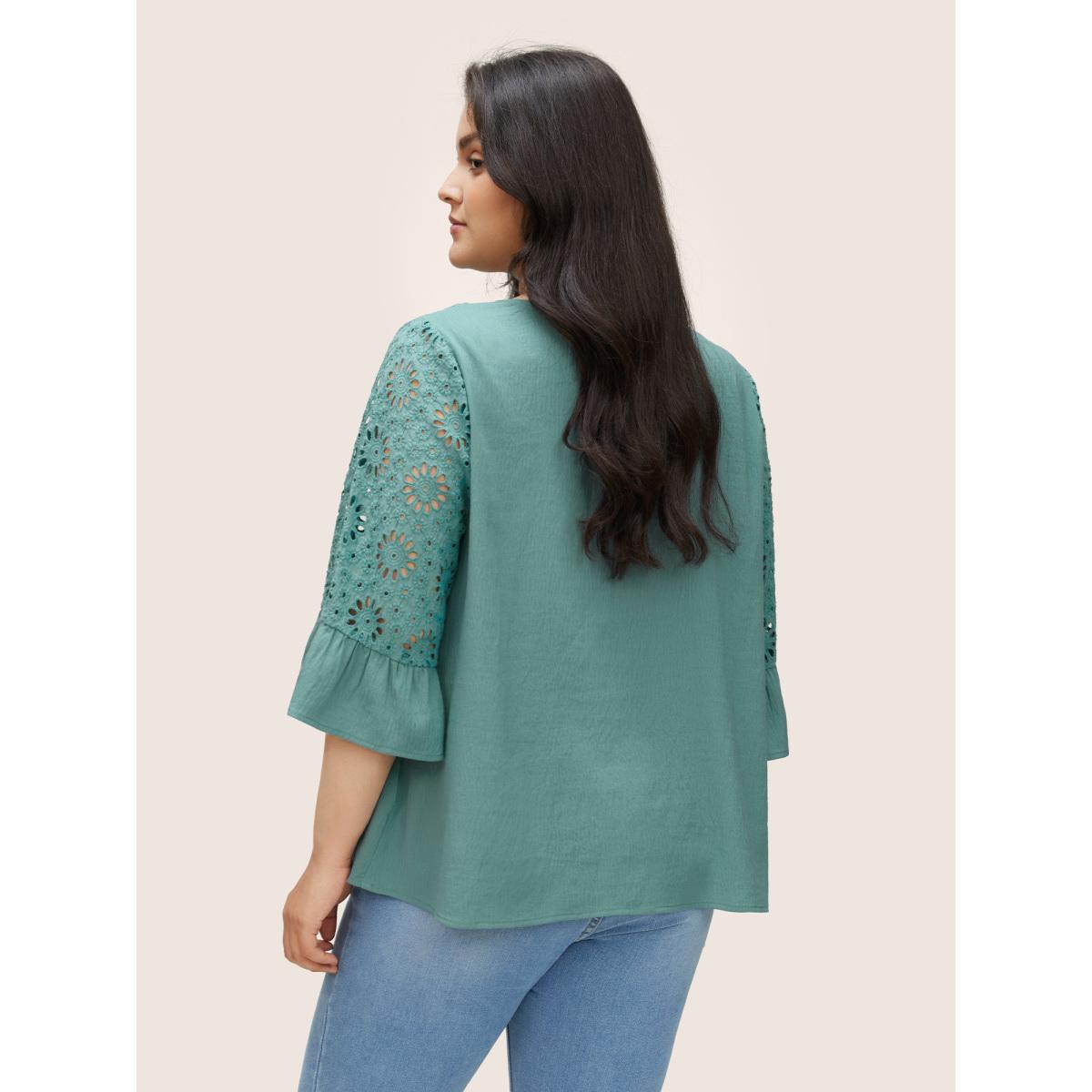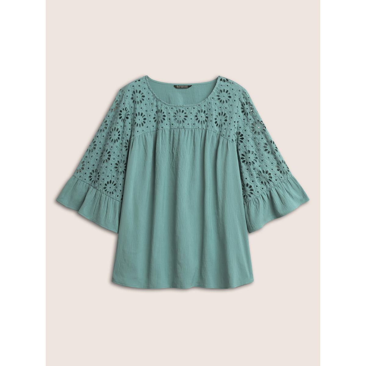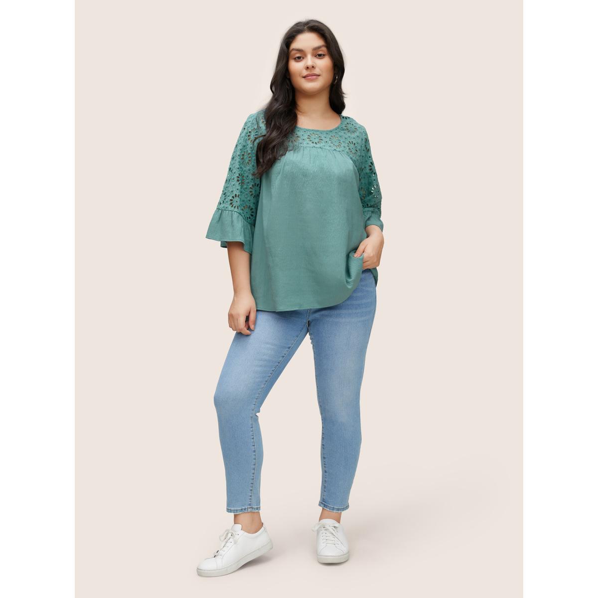 Plus Size Mint Plain Broderie Anglaise Ruffle Sleeve Blouse Women Casual Elbow-length sleeve Round Neck Everyday Blouses BloomChic 18-20/2X