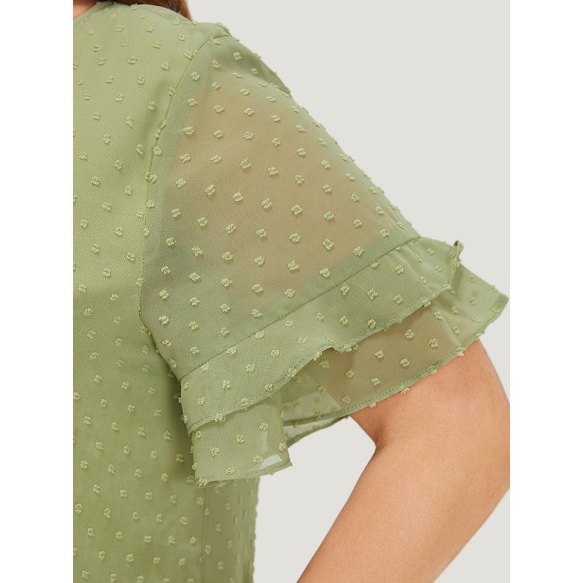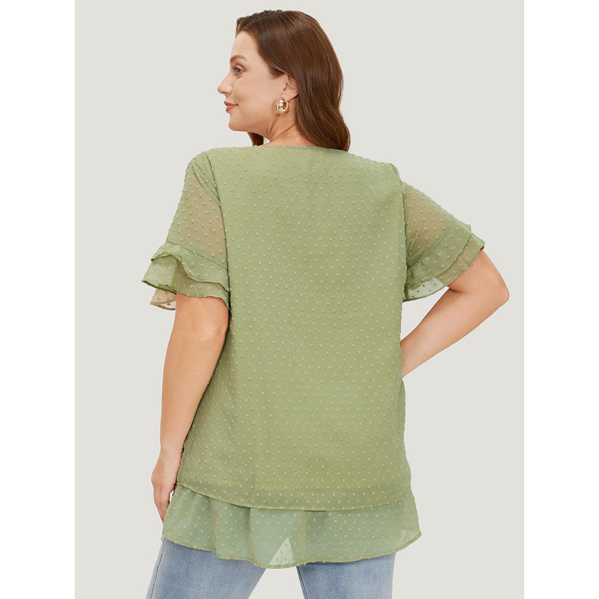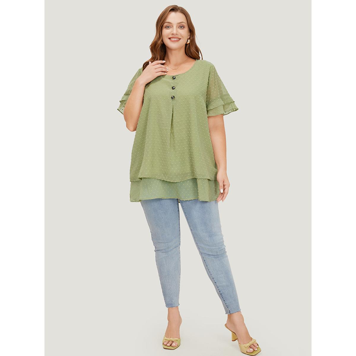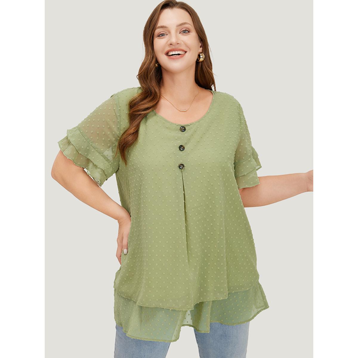 Plus Size Mint Polka Dot Button Detail Mesh Ruffle Layered Blouse Women Elegant Short sleeve Round Neck Dailywear Blouses BloomChic 28/5X