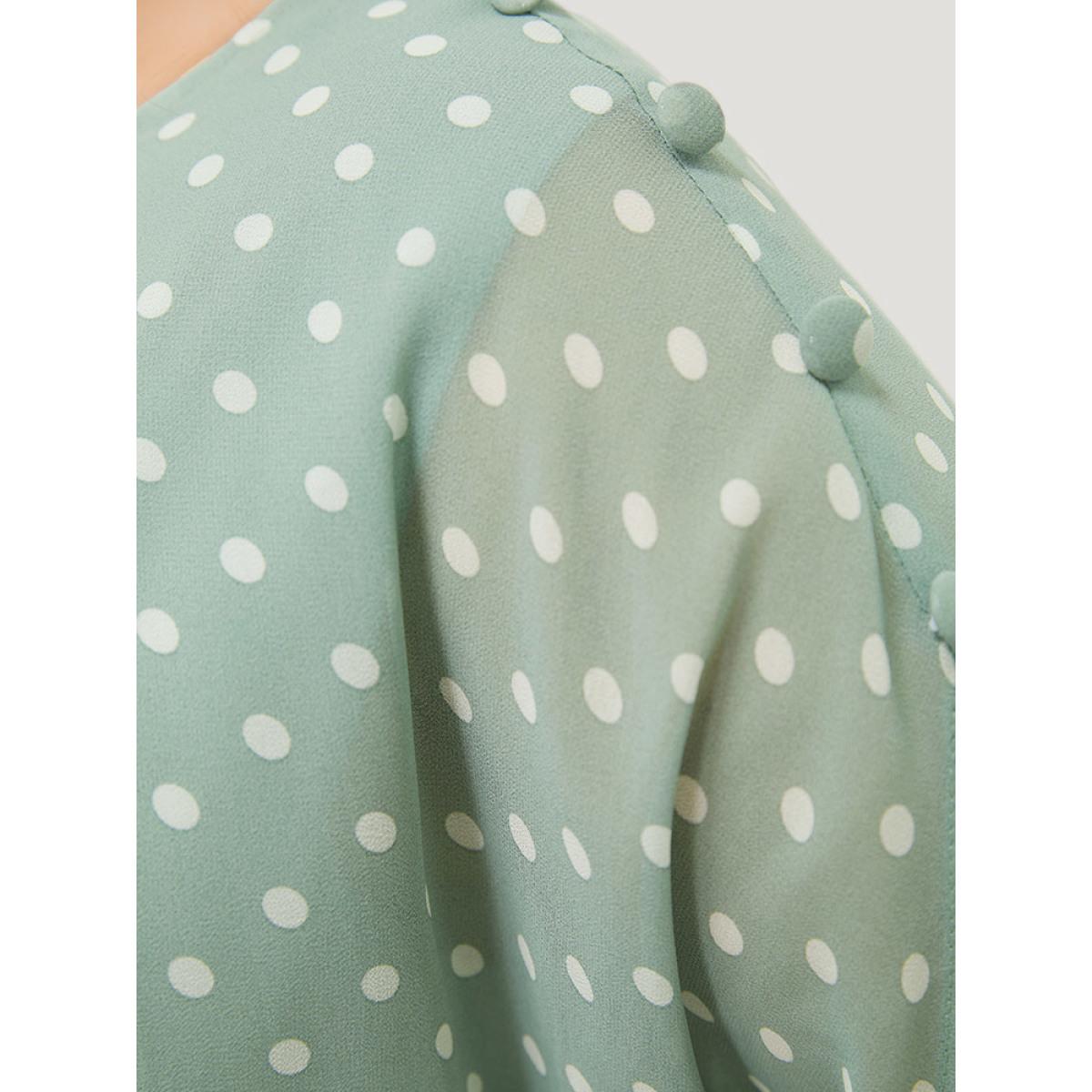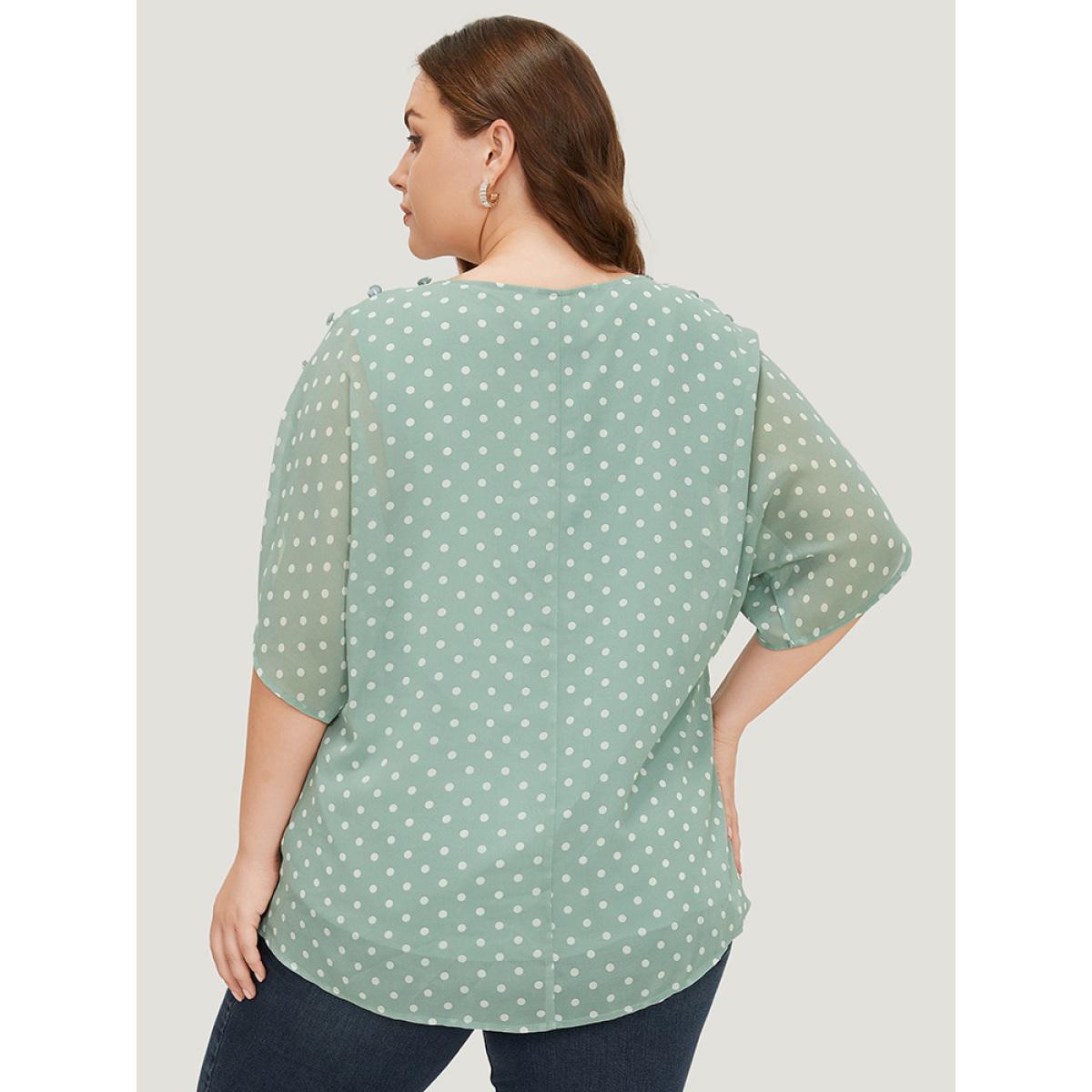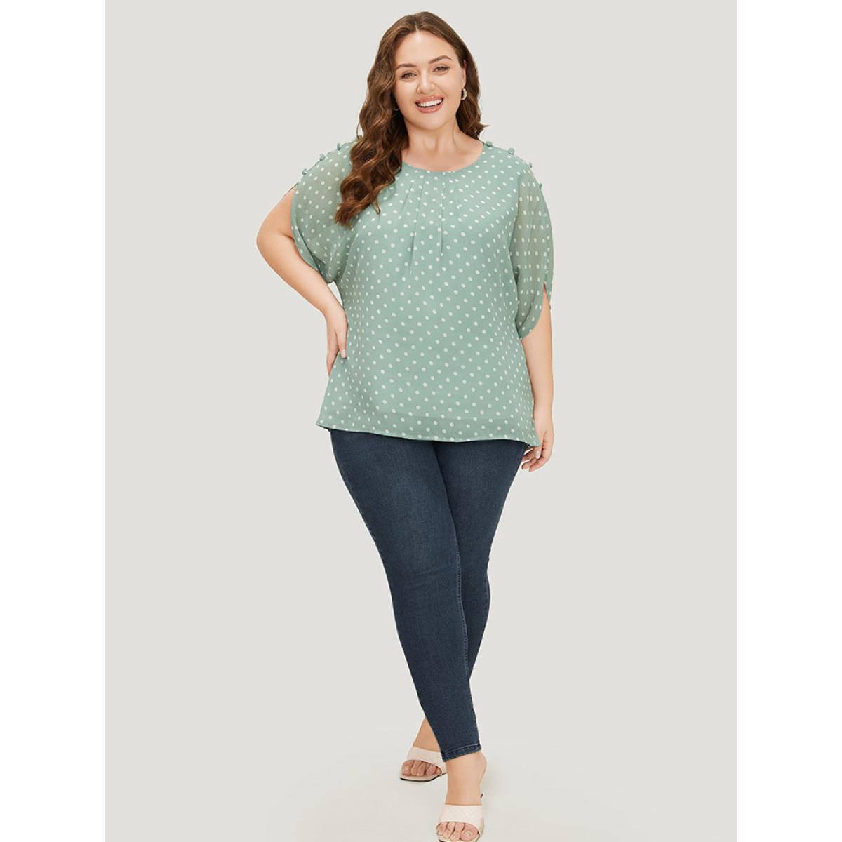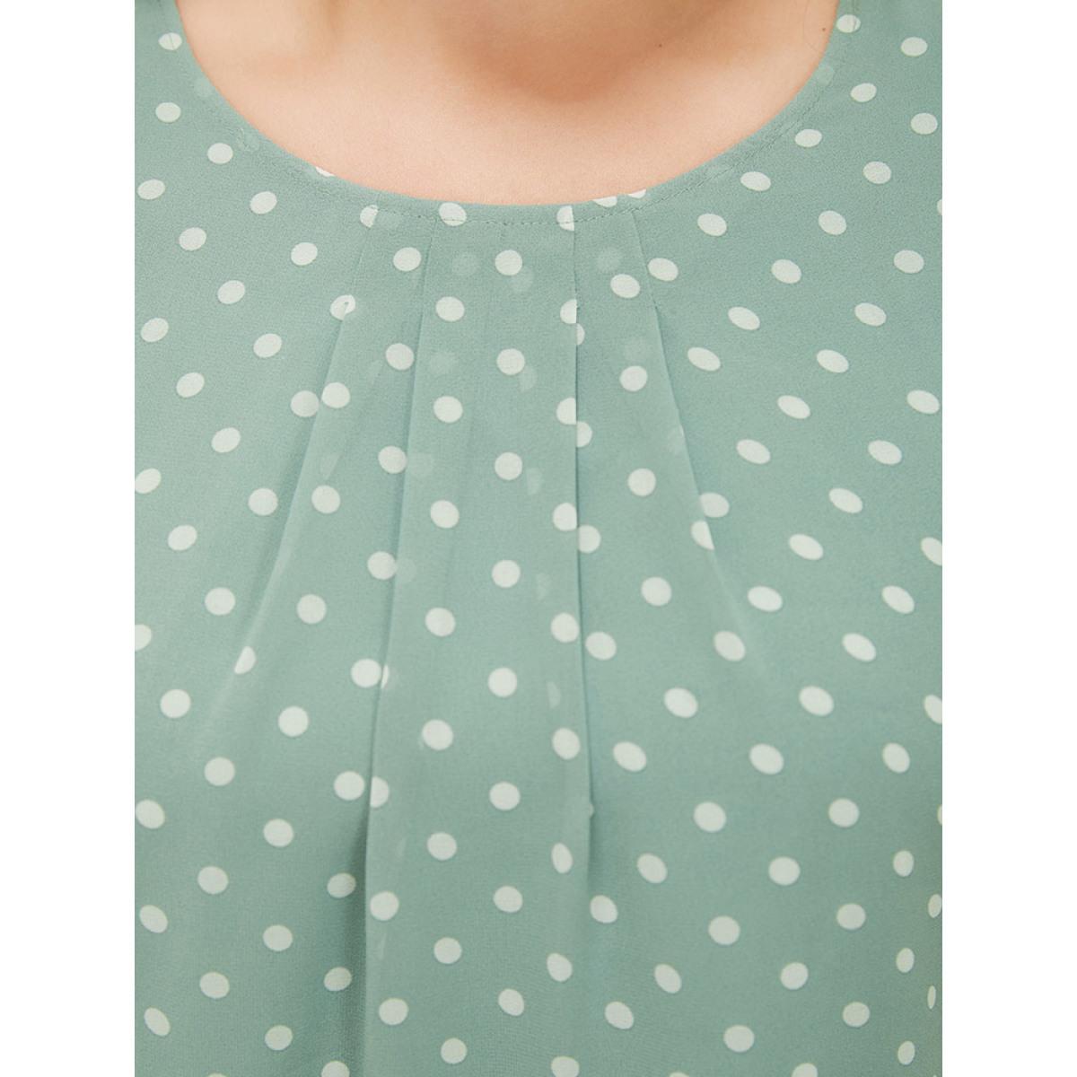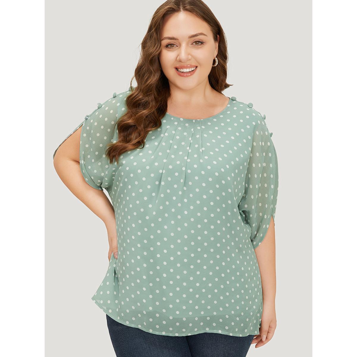 Plus Size Mint Polka Dot Pleated Button Detail Split Sleeve Blouse Women Elegant Half Sleeve Round Neck Dailywear Blouses BloomChic 14-16/1X