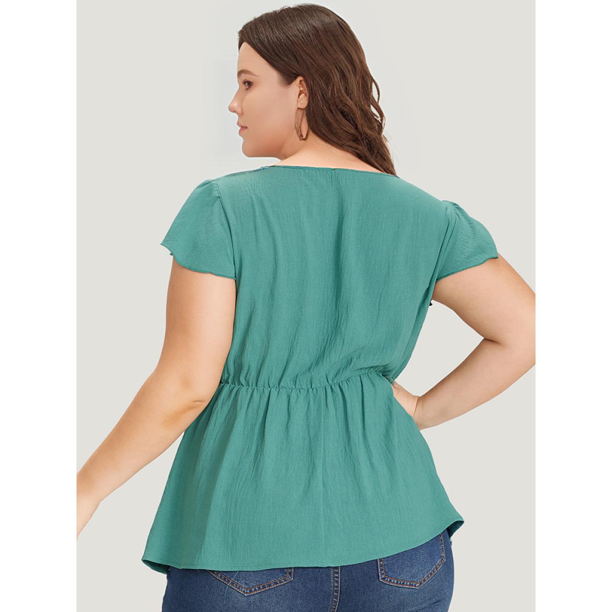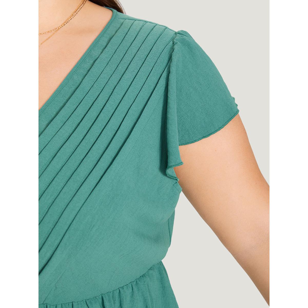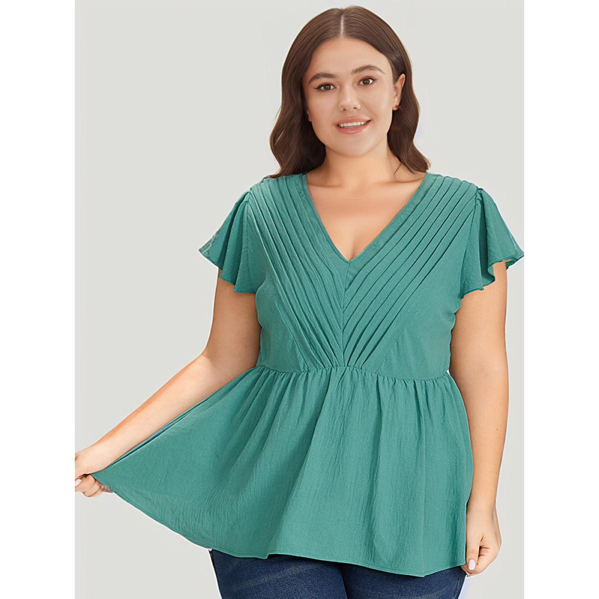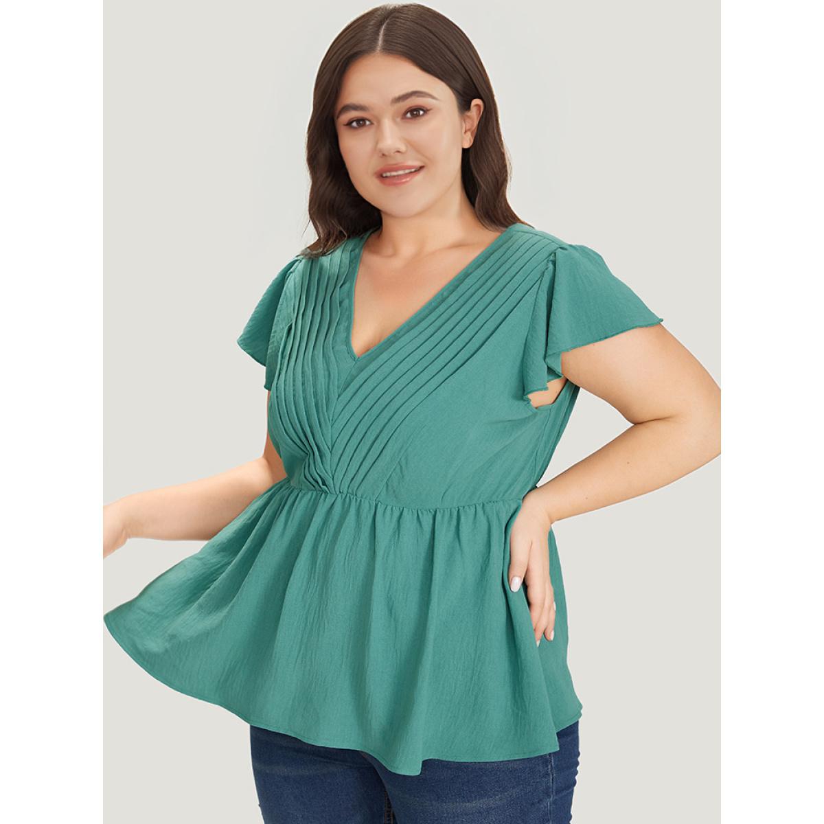 Plus Size Mint Solid Pleated Flutter Cap Sleeve Blouse Women Elegant Cap Sleeve V-neck Dailywear Blouses BloomChic 22-24/3X Product Image