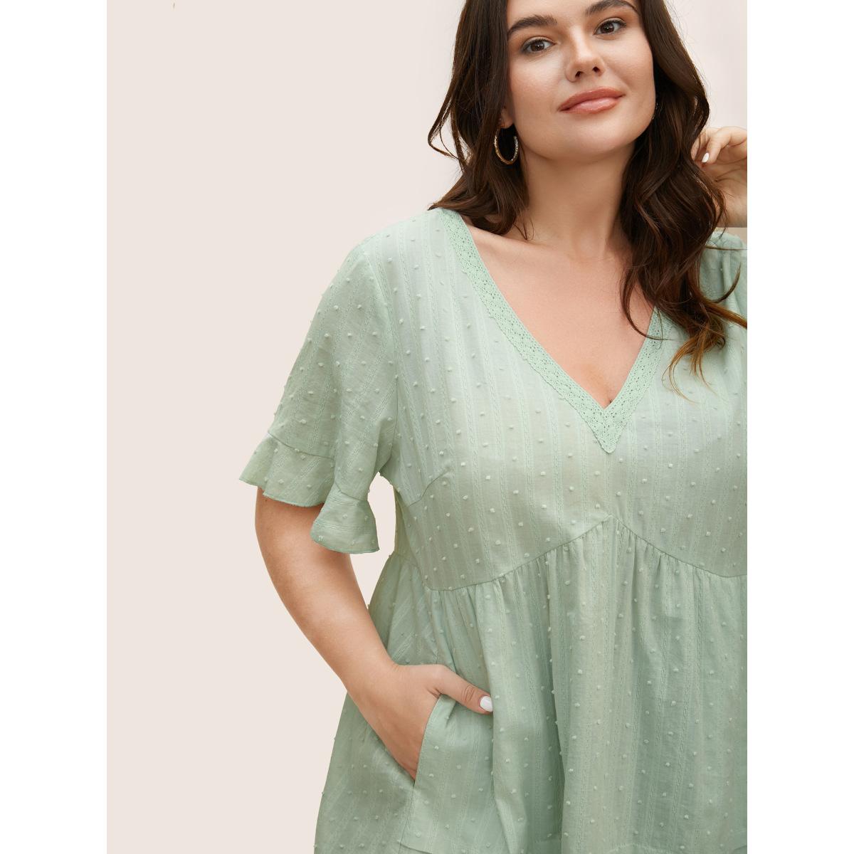 Plus Size Mint Textured Lace Panel Pleated Pocket Blouse Women Casual Short sleeve V-neck Everyday Blouses BloomChic 22-24/3X Product Image
