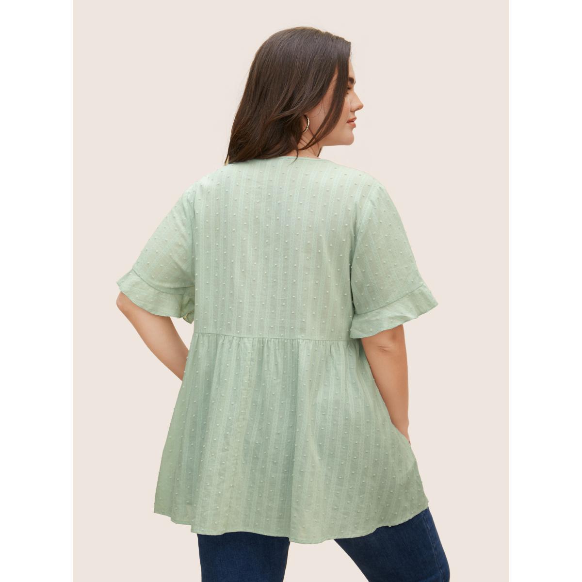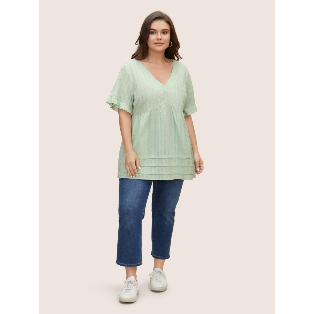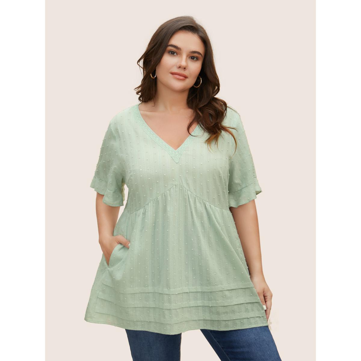 Plus Size Mint Textured Lace Panel Pleated Pocket Blouse Women Casual Short sleeve V-neck Everyday Blouses BloomChic 22-24/3X