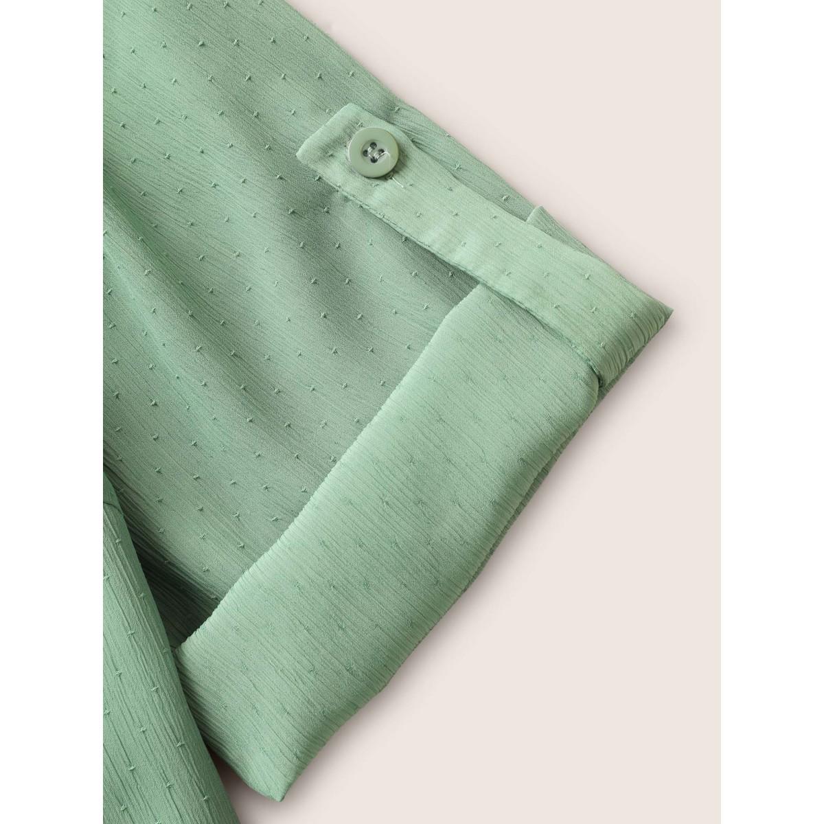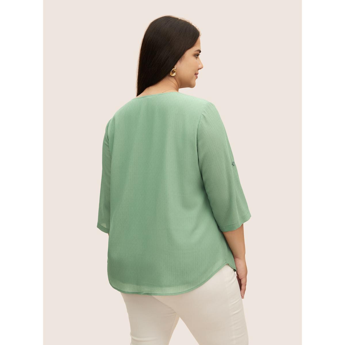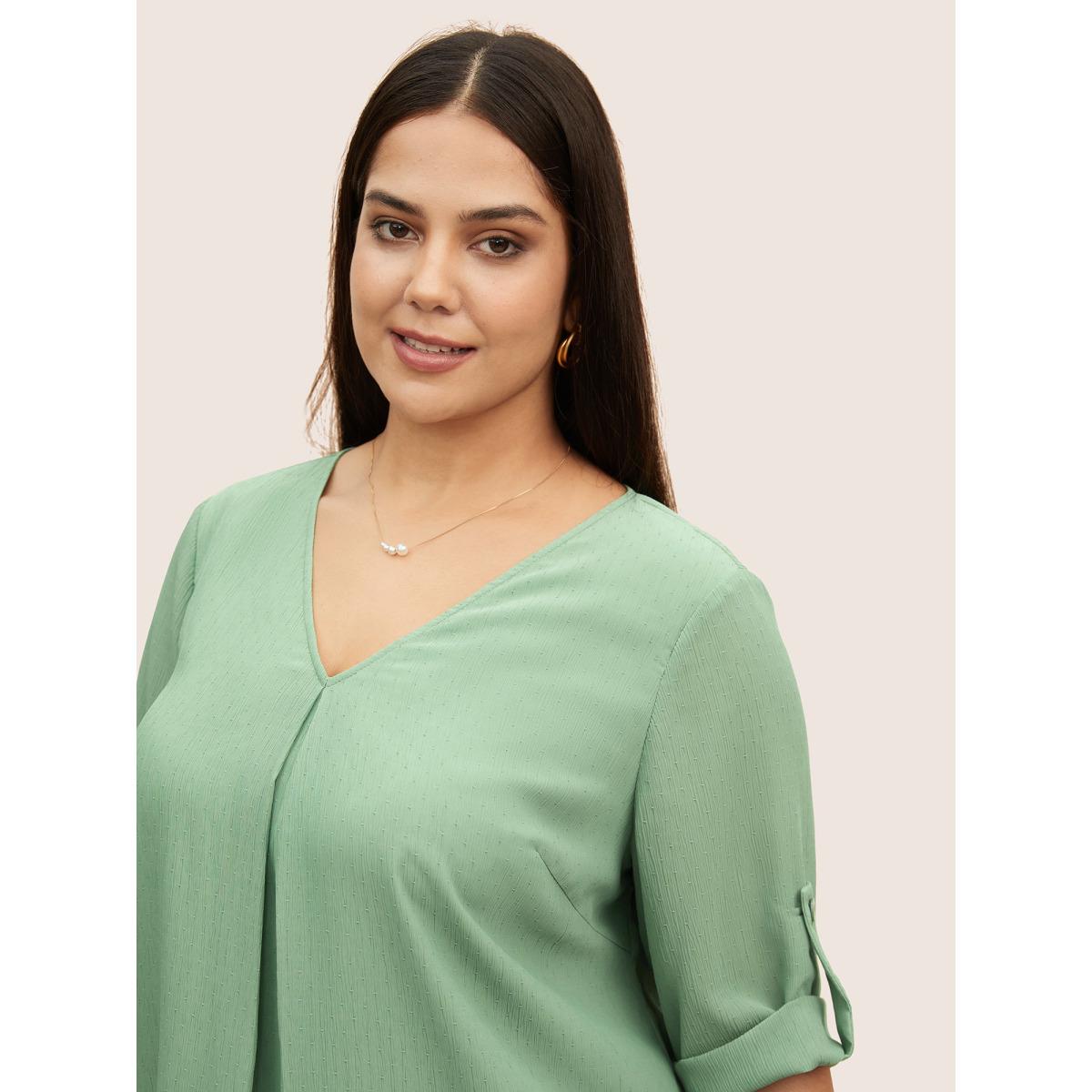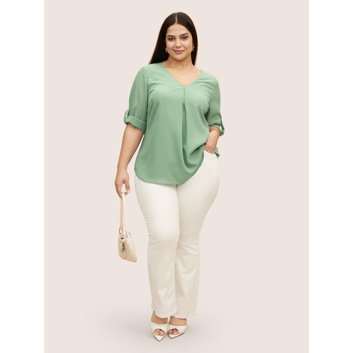Plus Size Mint V Neck Plain Pleated Tab Sleeve Blouse Women Work From Home Elbow-length sleeve V-neck Work Blouses BloomChic 12/L