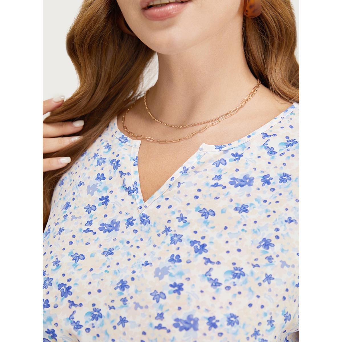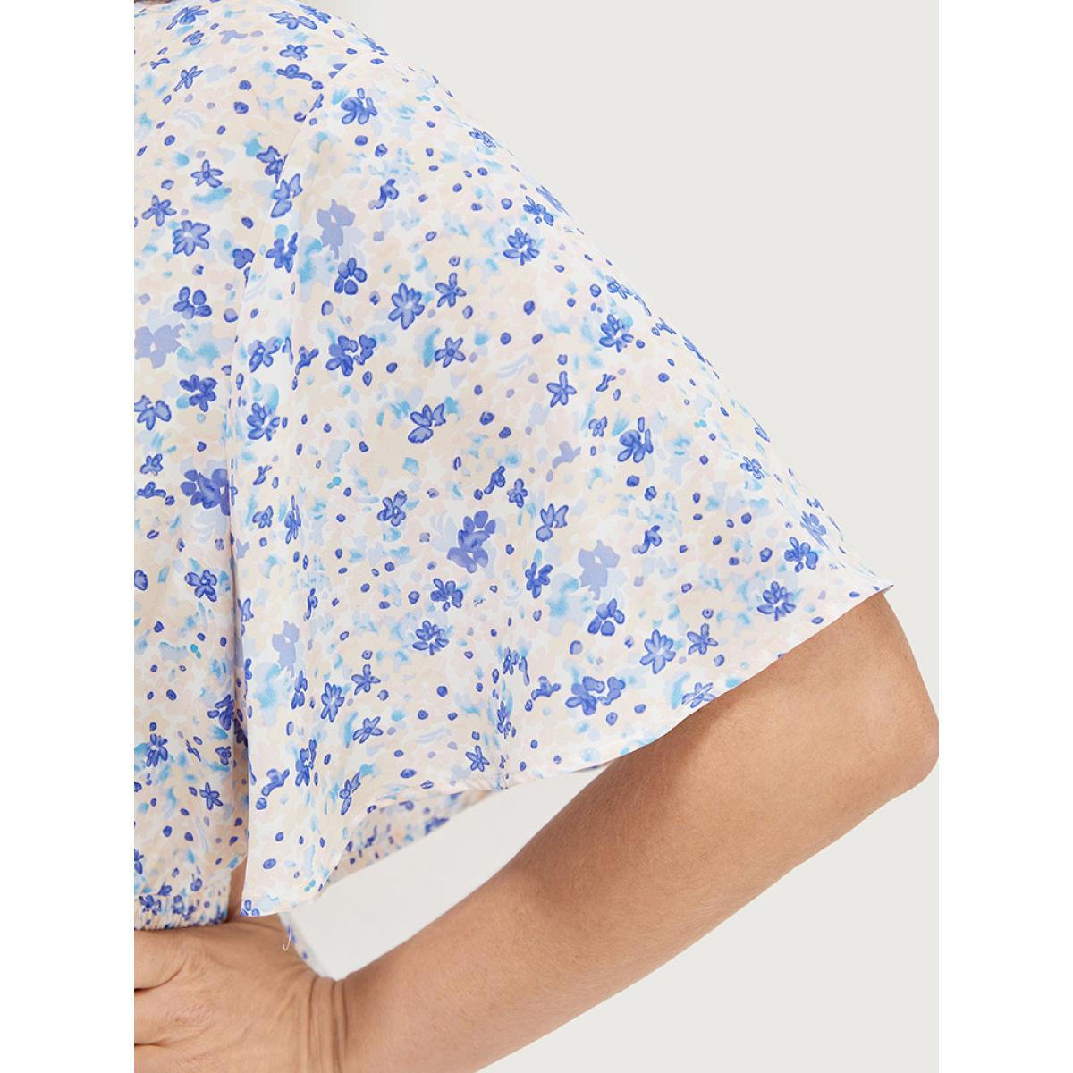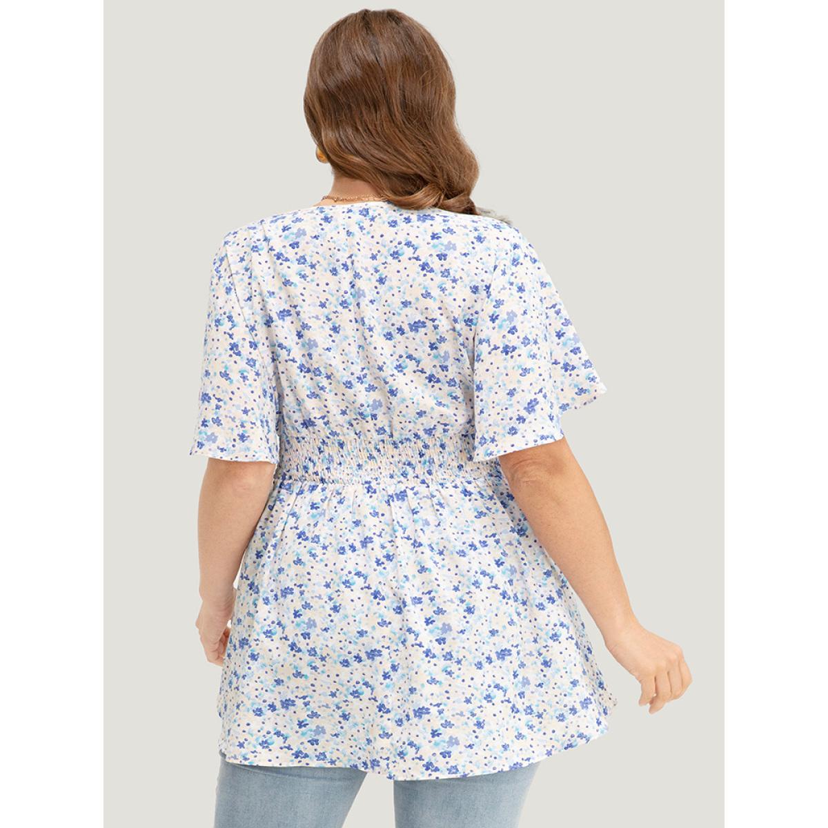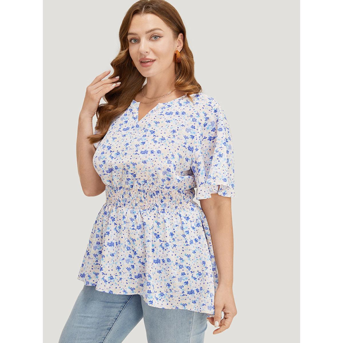 Plus Size MistyRose Ditsy Floral Notched Shirred Flutter Sleeve Blouse Women Elegant Short sleeve Notched collar Dailywear Blouses BloomChic 18-20/2X