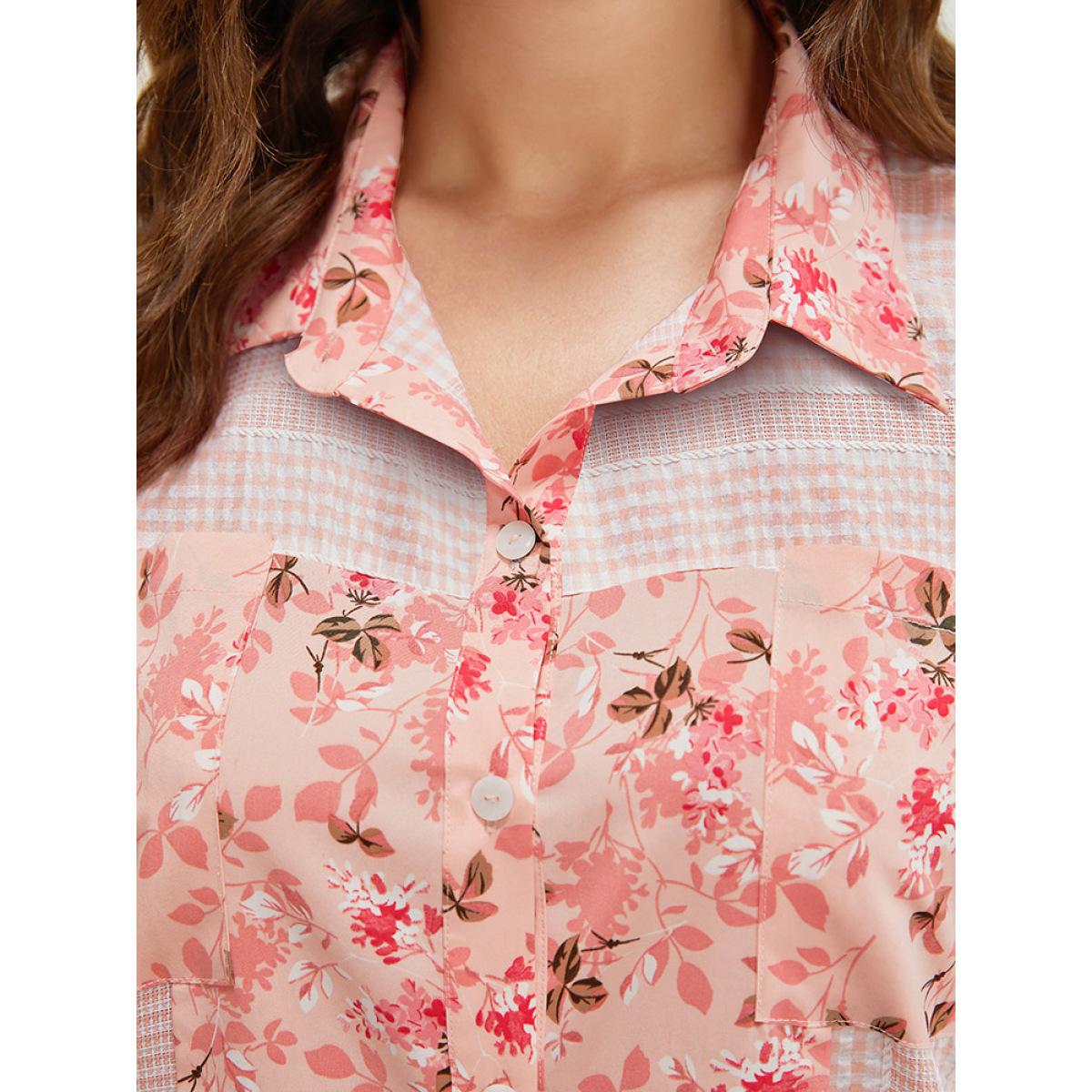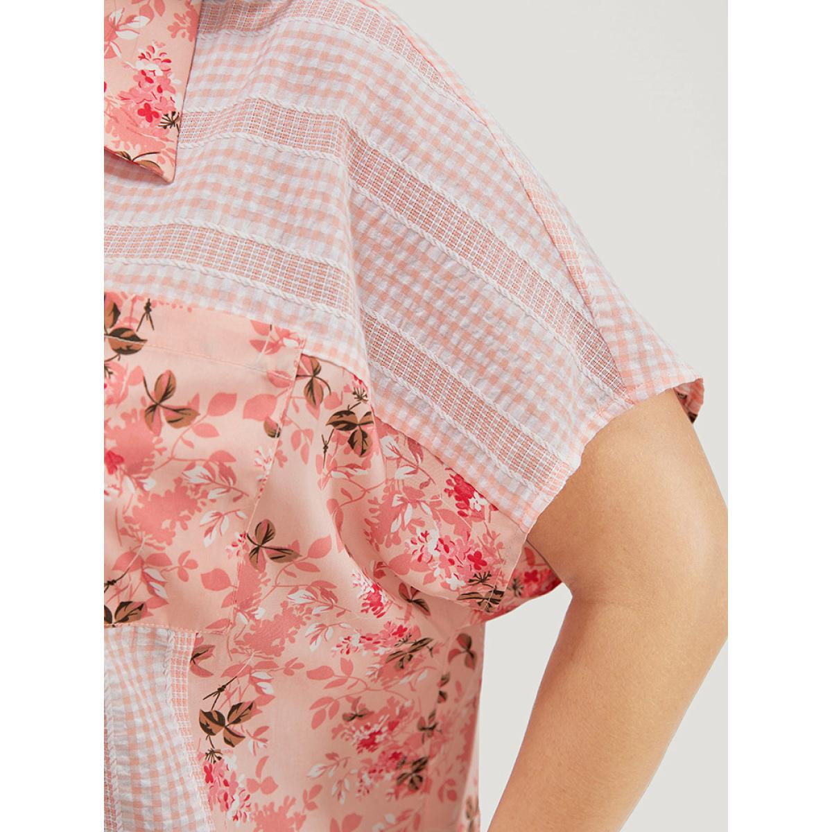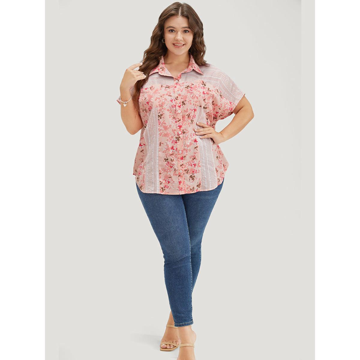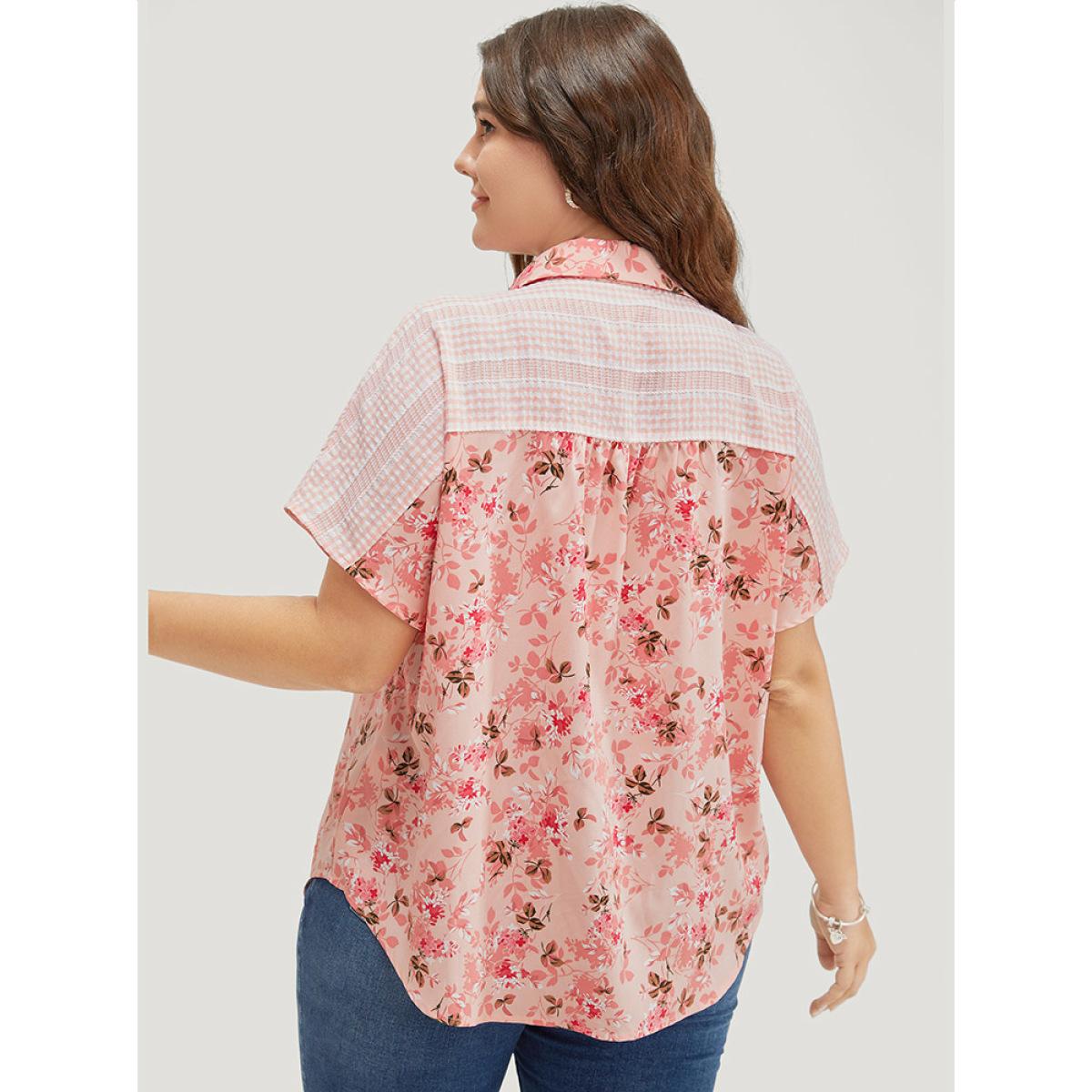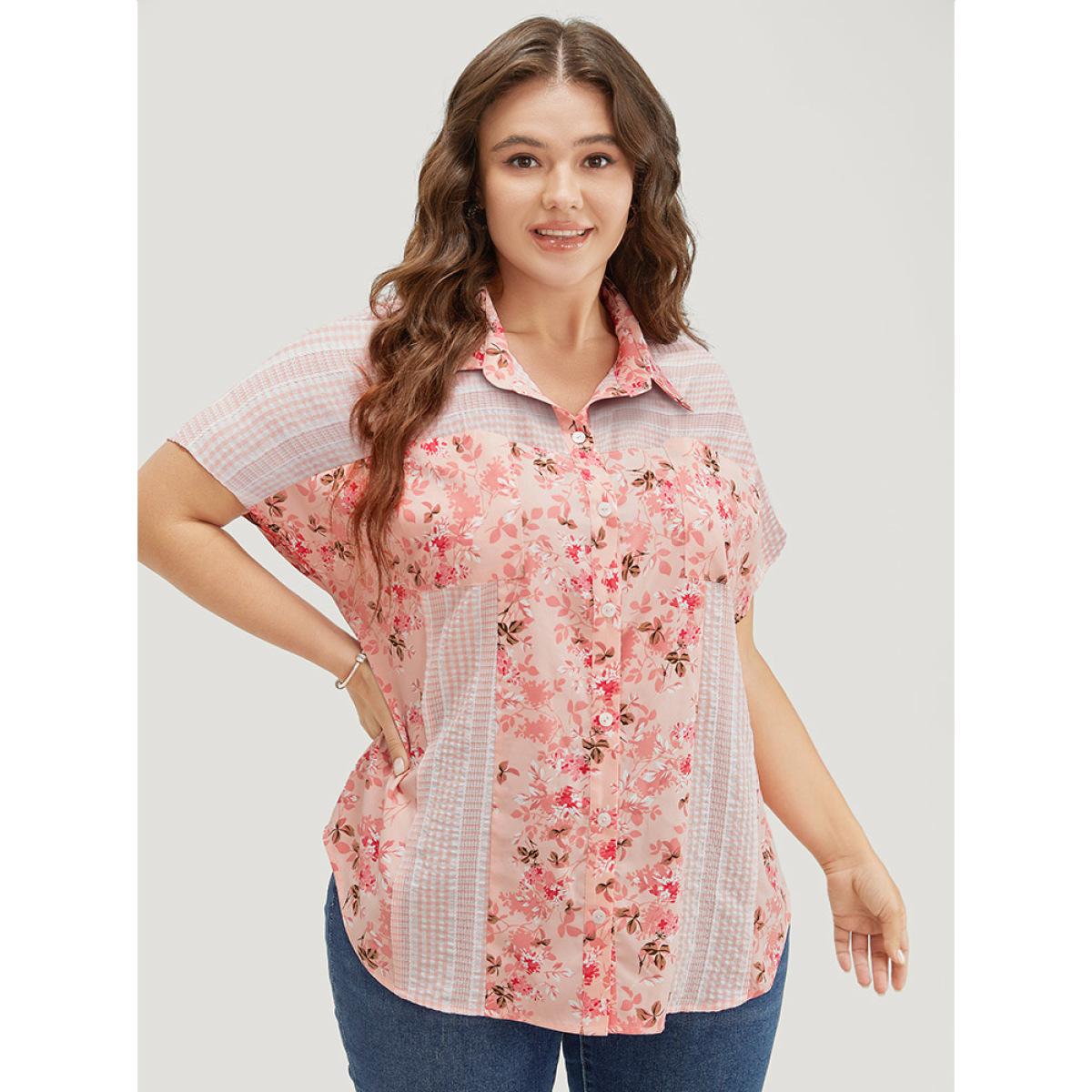 Plus Size MistyRose Floral Patchwork Pocket Button Up Arc Hem Blouse Women Elegant Short sleeve Shirt collar Dailywear Blouses BloomChic 10/M