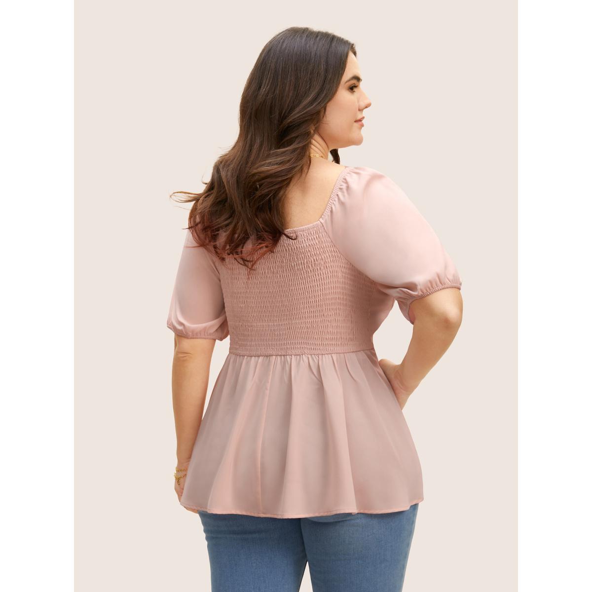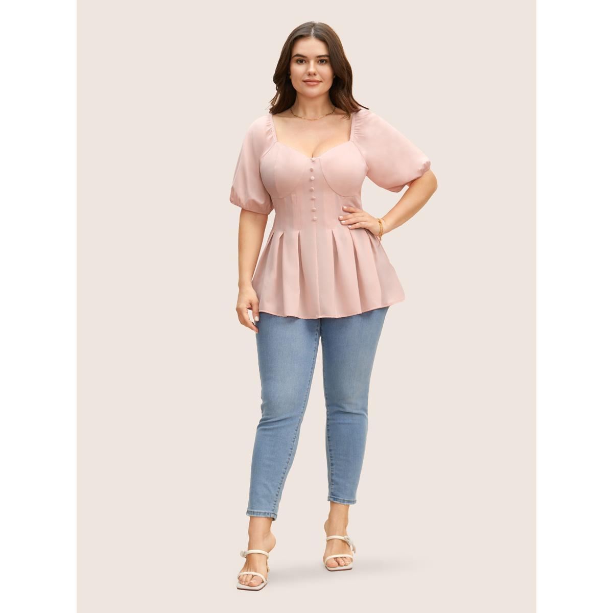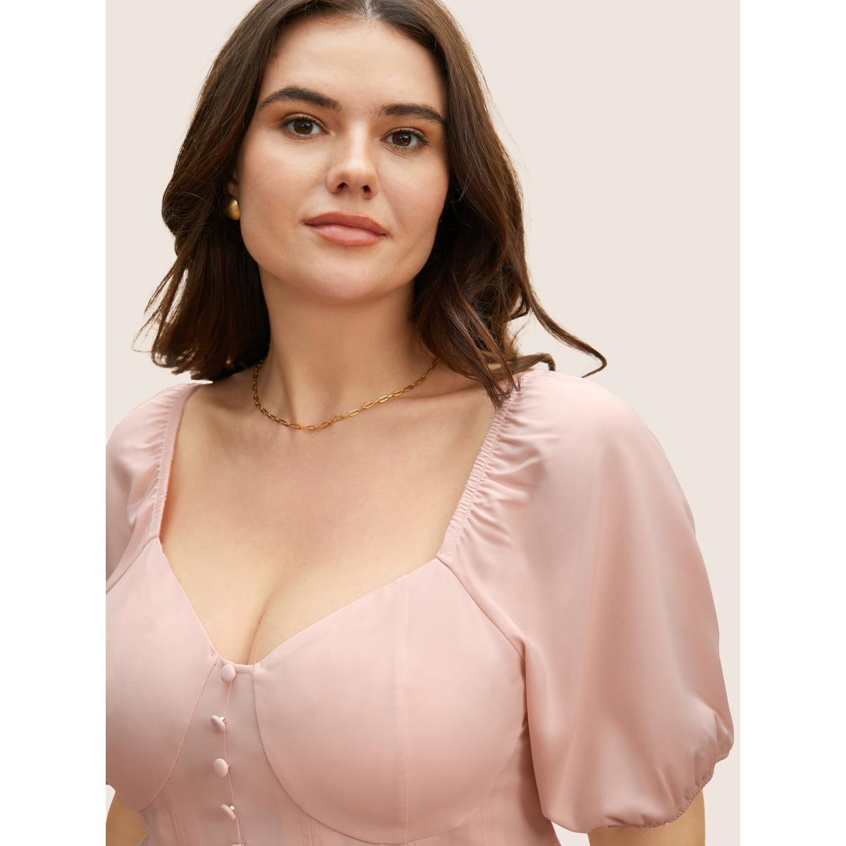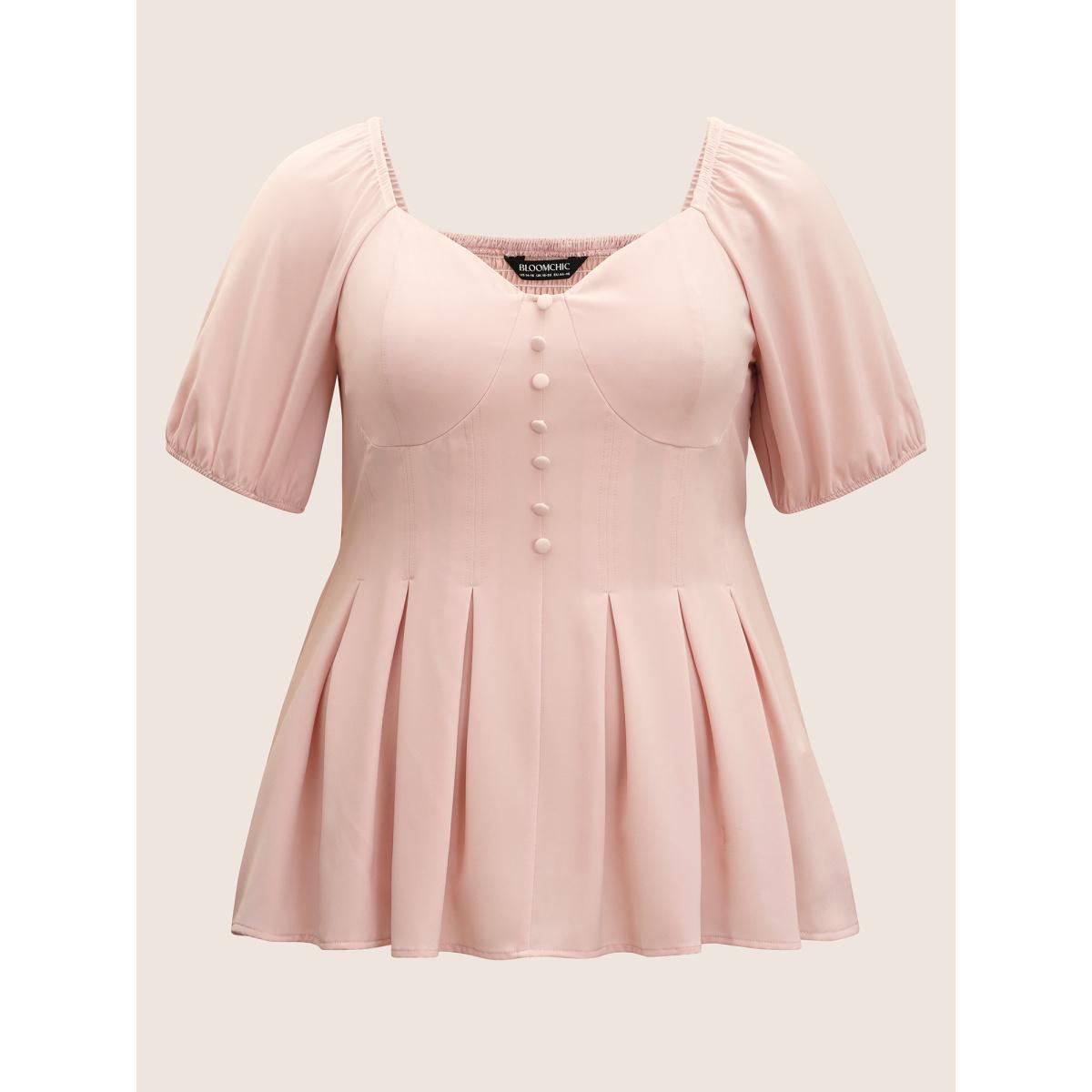 Plus Size MistyRose Solid Heart Neckline Pleated Button Detail Blouse Women Elegant Short sleeve Heart neckline Everyday Blouses BloomChic 22-24/3X