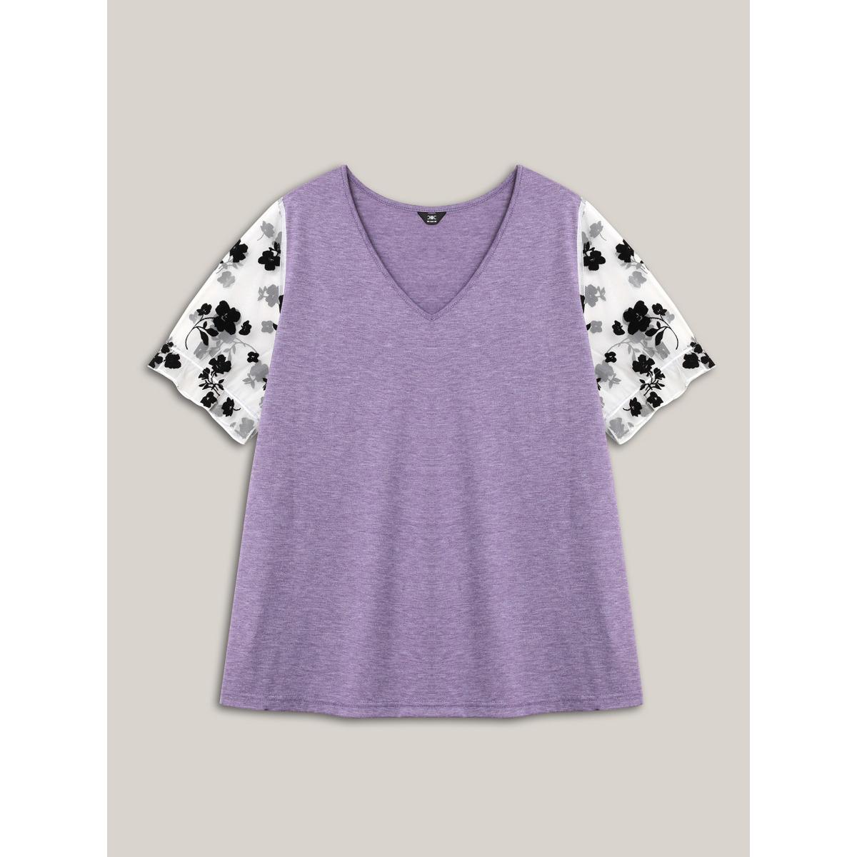 Plus Size Mixed Material Sheer Sleeve T-Shirt Heather Women Casual See through V-neck Everyday T-shirts BloomChic 28/5X Product Image