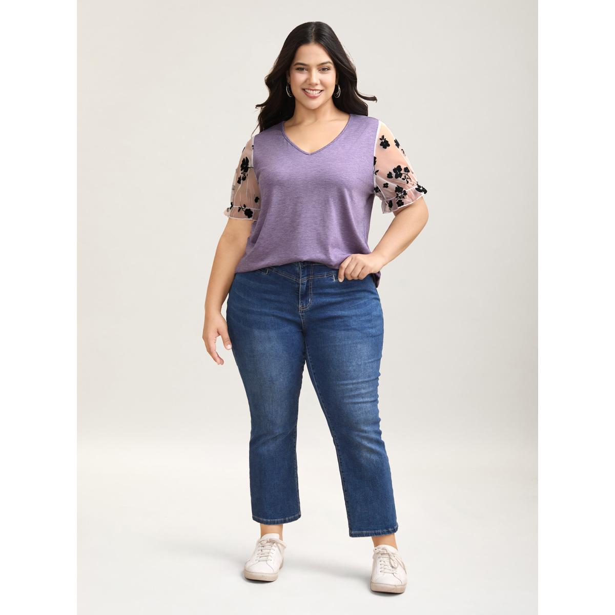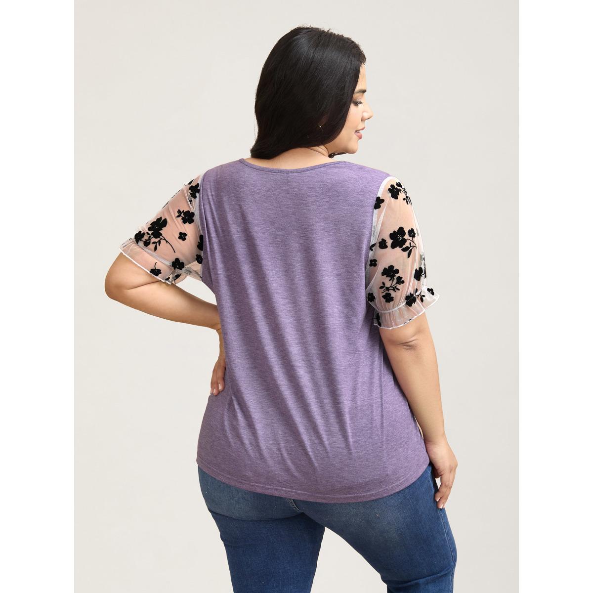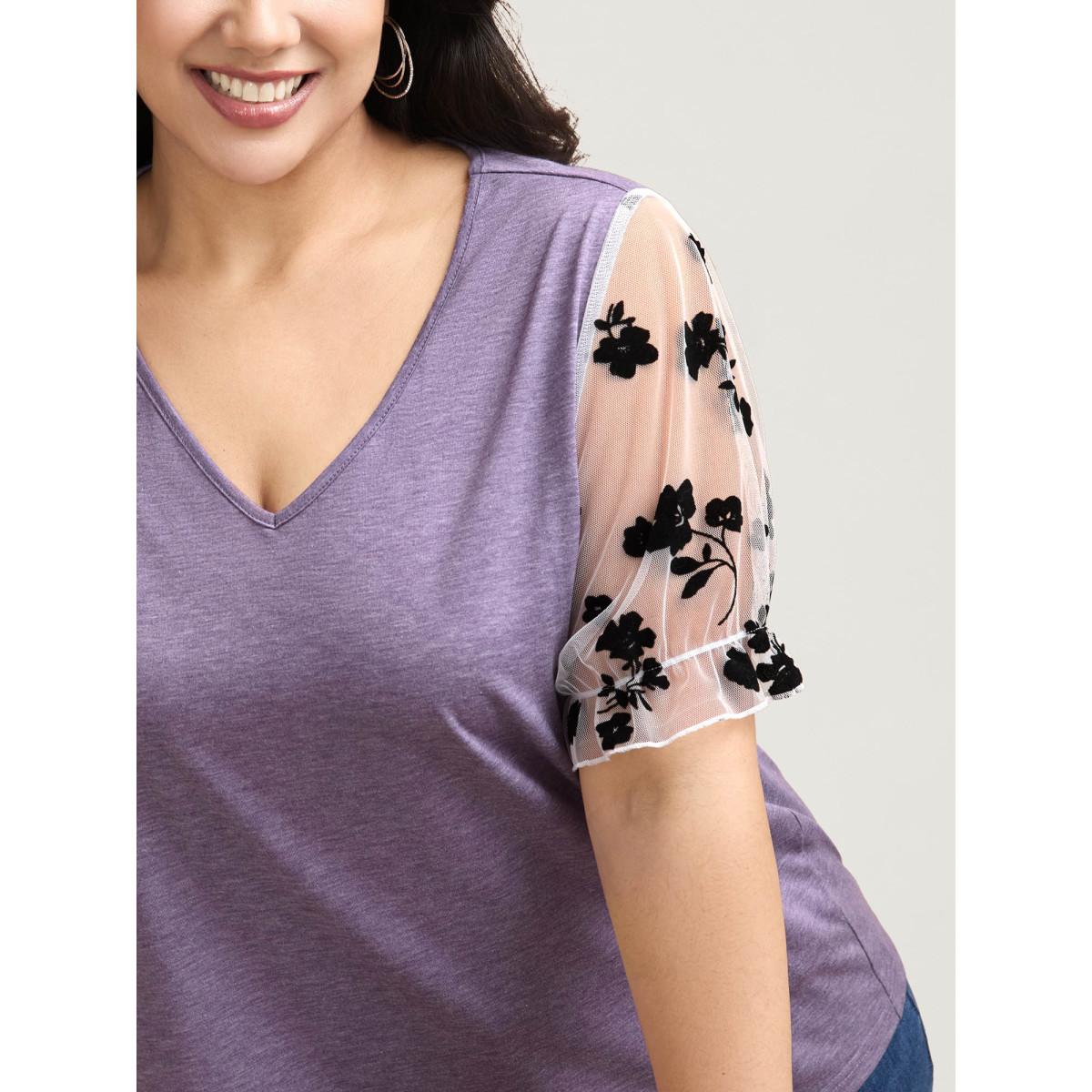 Plus Size Mixed Material Sheer Sleeve T-Shirt Heather Women Casual See through V-neck Everyday T-shirts BloomChic 28/5X