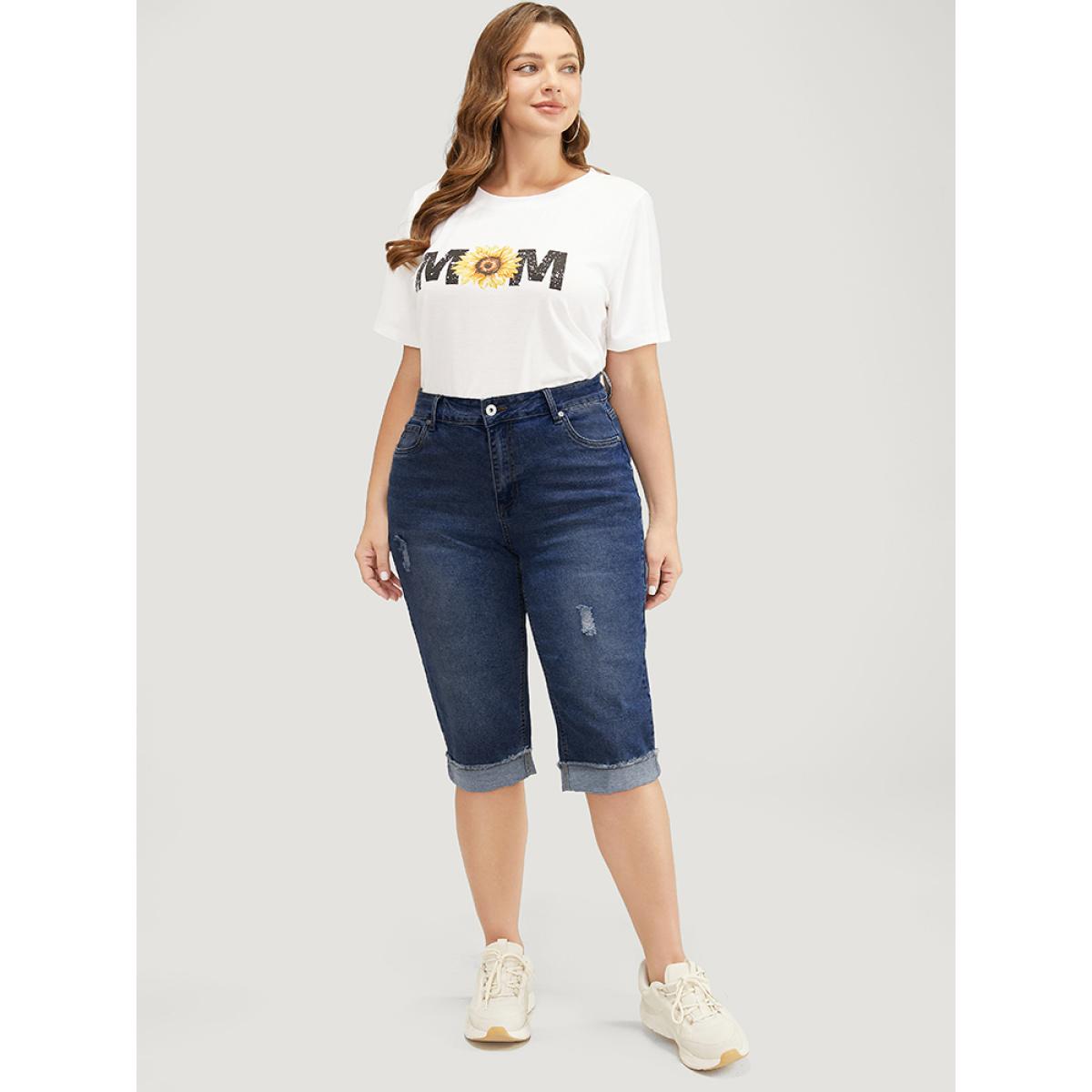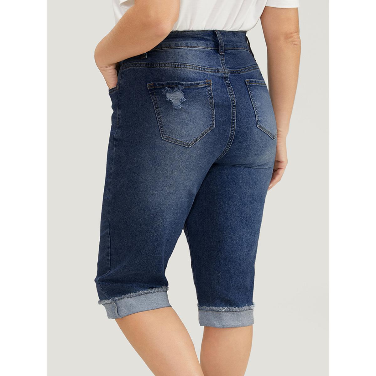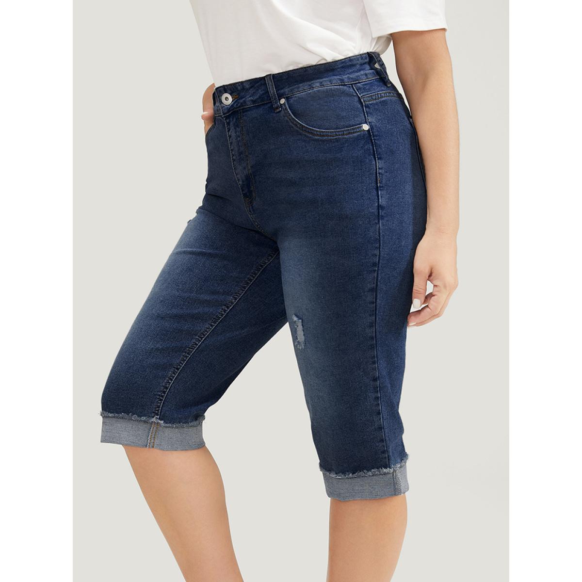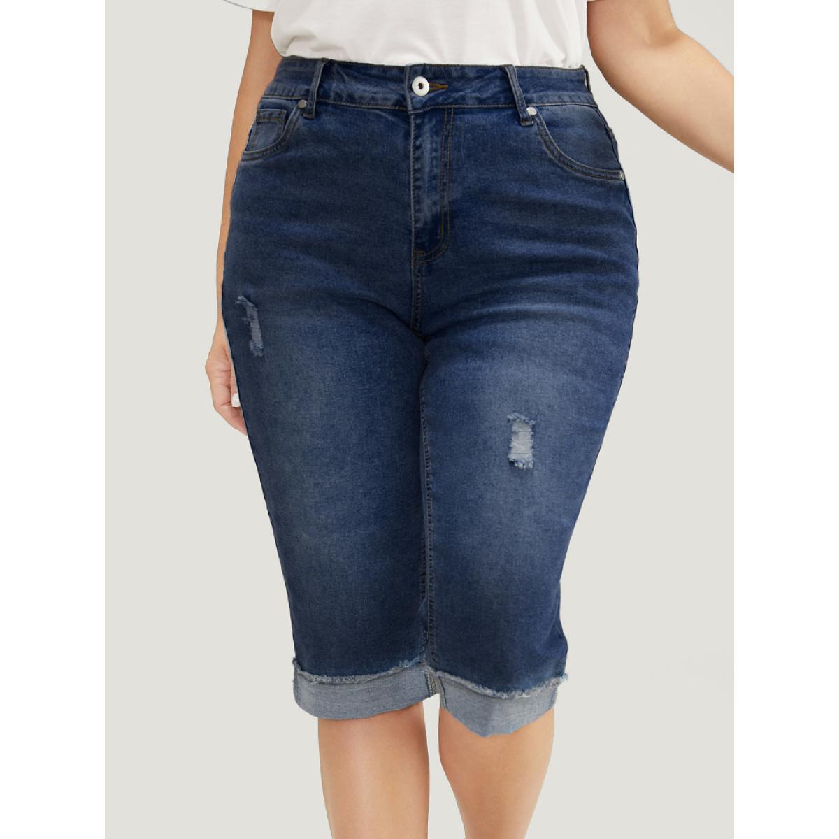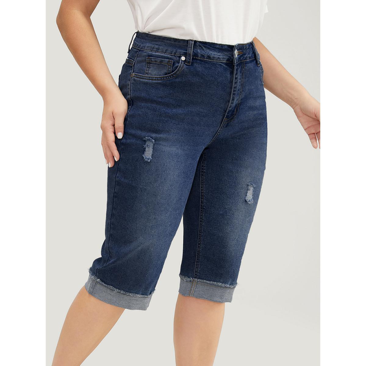 Plus Size Moderately Stretchy Roll Hem Ripped Knee Denim Shorts Women DarkBlue Casual Plain Medium stretch Slanted pocket Jeans BloomChic 16/1X