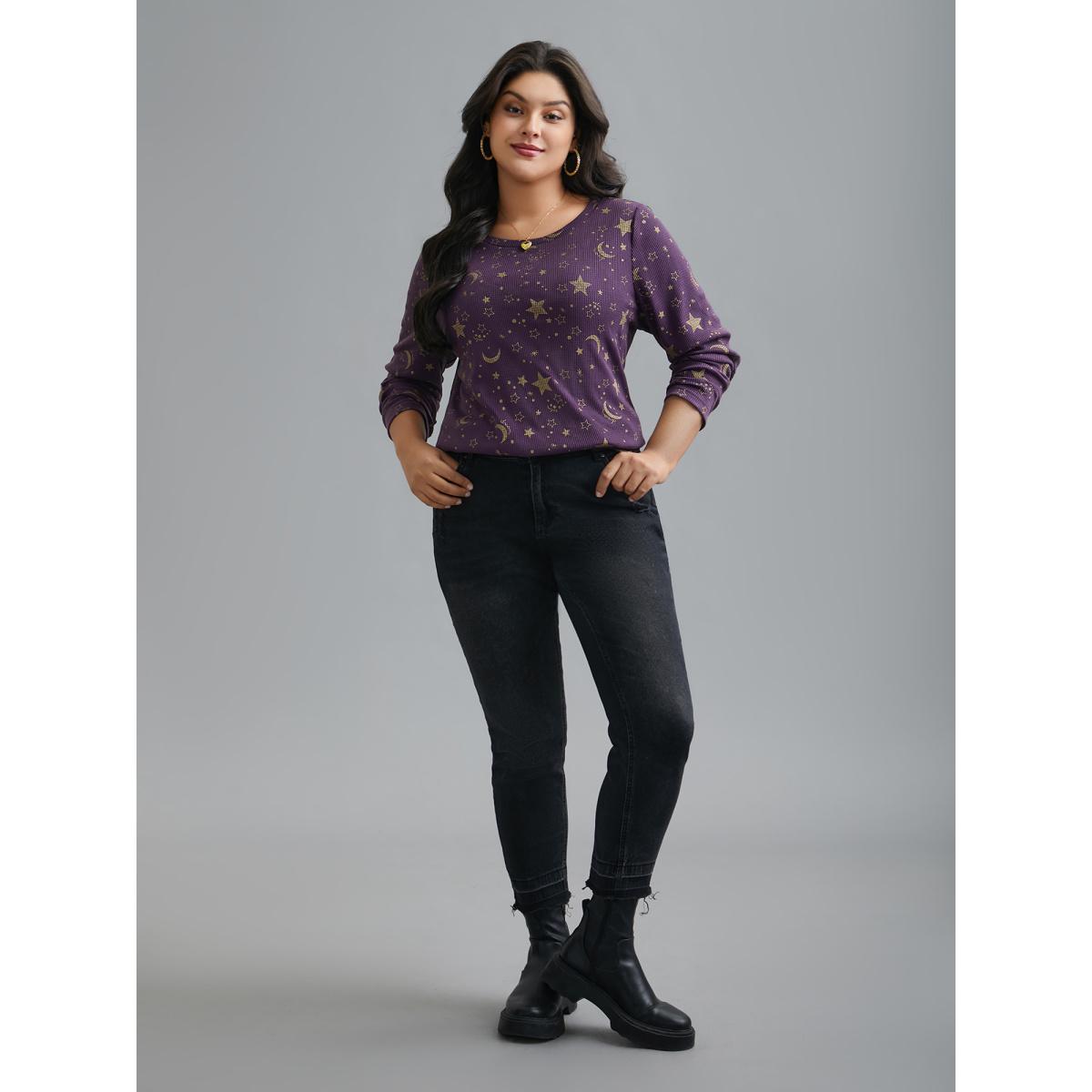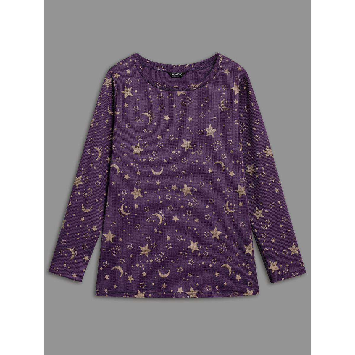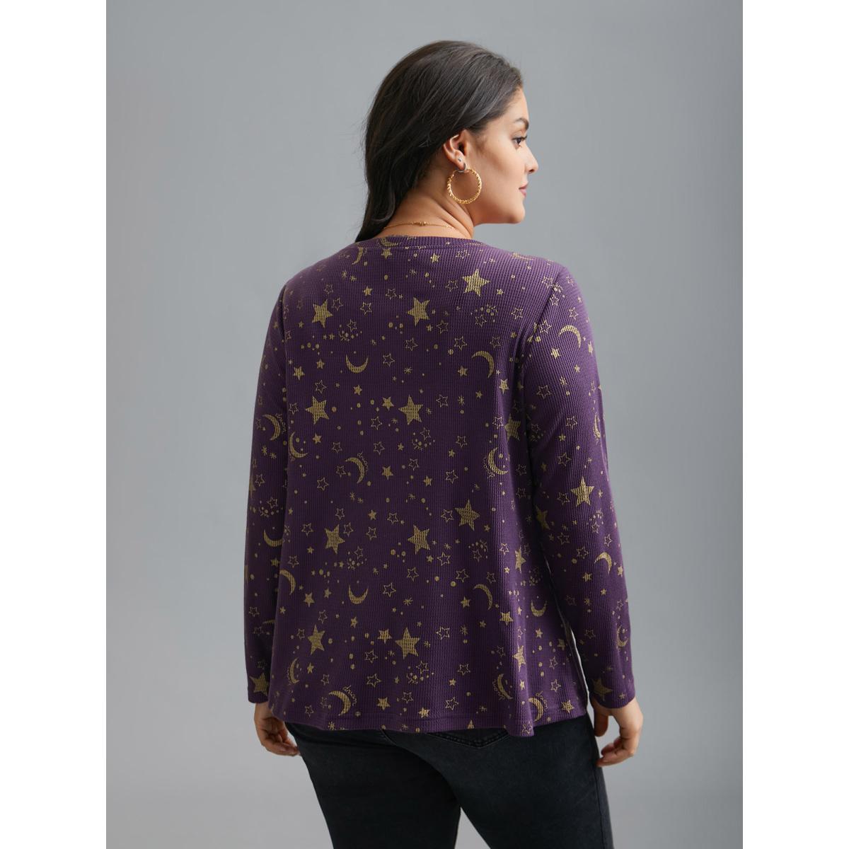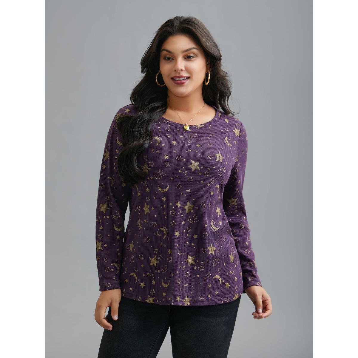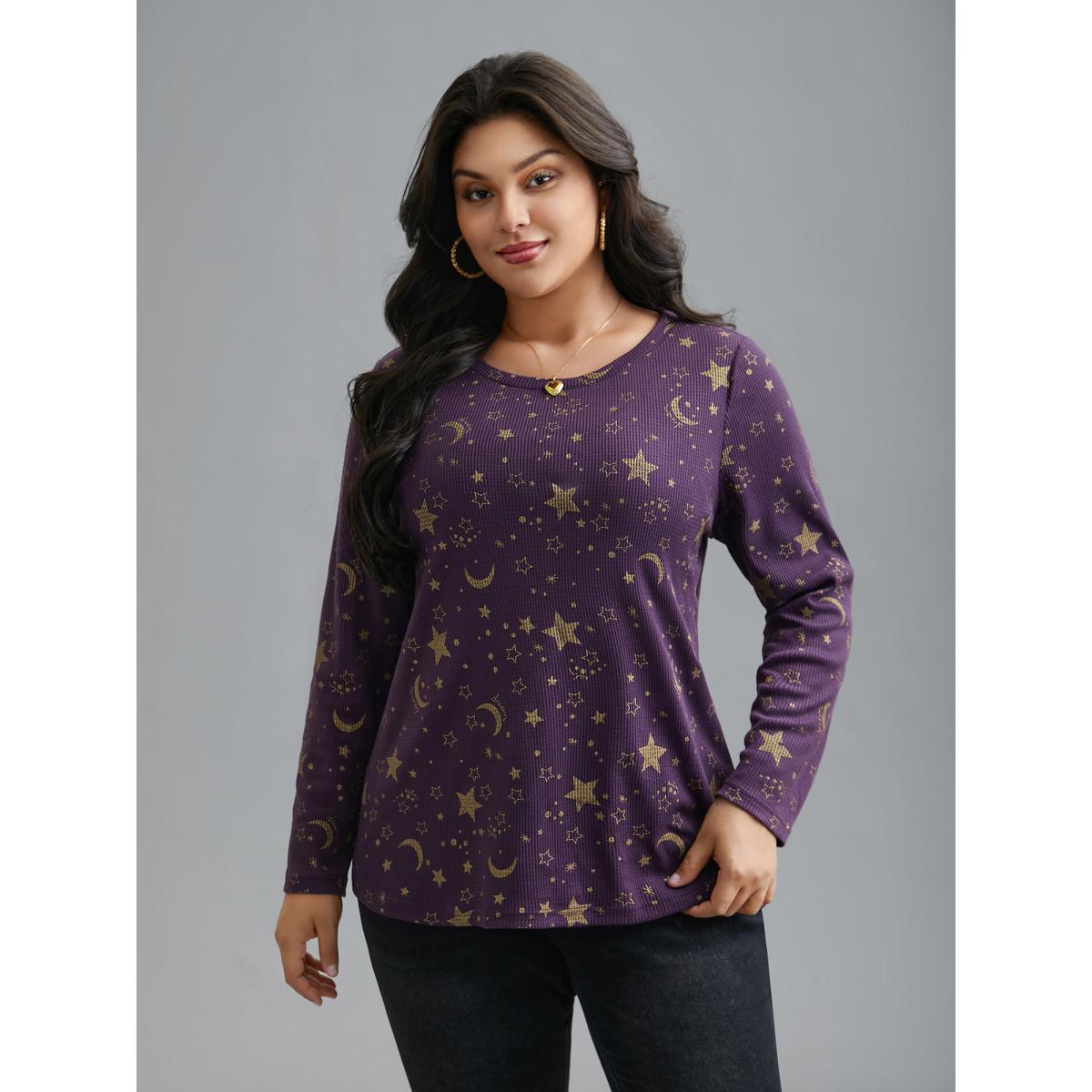 Plus Size Moon and Star Glitter Textured T-Shirt Deeppurple Women Leisure Texture Round Neck Casual T-shirts BloomChic 26/4X