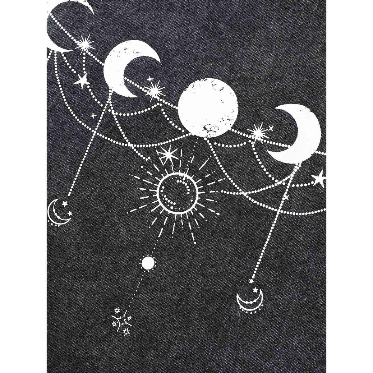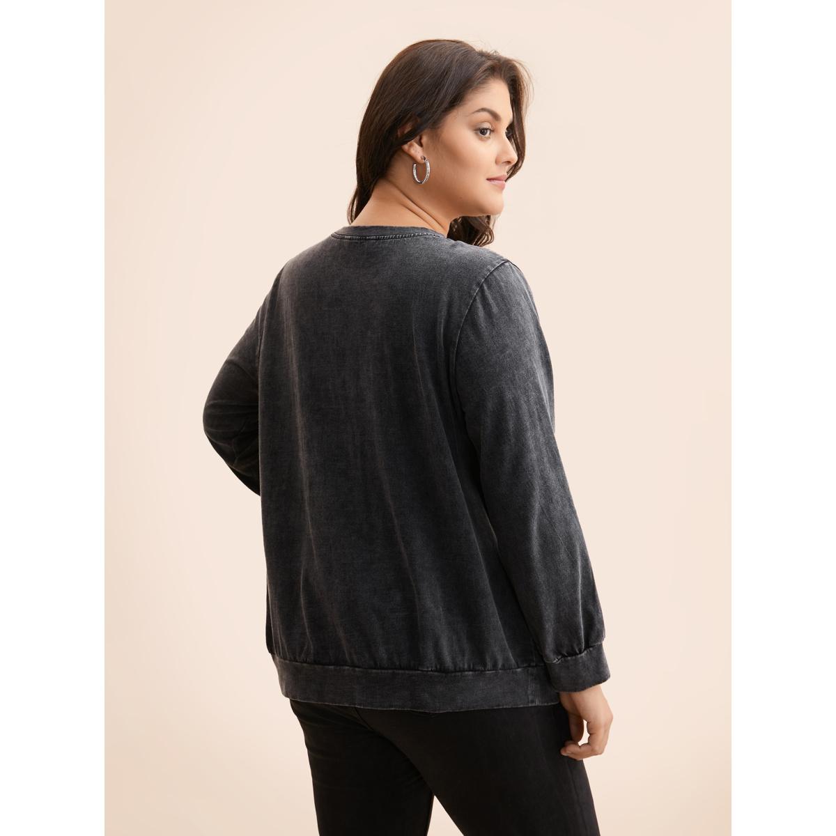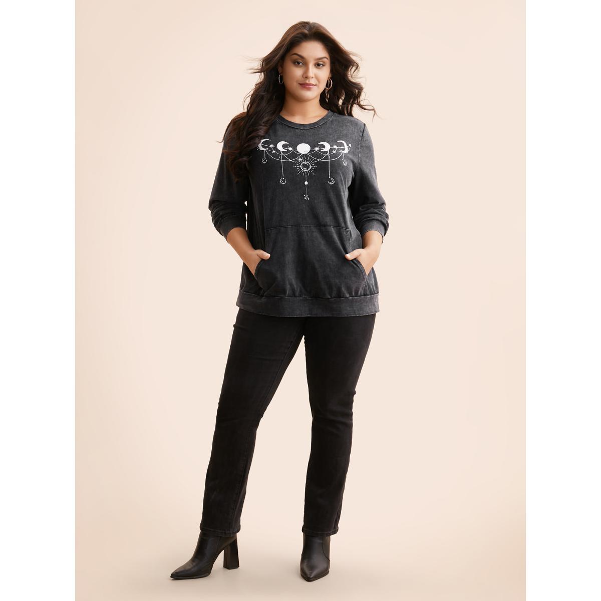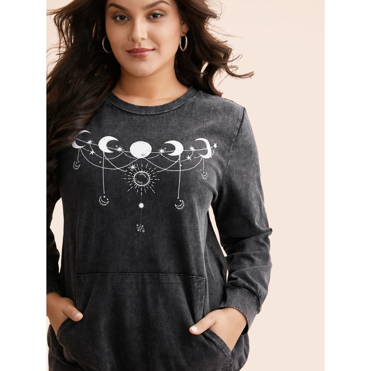 Plus Size Moon & Star Print Vintage Pocket Sweatshirt Women Acidwashblack Casual Non Round Neck Everyday Sweatshirts BloomChic 26/4X