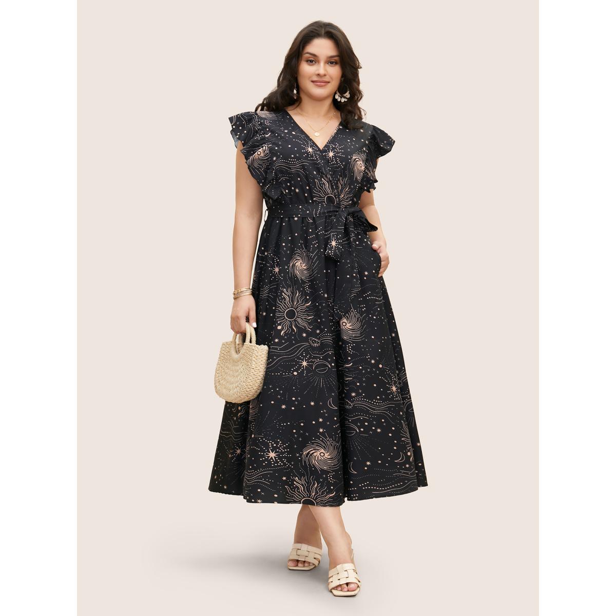 Plus Size Moon & Star Ruffle Cap Sleeve Maxi Dress Black Women Resort Belted Overlap Collar Cap Sleeve Curvy BloomChic 12/L
