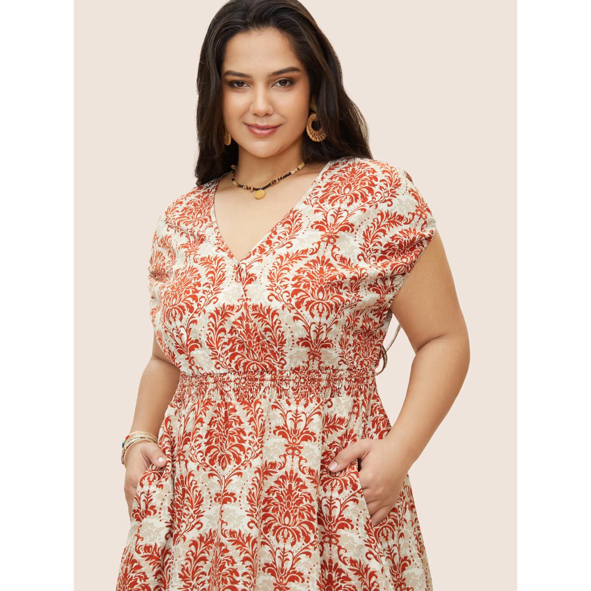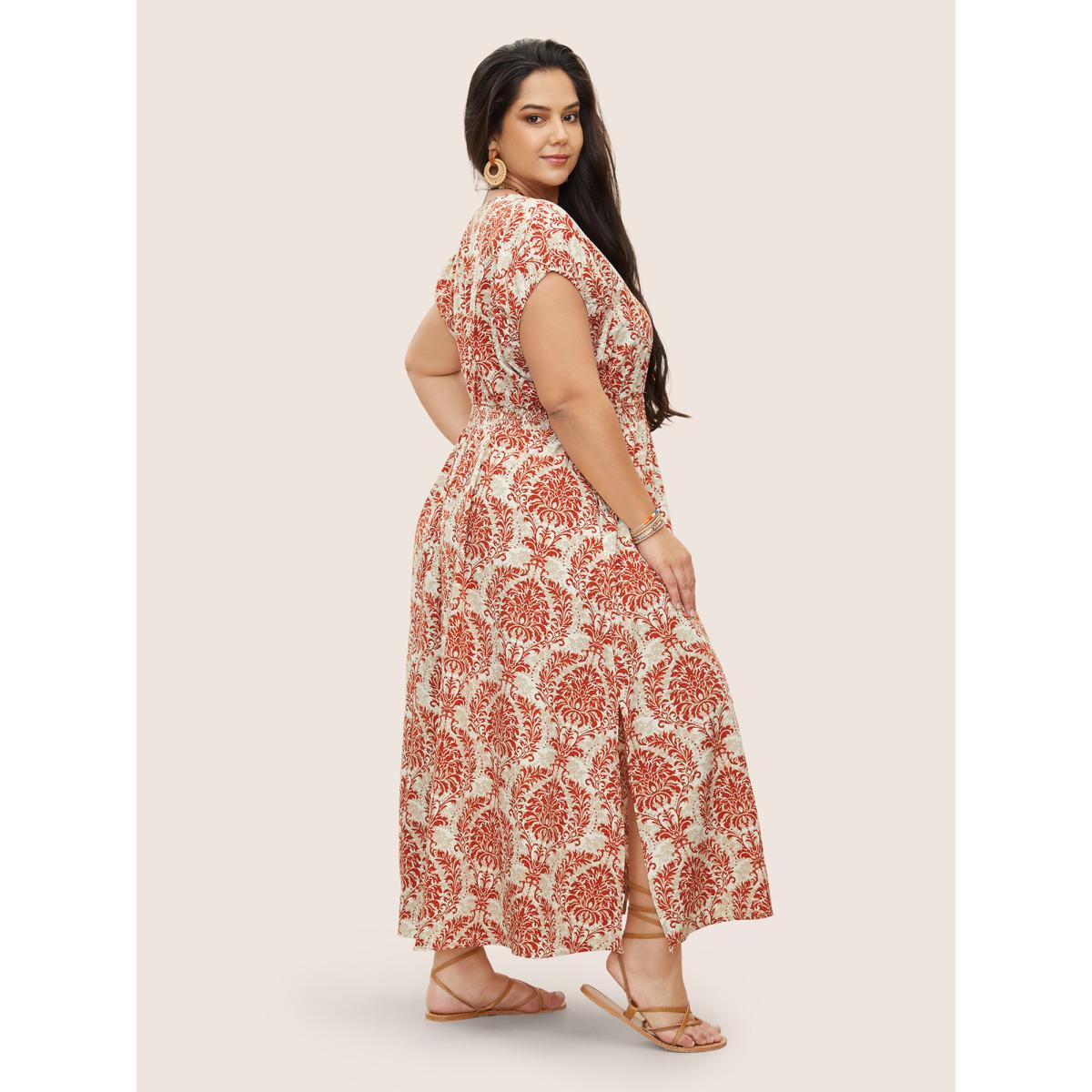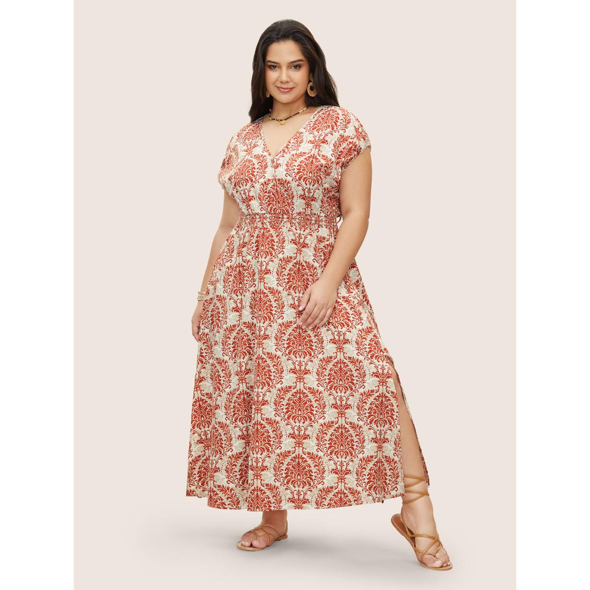 Plus Size Moroccan Print Shirred Slit Hem Dress Red Women Resort Slit V-neck Cap Sleeve Curvy Long Dress BloomChic 26/4X