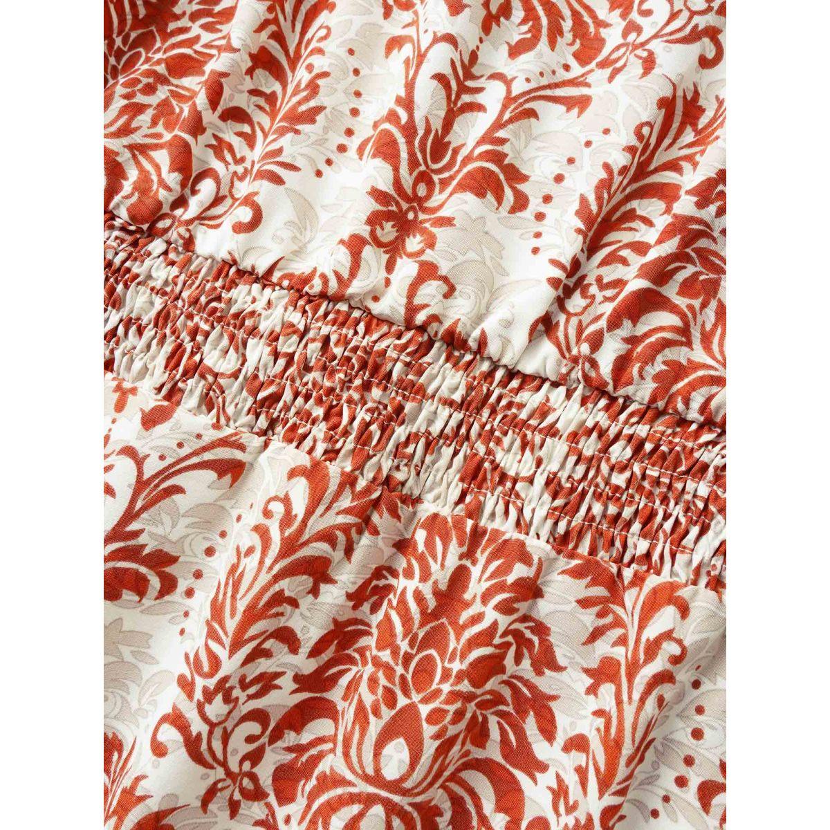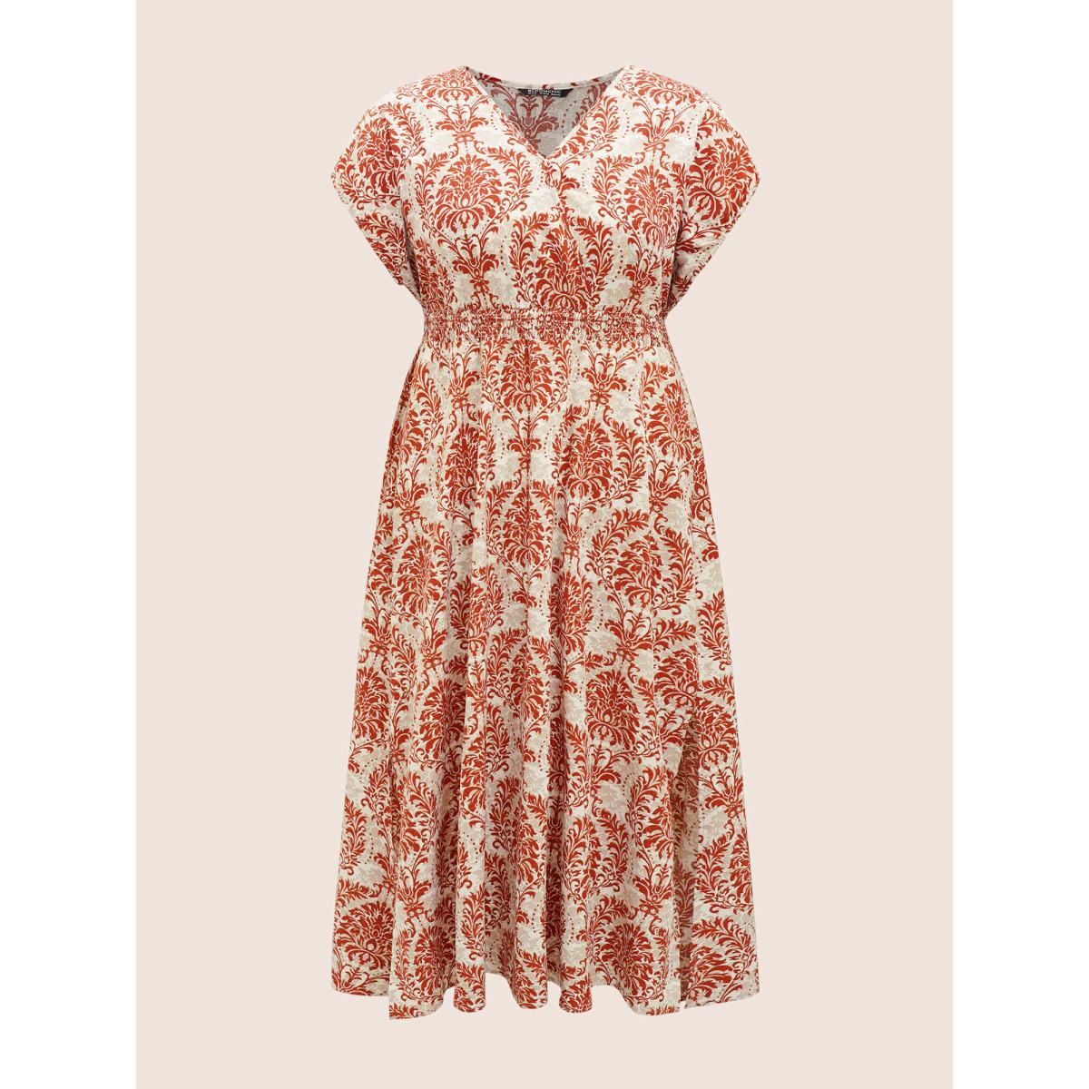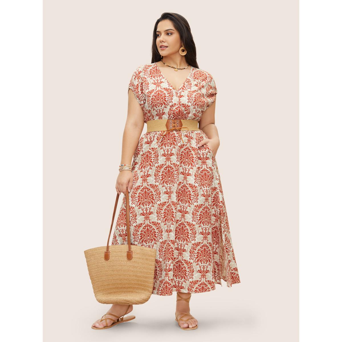 Plus Size Moroccan Print Shirred Slit Hem Dress Red Women Resort Slit V-neck Cap Sleeve Curvy Long Dress BloomChic 26/4X