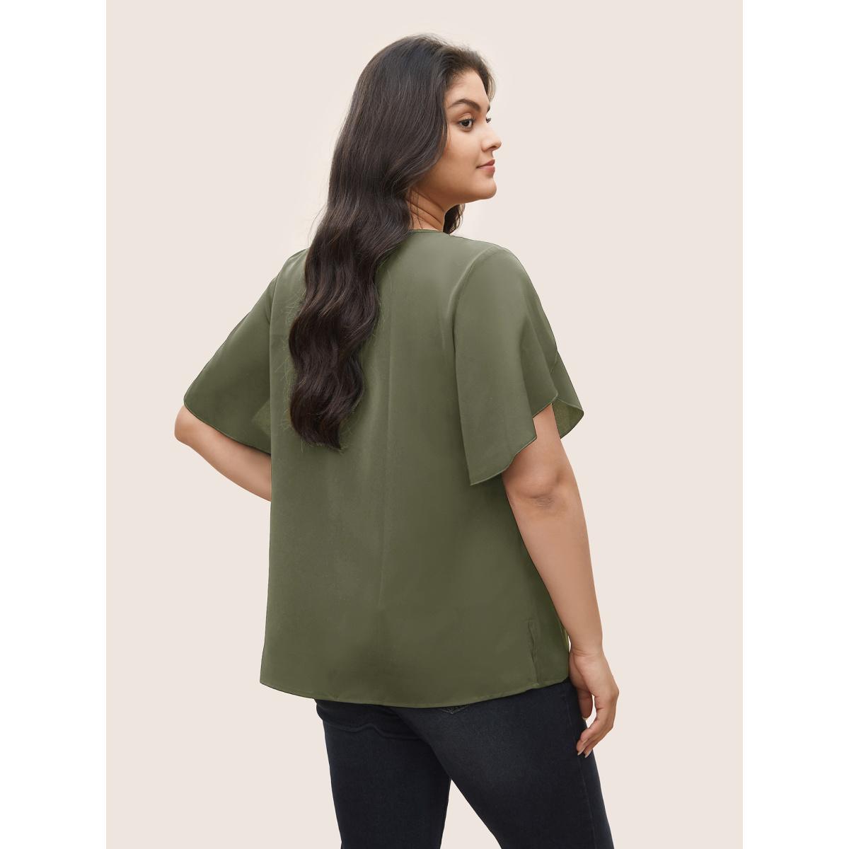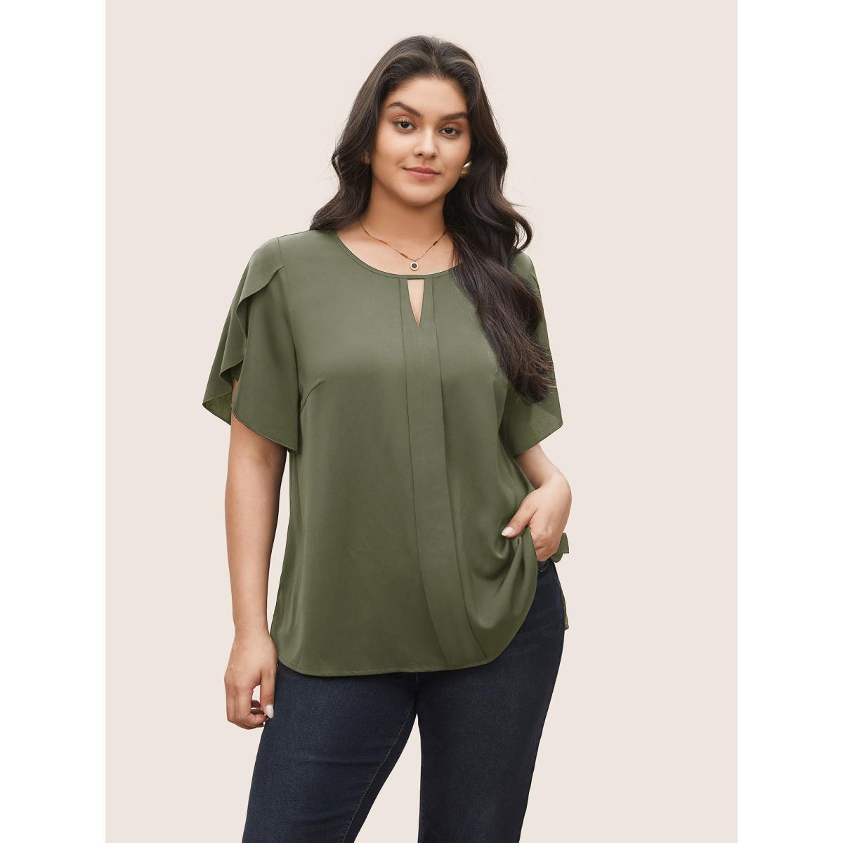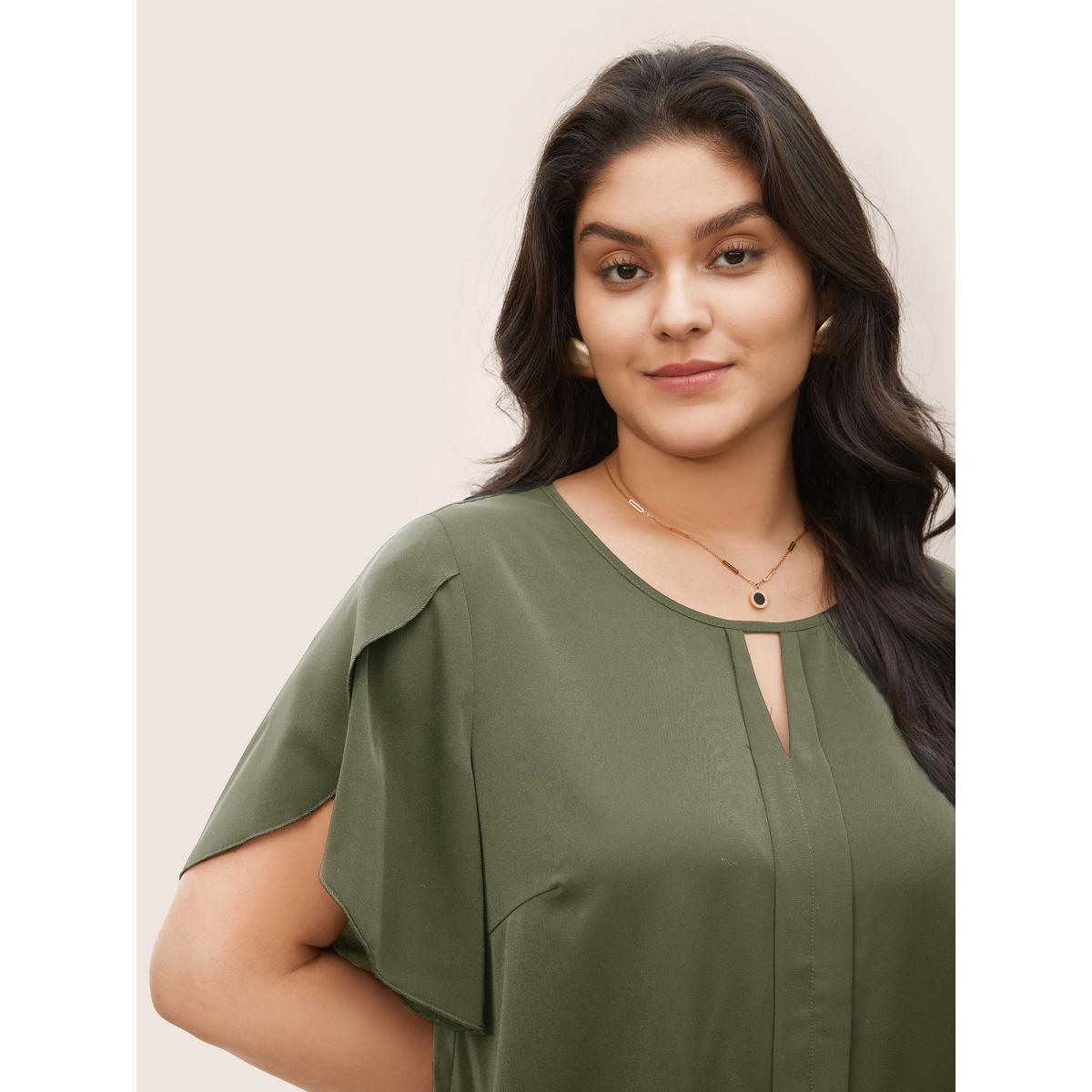 Plus Size Moss Solid Keyhole Petal Sleeve Pleated Blouse Women Work From Home Short sleeve Notched collar Work Blouses BloomChic 14-16/1X