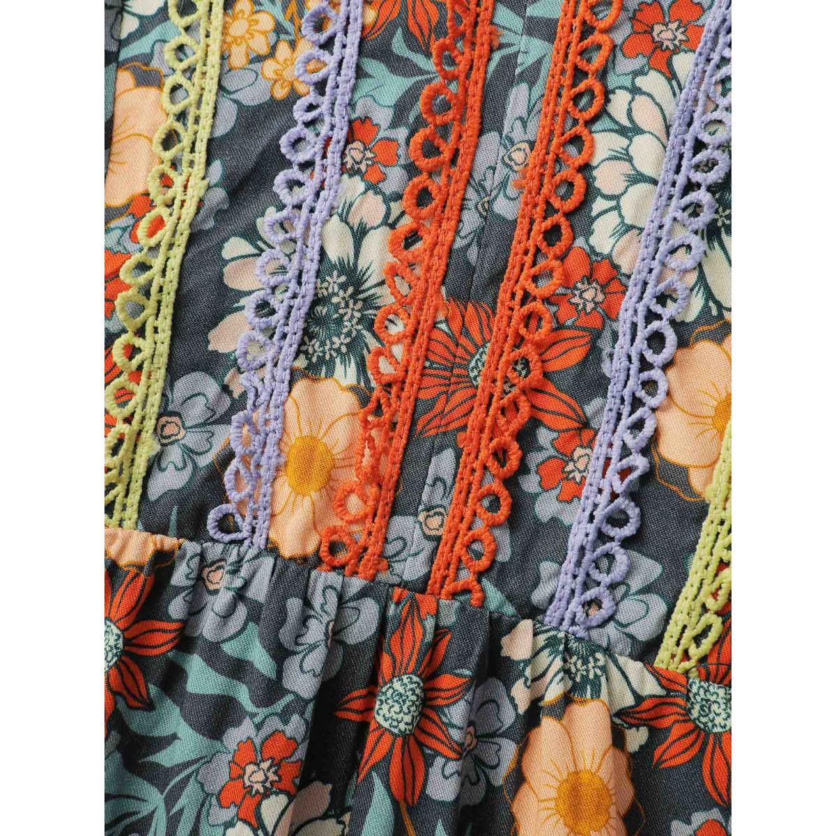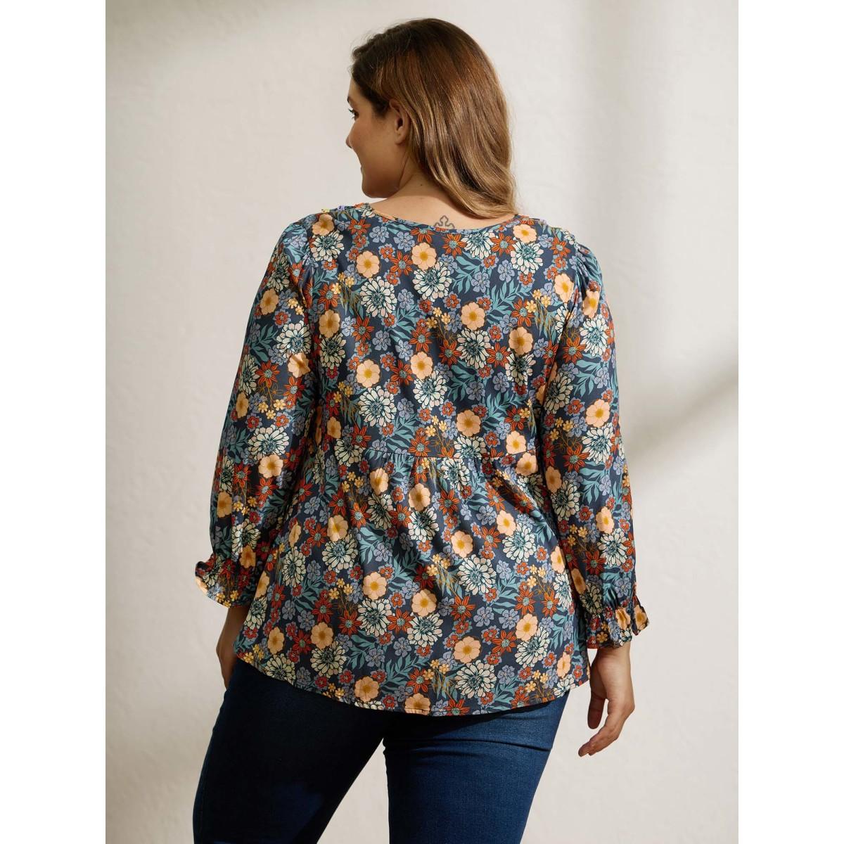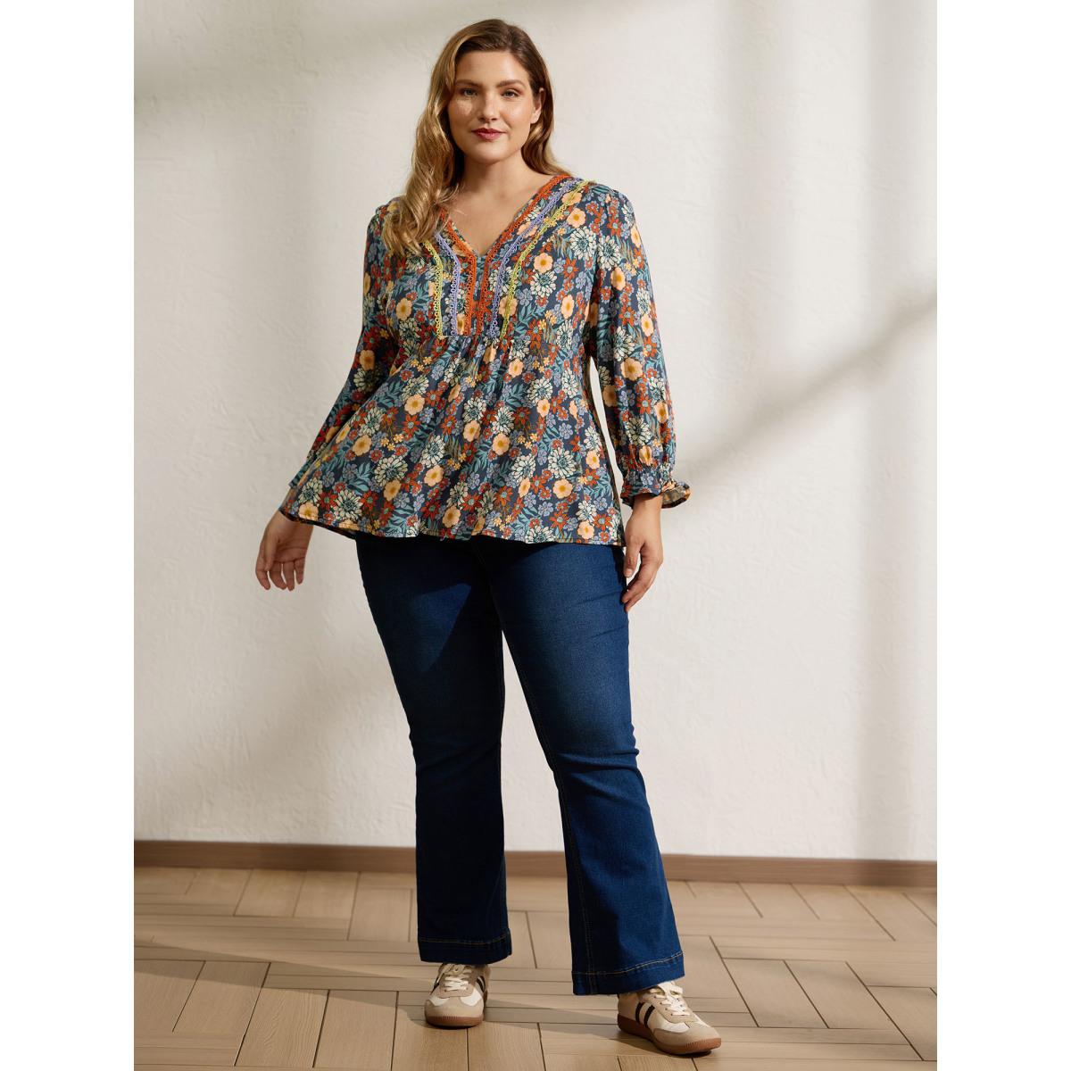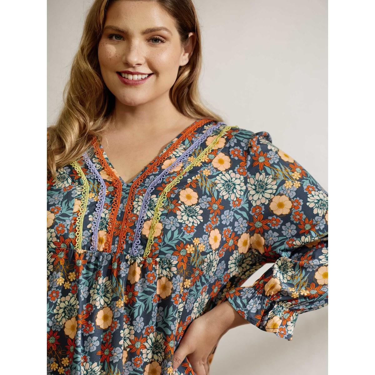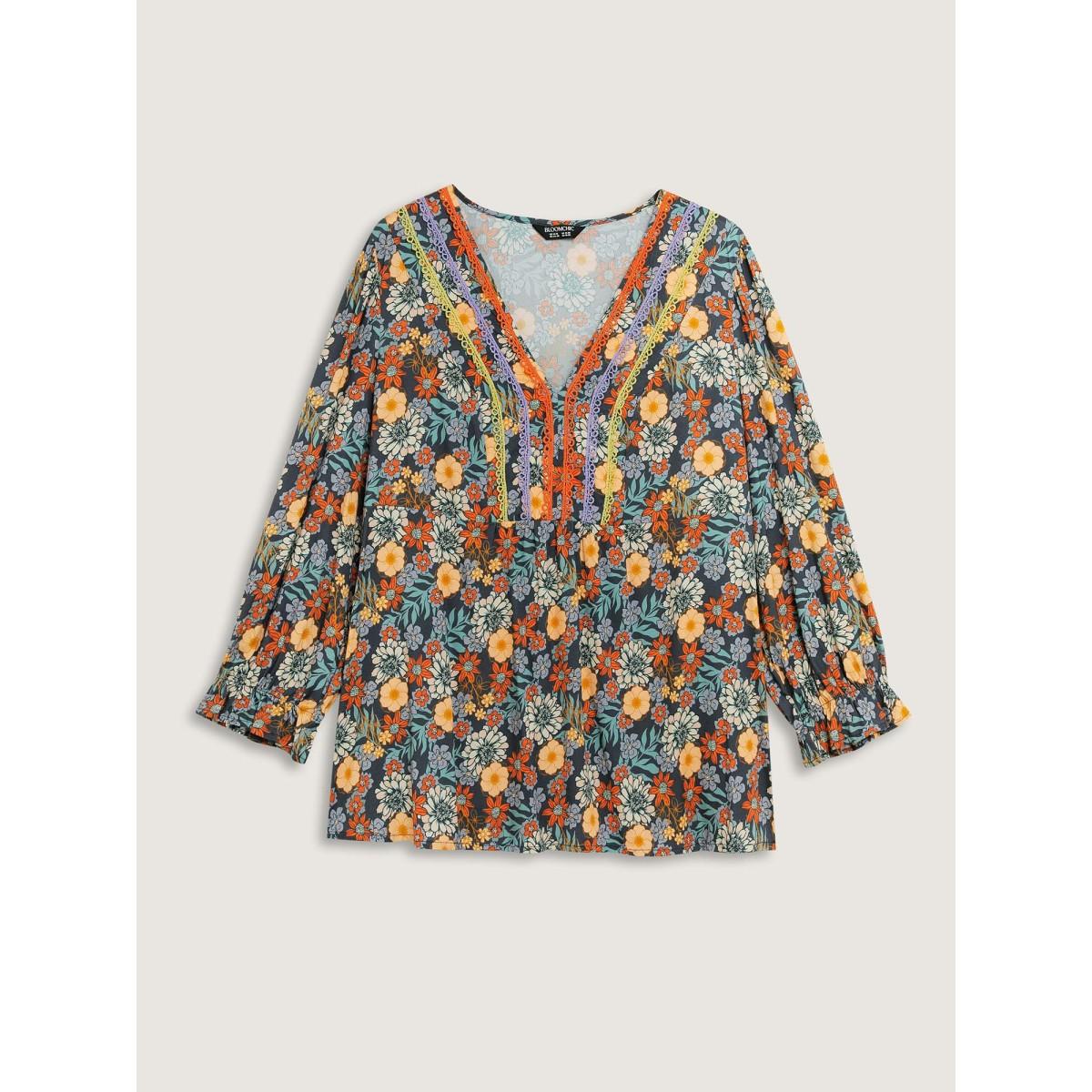 Plus Size Multicolor Cozy Floral Print Lace Trim Blouse Women Leisure Three Quarter Length Sleeve V-neck Casual Blouses BloomChic 14-16/1X