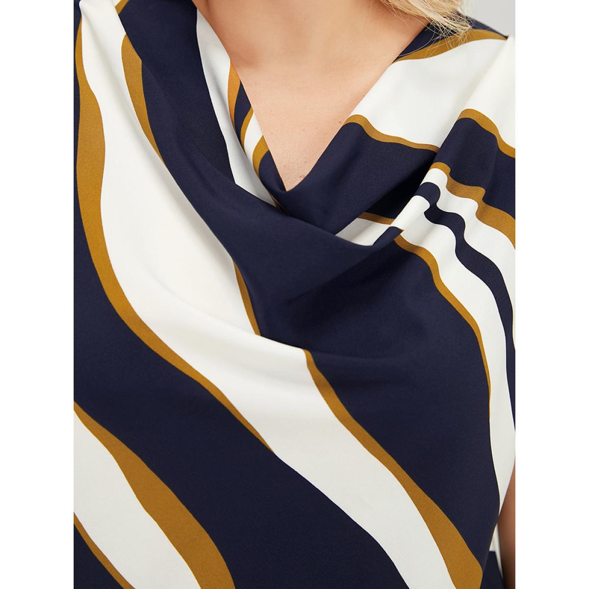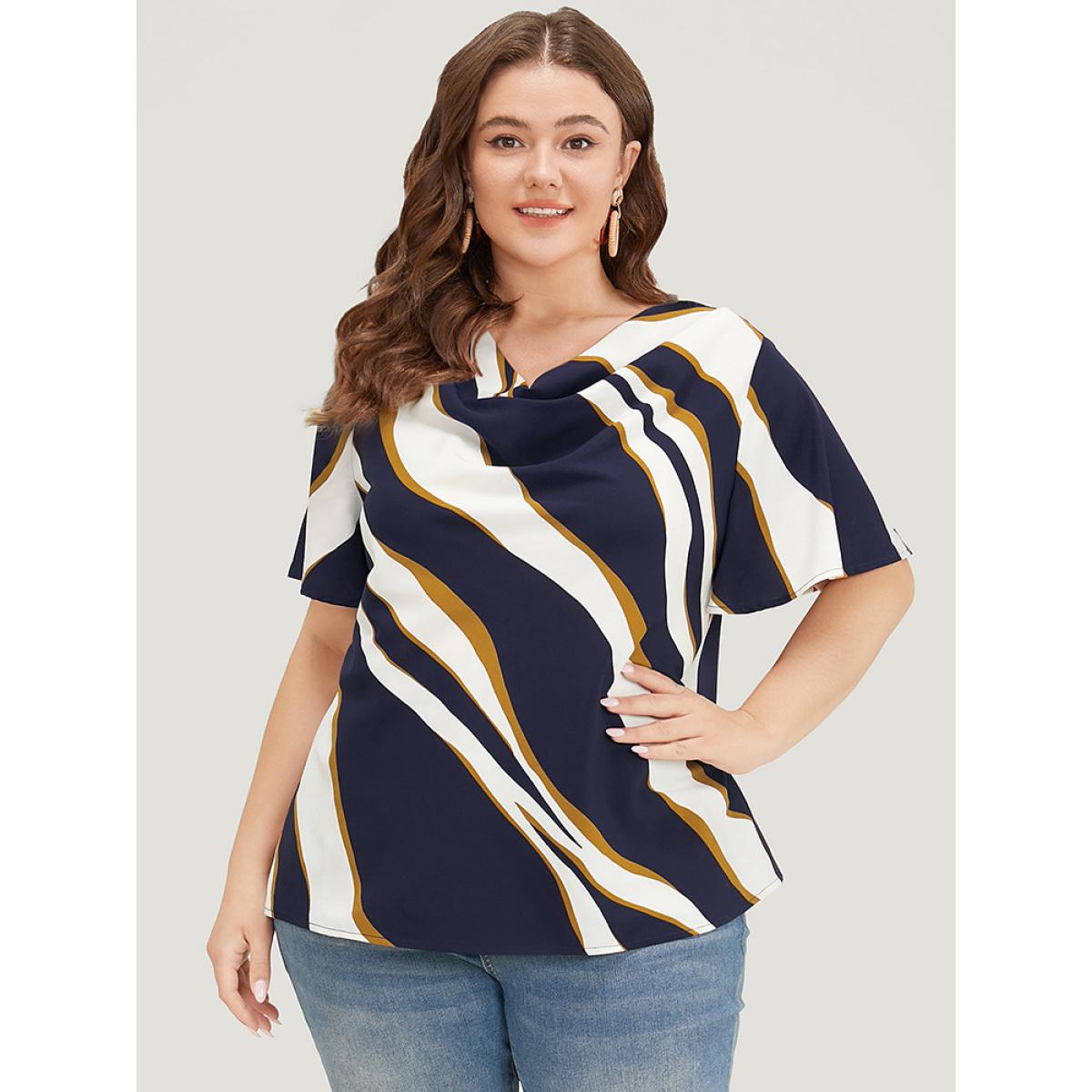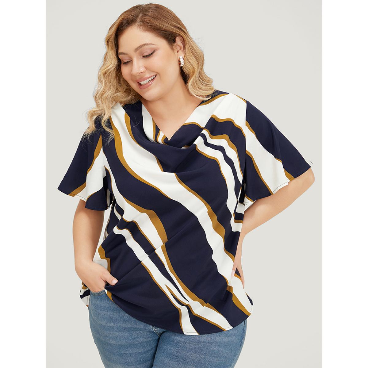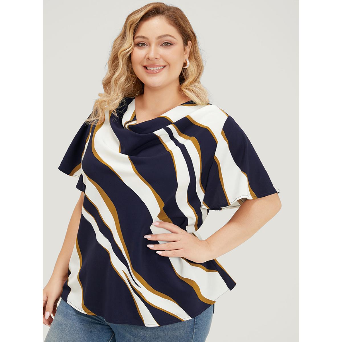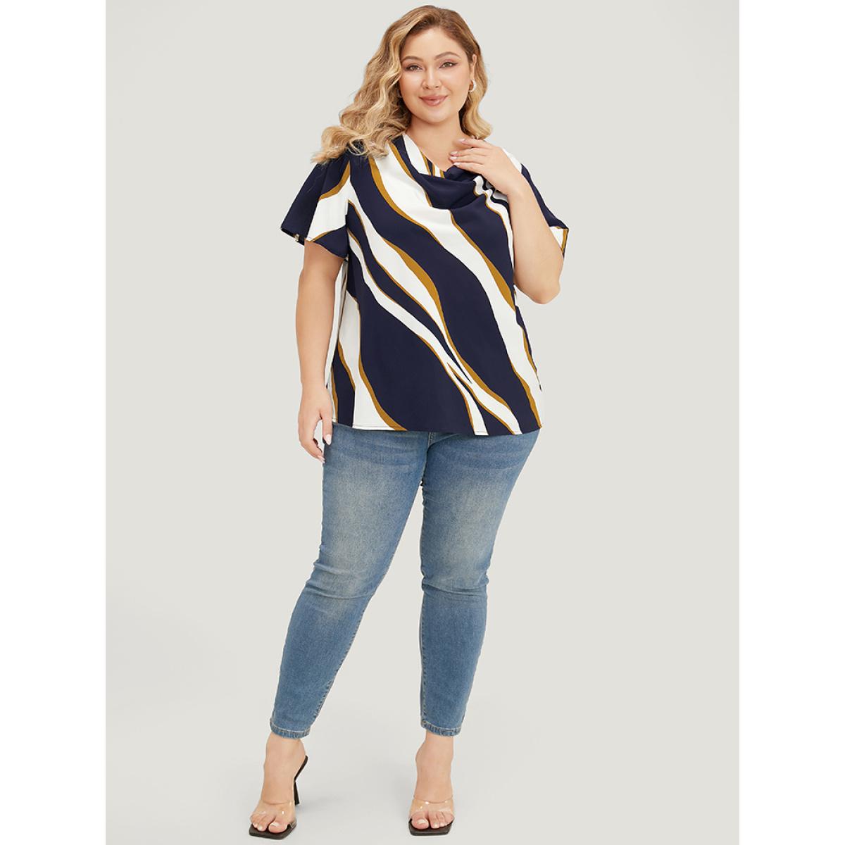 Plus Size Multicolor Geometric Contrast Cowl Neck Ruffle Sleeve Blouse Women Office Short sleeve Cowl Neck Work Blouses BloomChic 30/6X