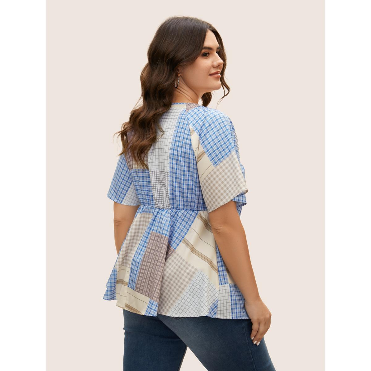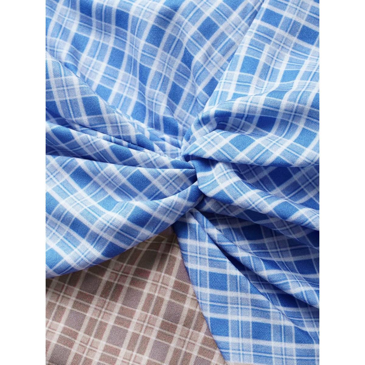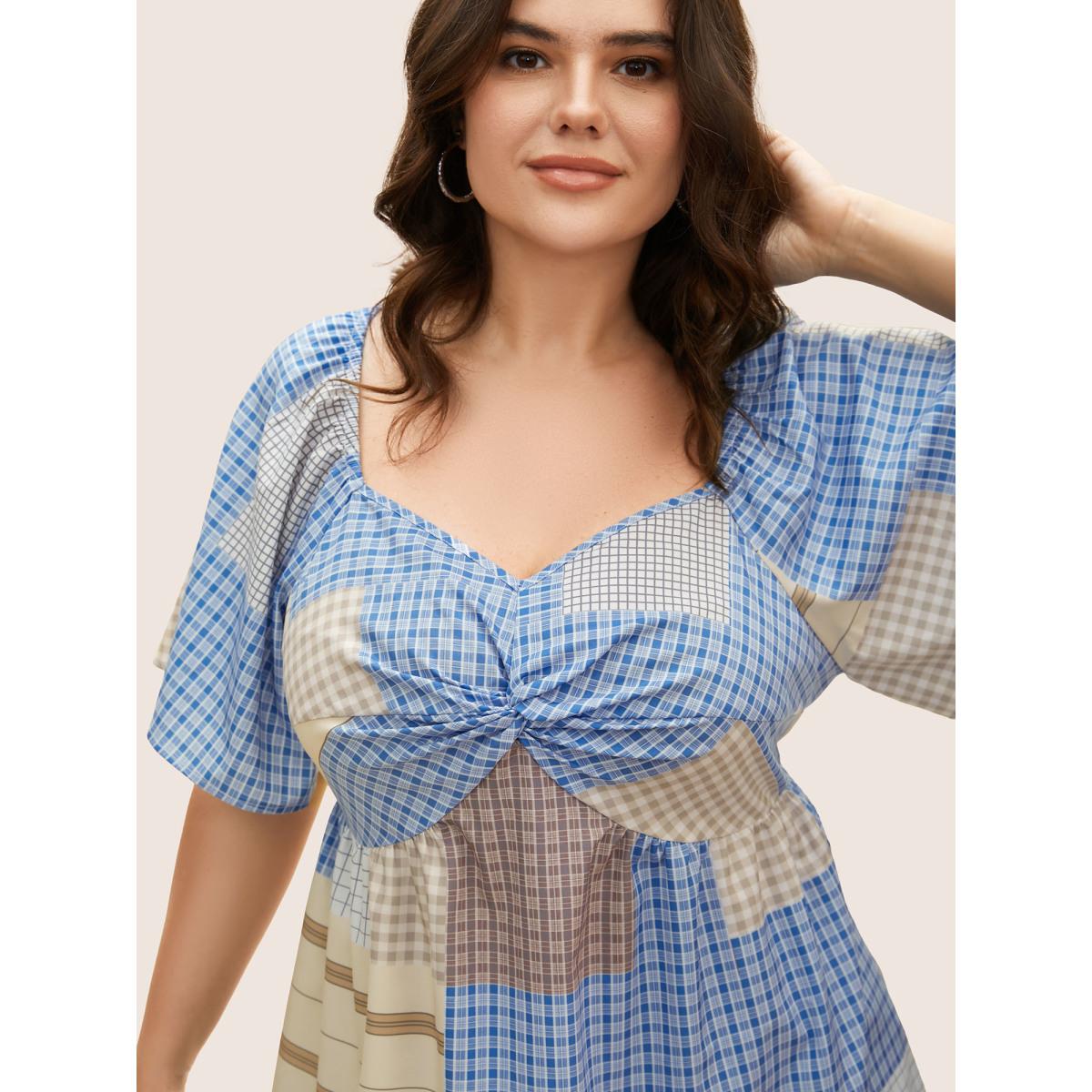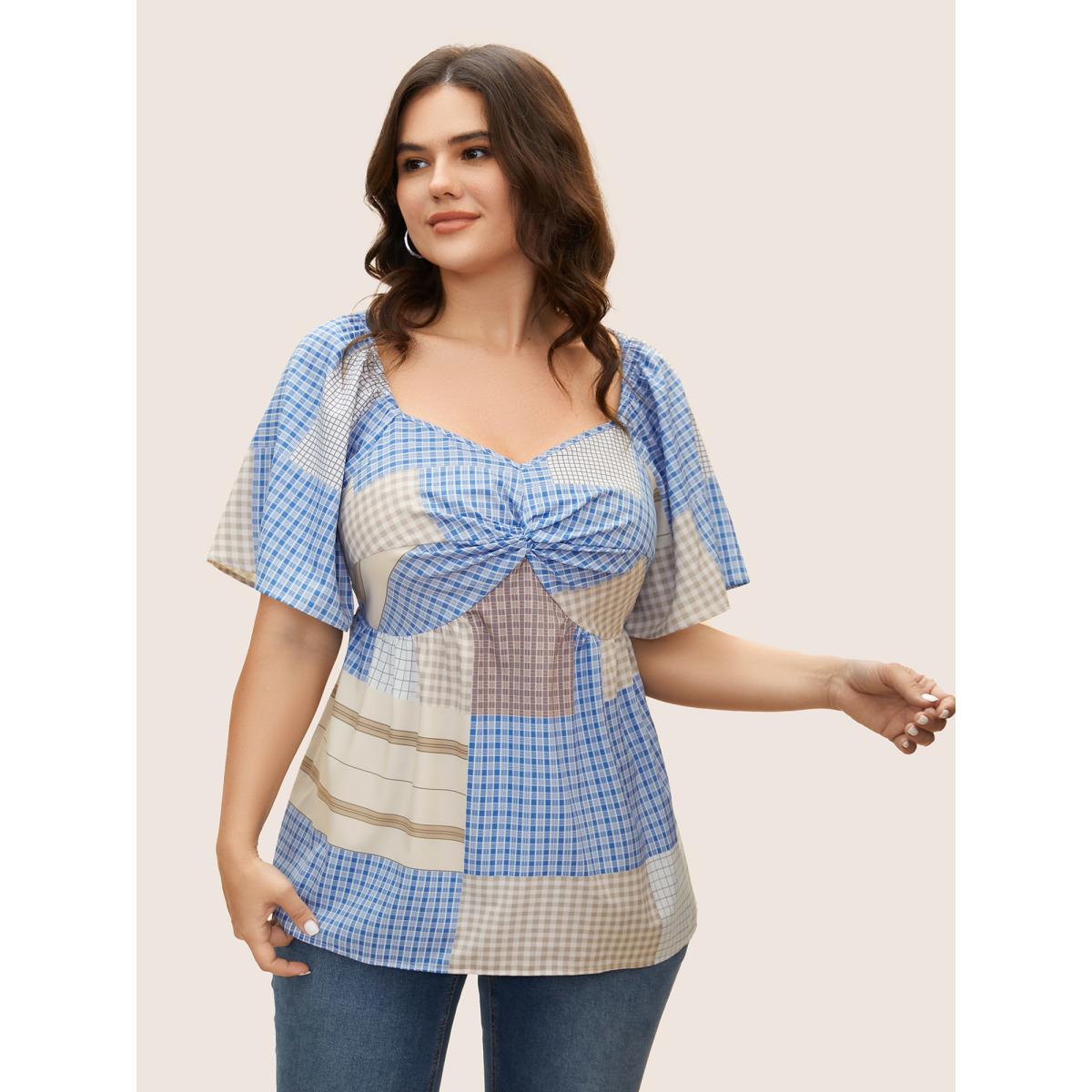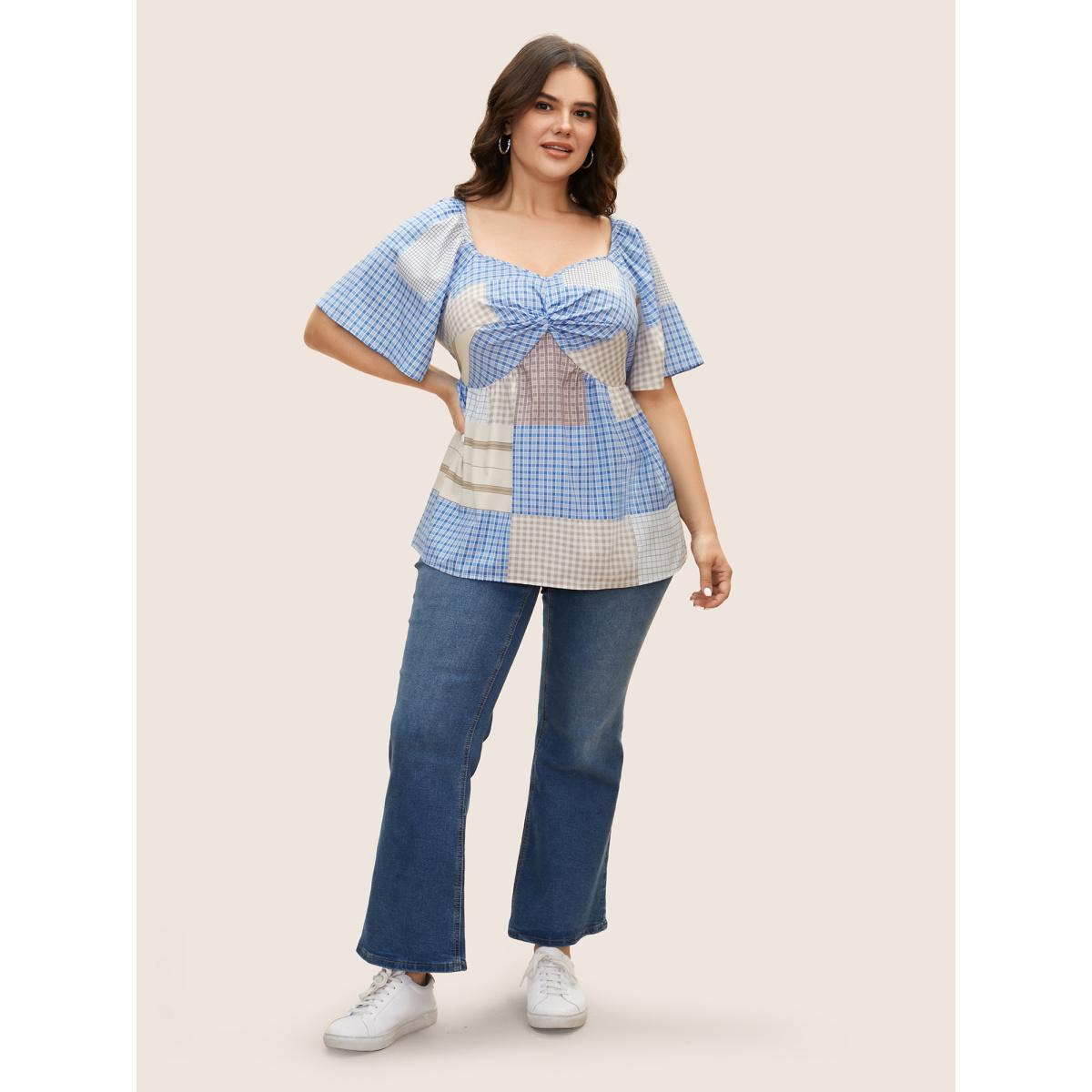 Plus Size Multicolor Heart Neckline Contrast Gingham Twist Front Blouse Women Casual Short sleeve Heart neckline Everyday Blouses BloomChic 14-16/1X