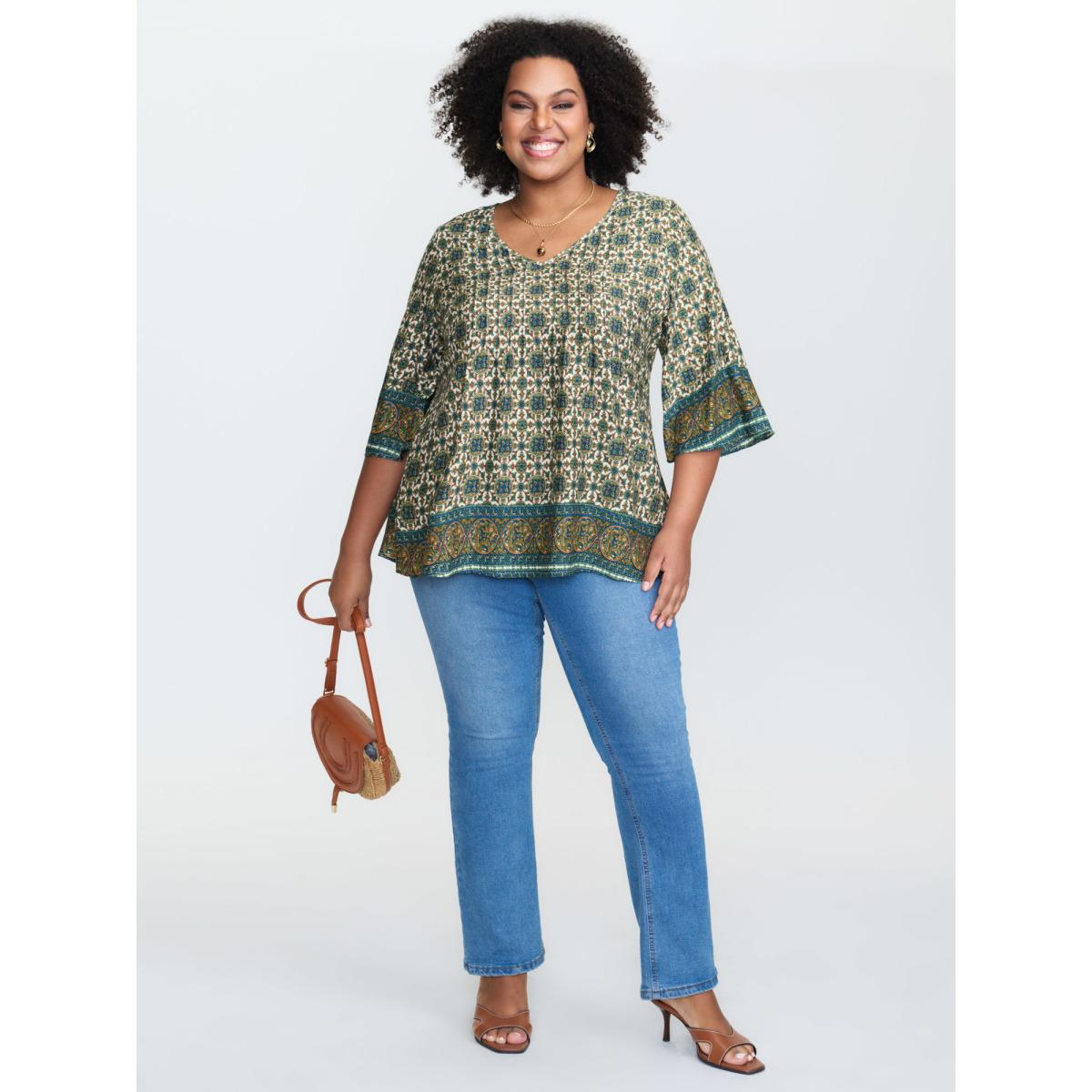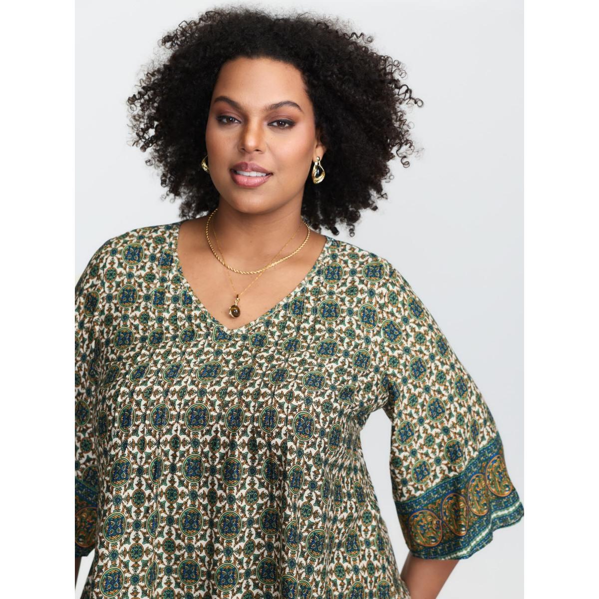 Plus Size Multicolor Pin-Tuck Pleat Ornate Print Relaxed Fit Shirt Women Boho Elbow-length sleeve V-neck Vacation Blouses BloomChic 26/4X
