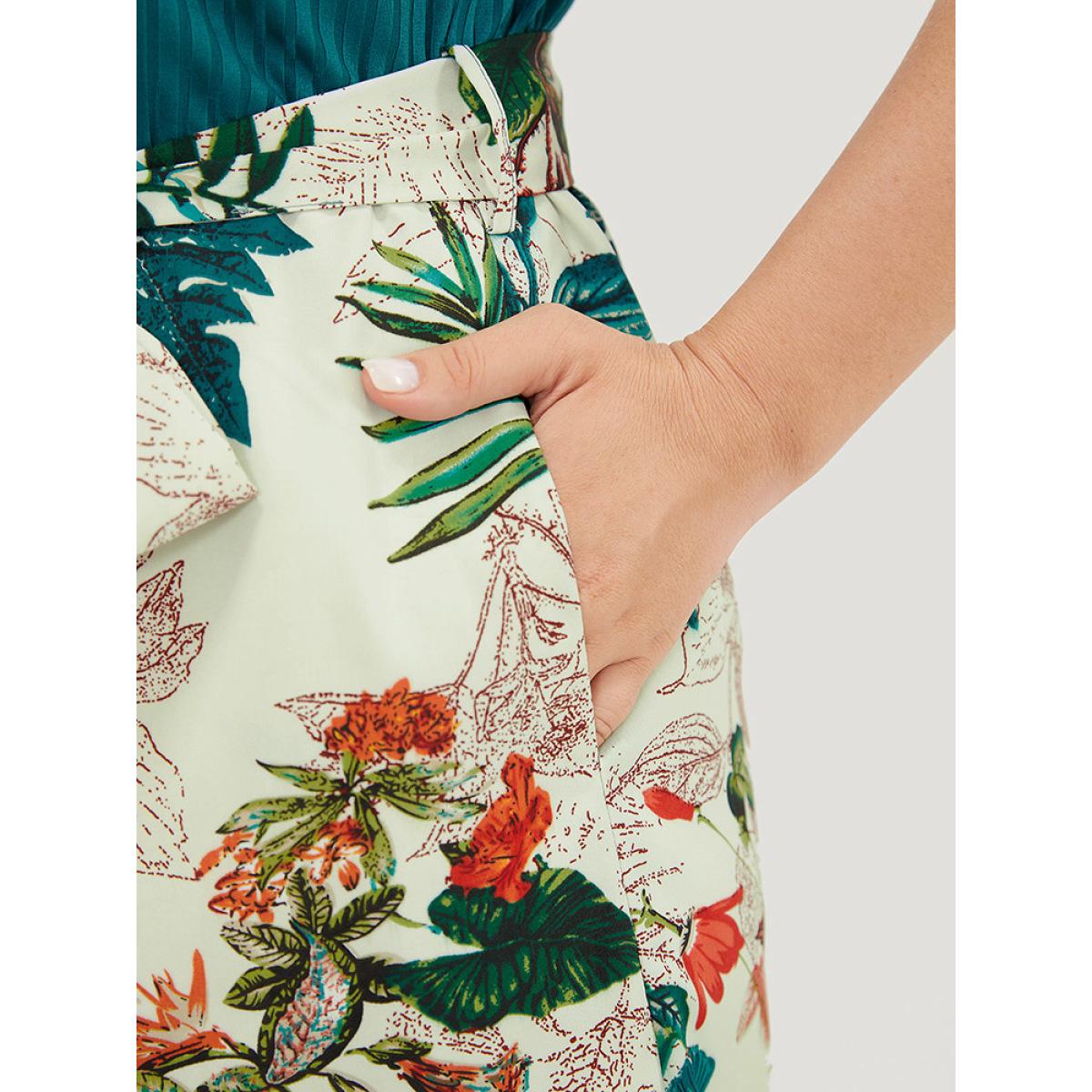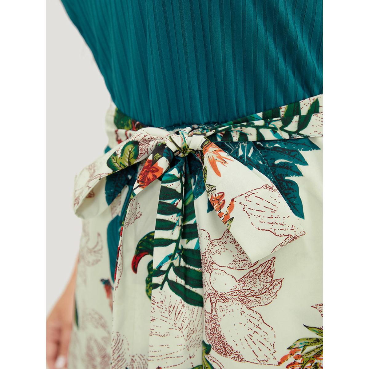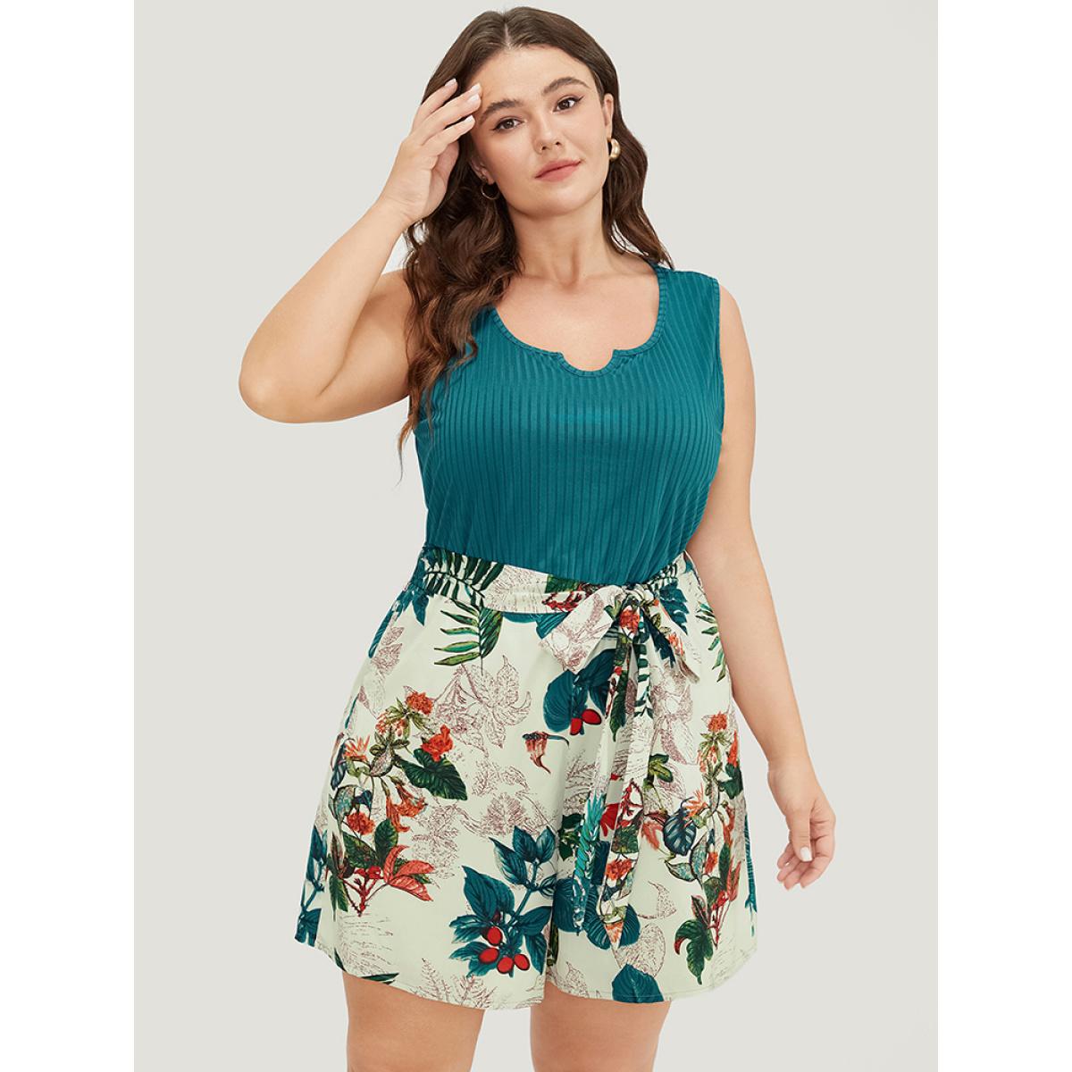 Plus Size Multicolor Tropical Patchwork Belted Notched Rib Knit Tank Romper Women Vacation Sleeveless Notched collar Dailywear Loose Jumpsuits BloomChic 22-24/3X