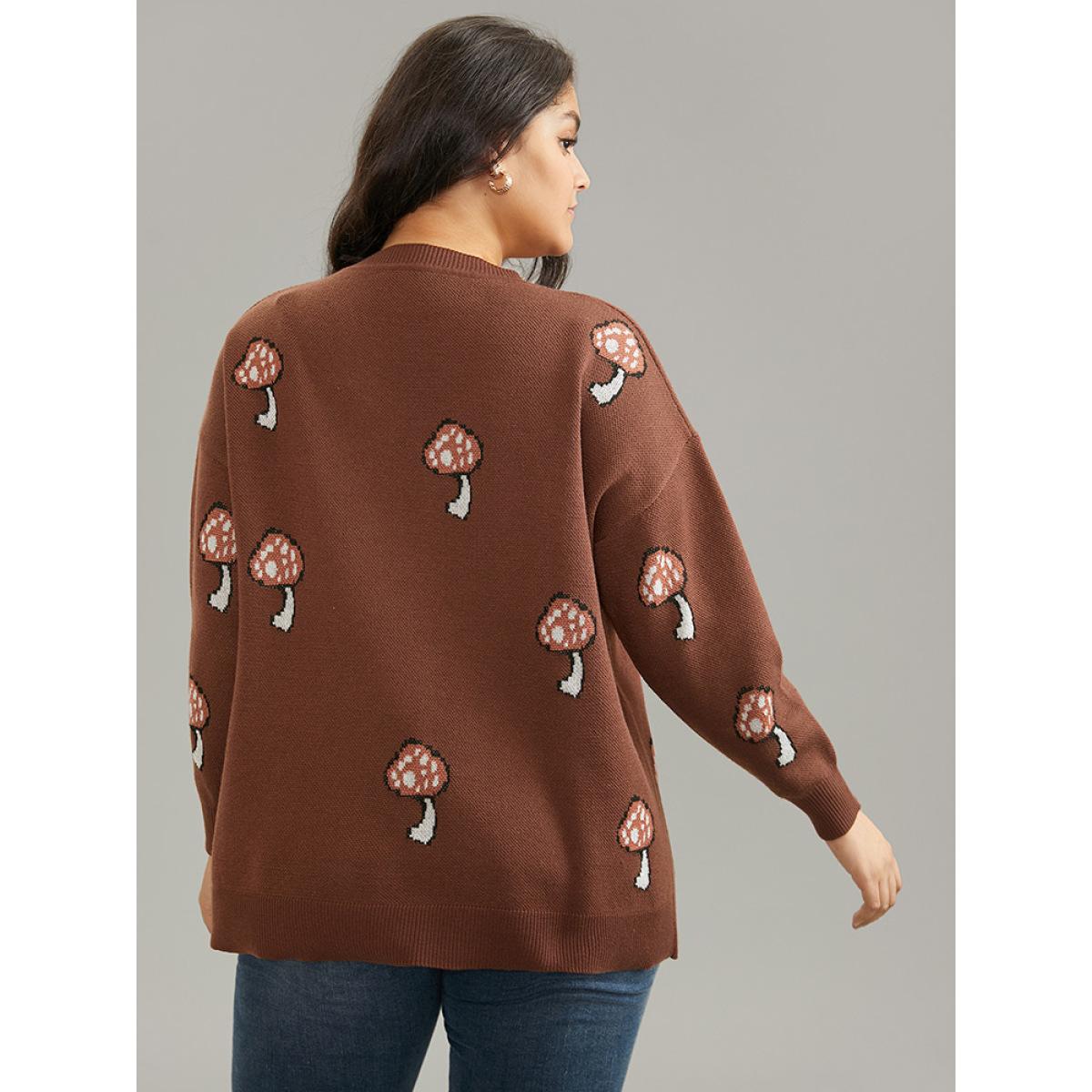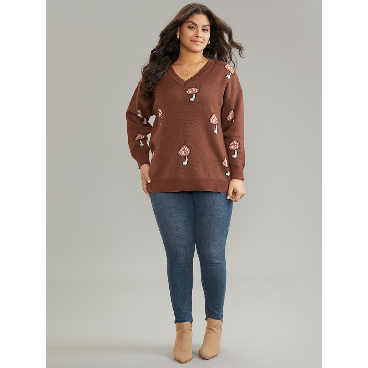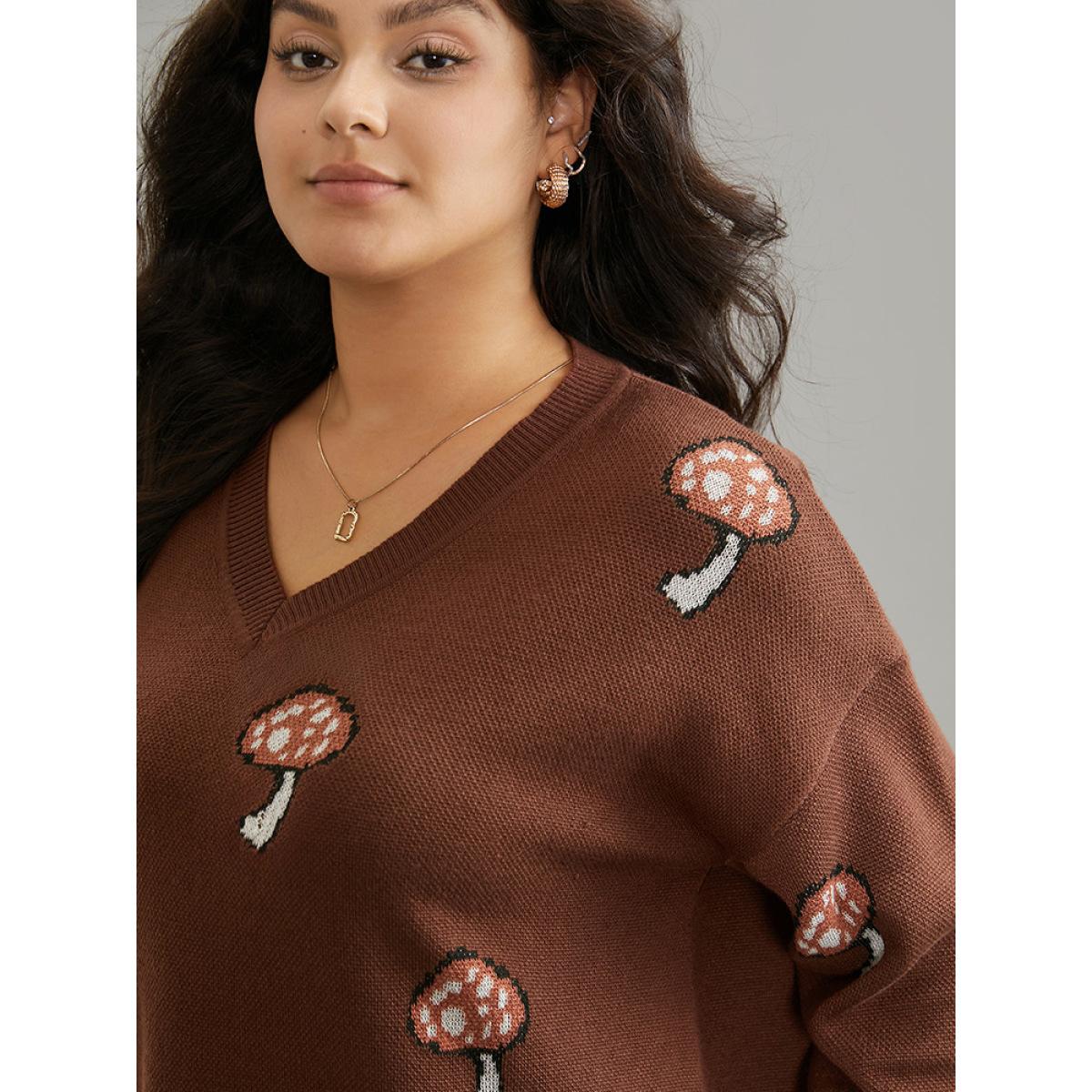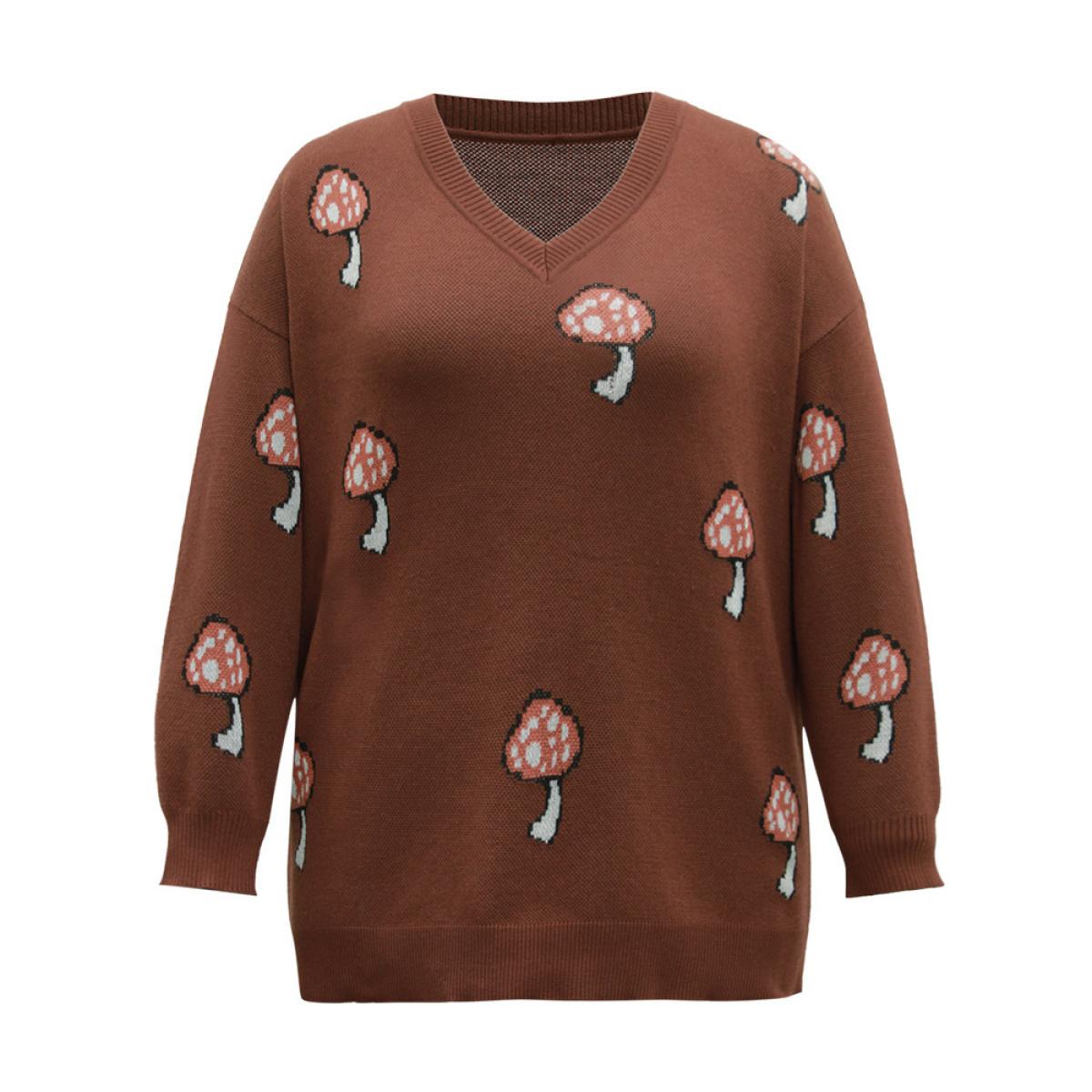 Plus Size Mushroom Knit V Neck Jacquard Pullover Maroon Women Casual Loose Long Sleeve V-neck Dailywear Pullovers BloomChic 14-16/1X