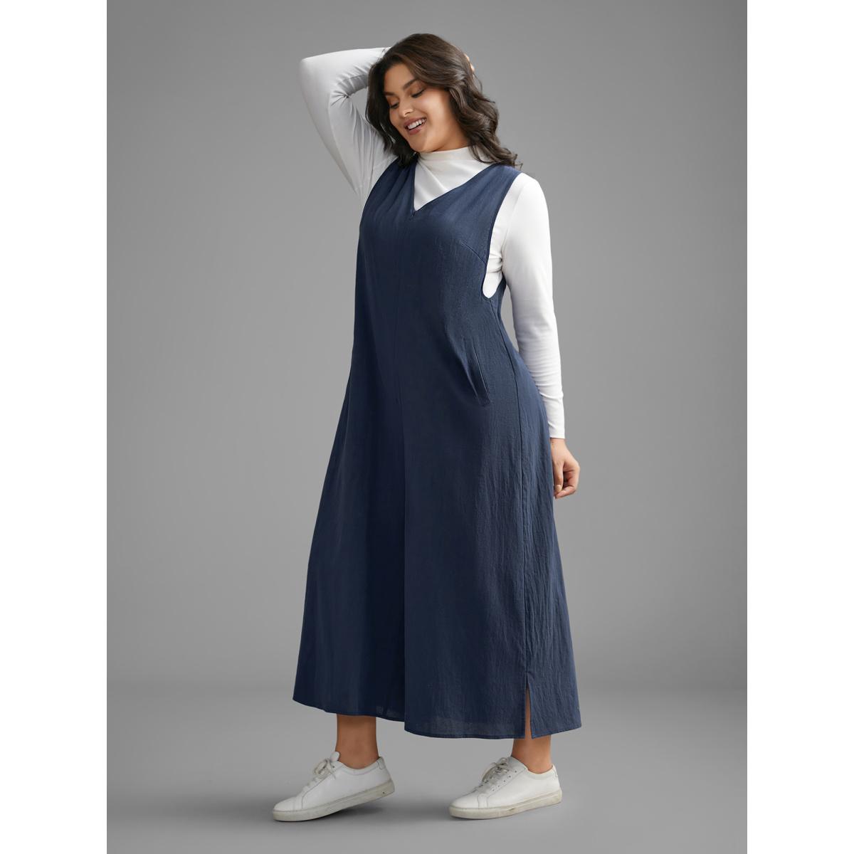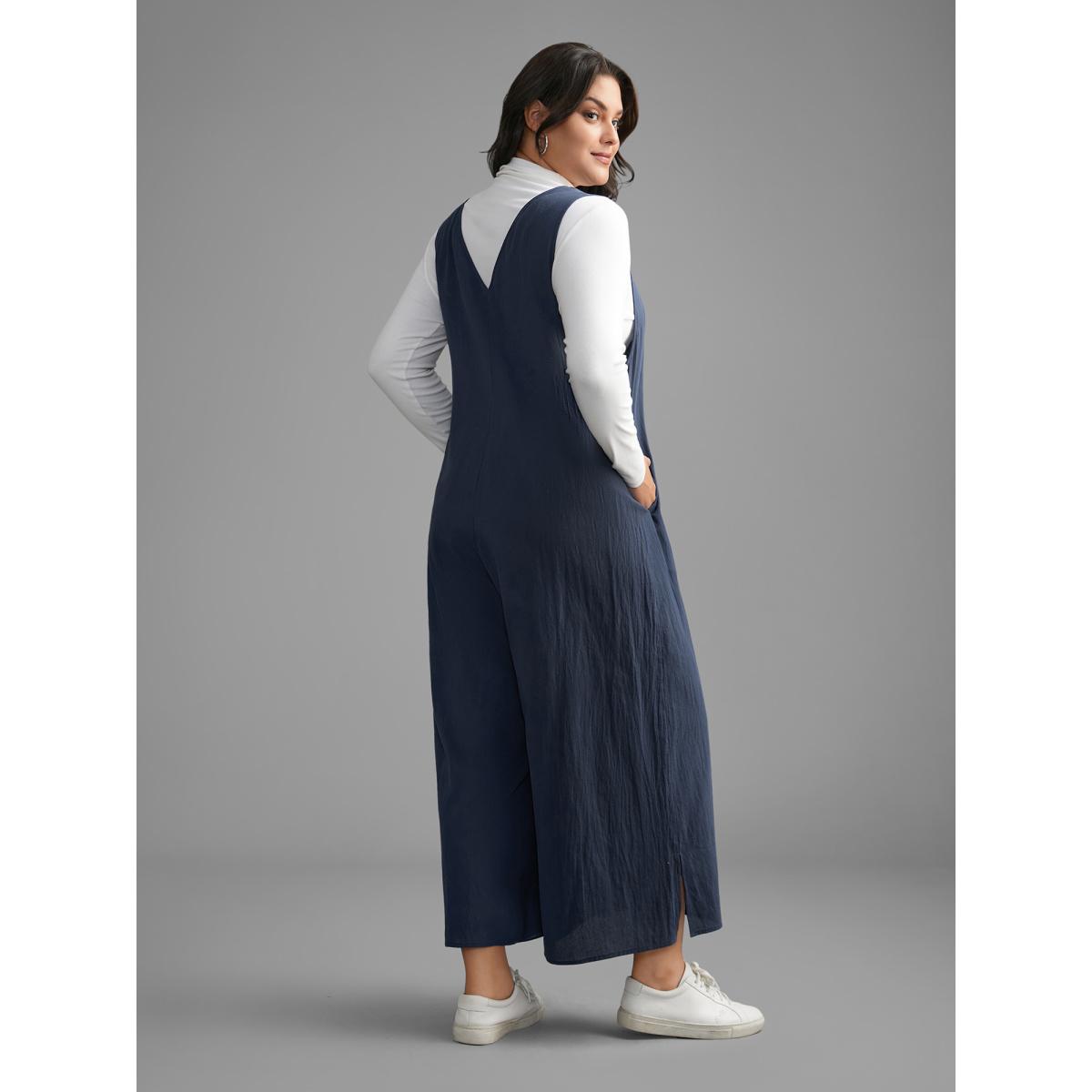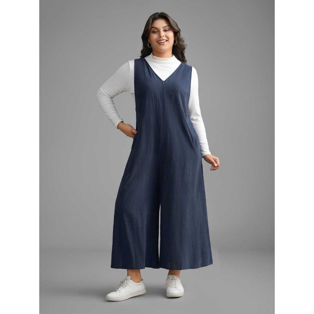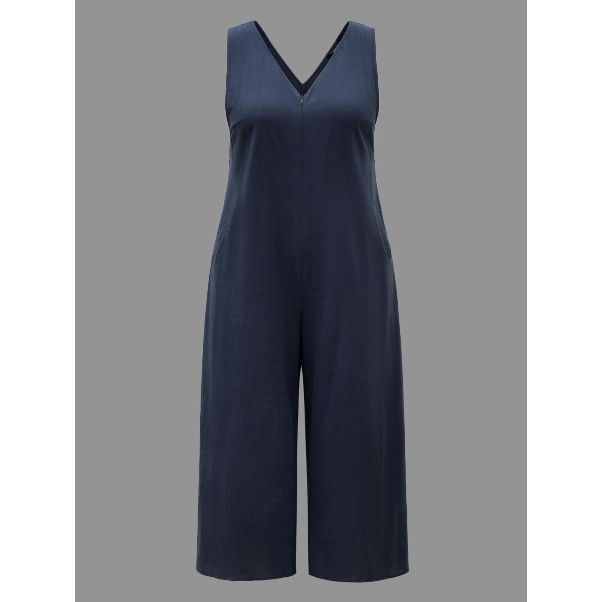 Plus Size Navy Cotton Solid V Neck Loose Jumpsuit Women Casual Sleeveless V-neck Everyday Loose Jumpsuits BloomChic 10/M