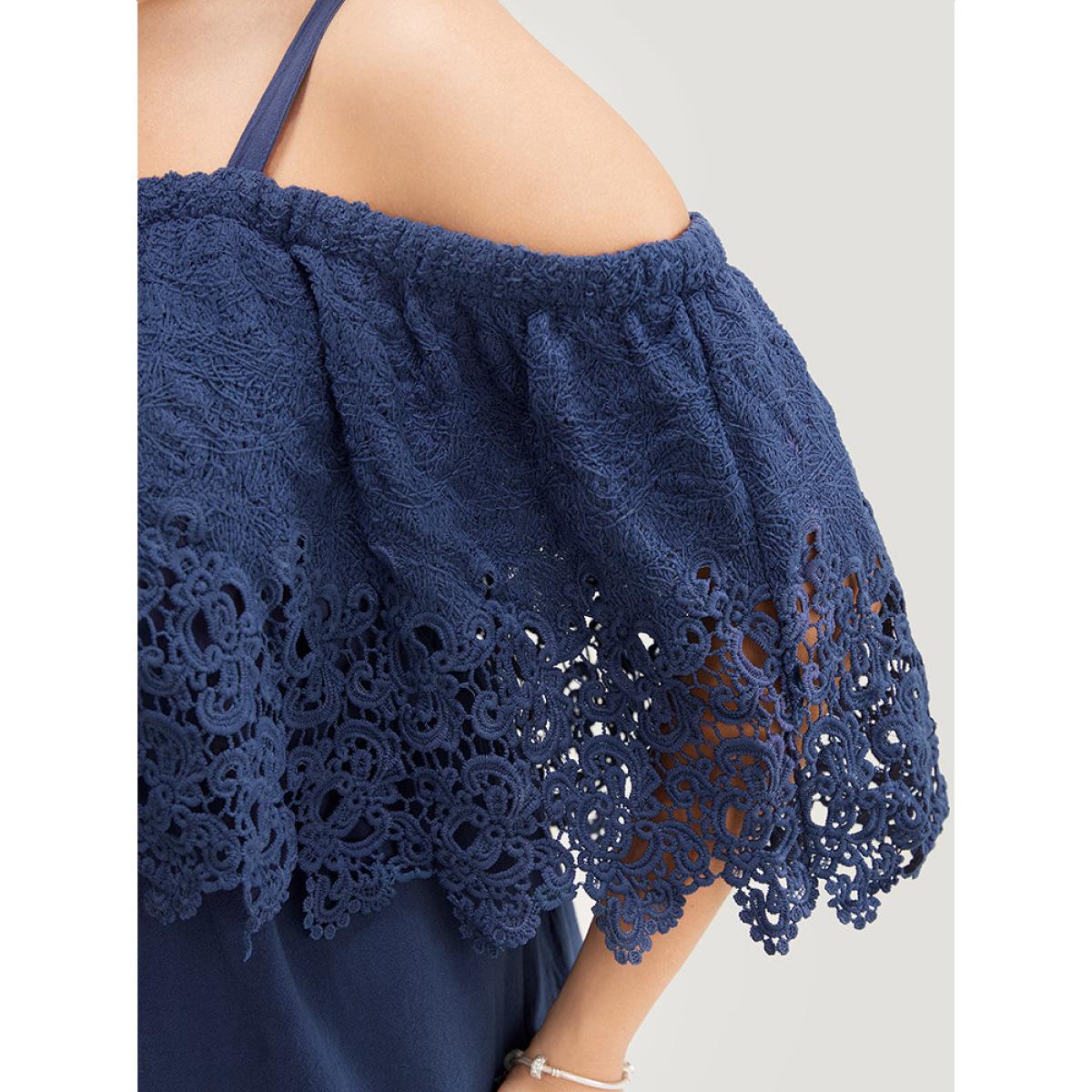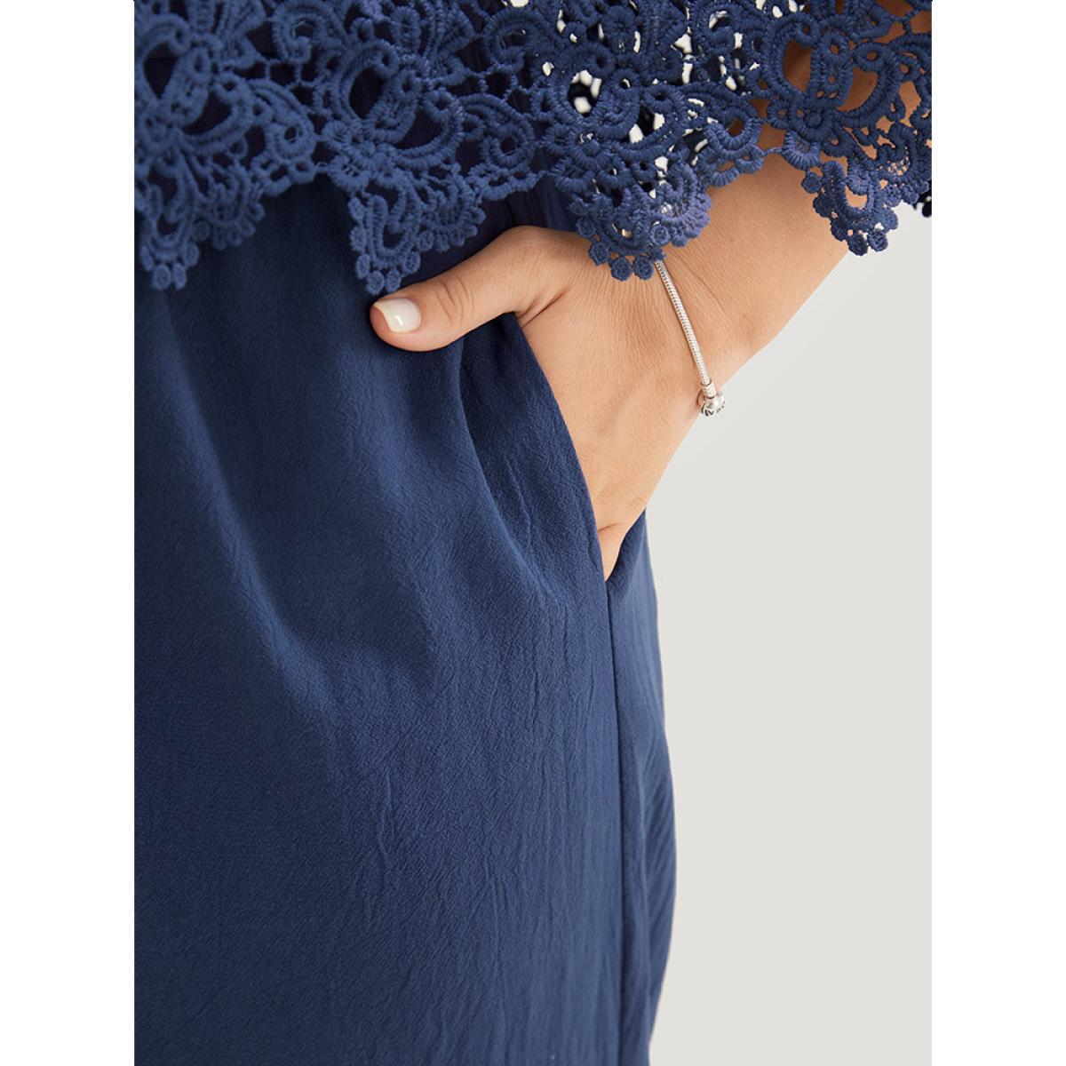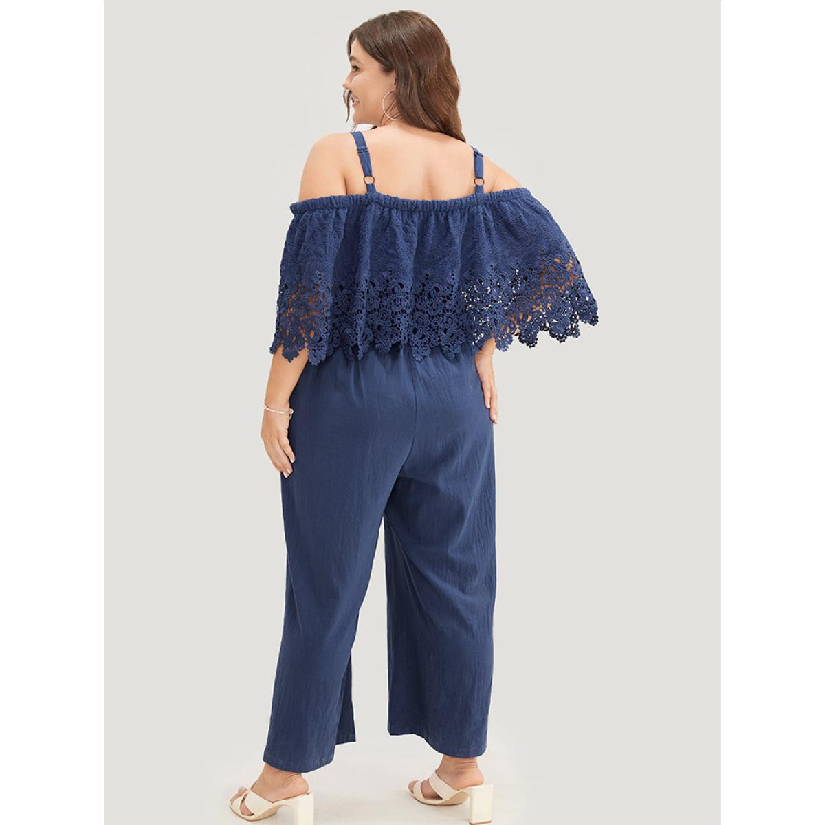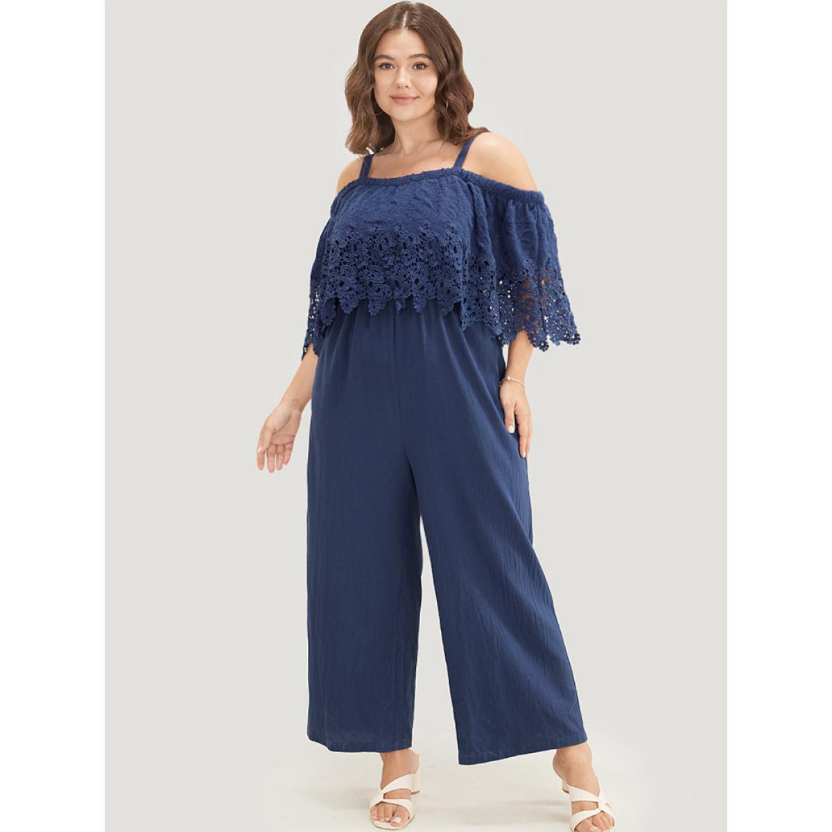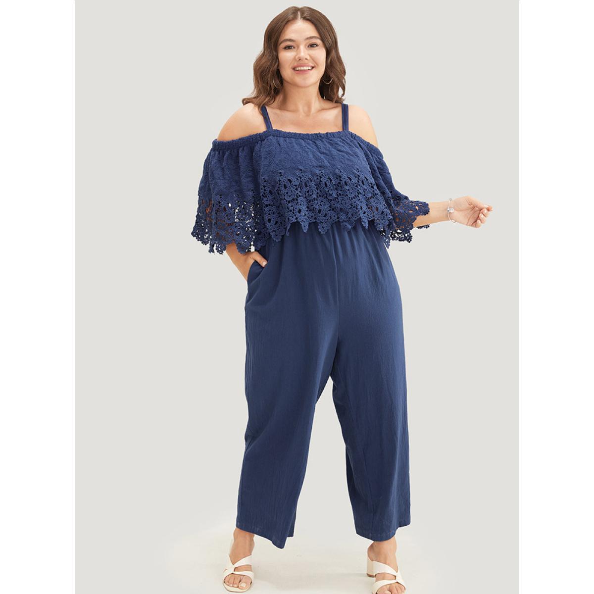 Plus Size Navy Plain Lace Trim Pocket Cold Shoulder Jumpsuit Women Elegant Short sleeve Cold Shoulder Dailywear Loose Jumpsuits BloomChic 12/L