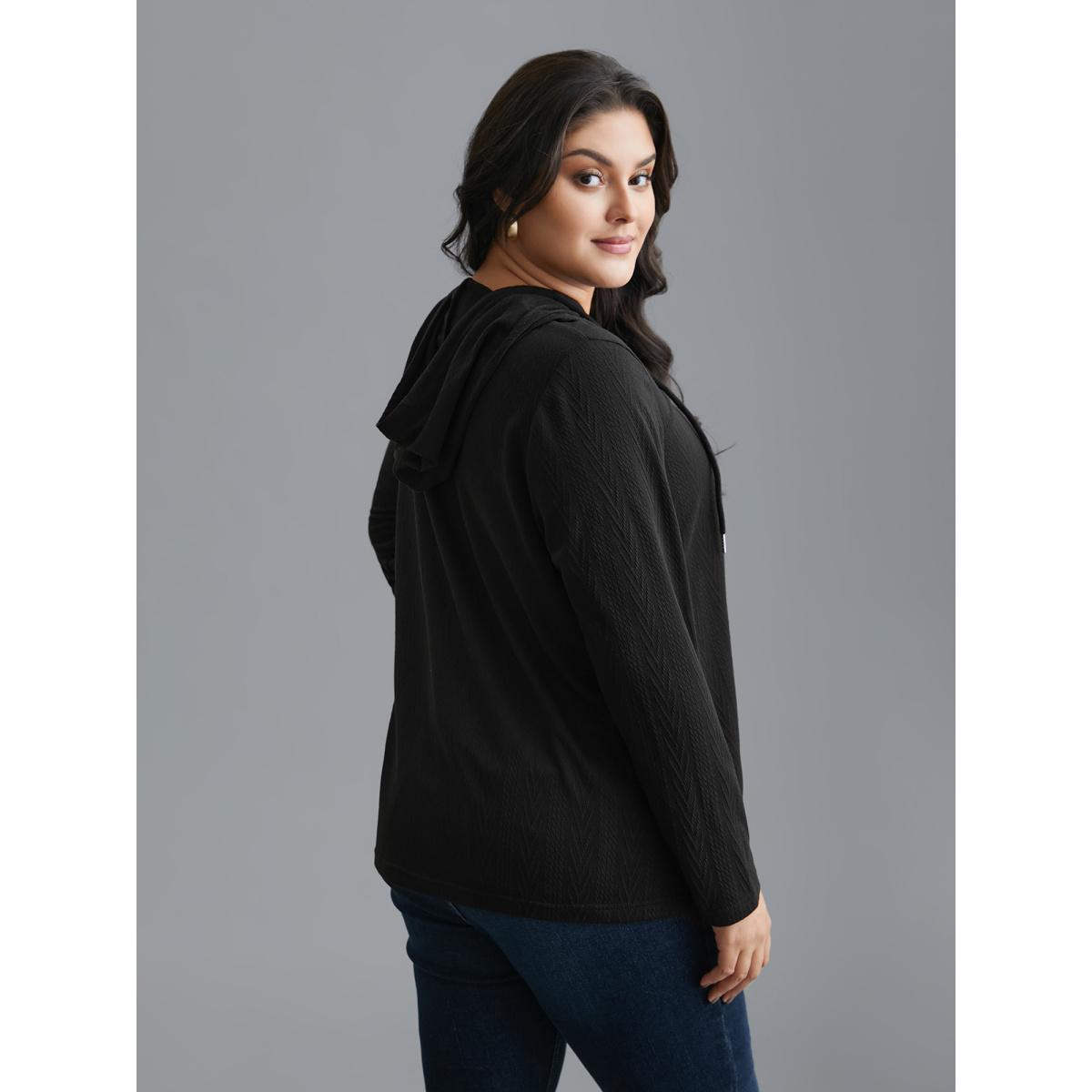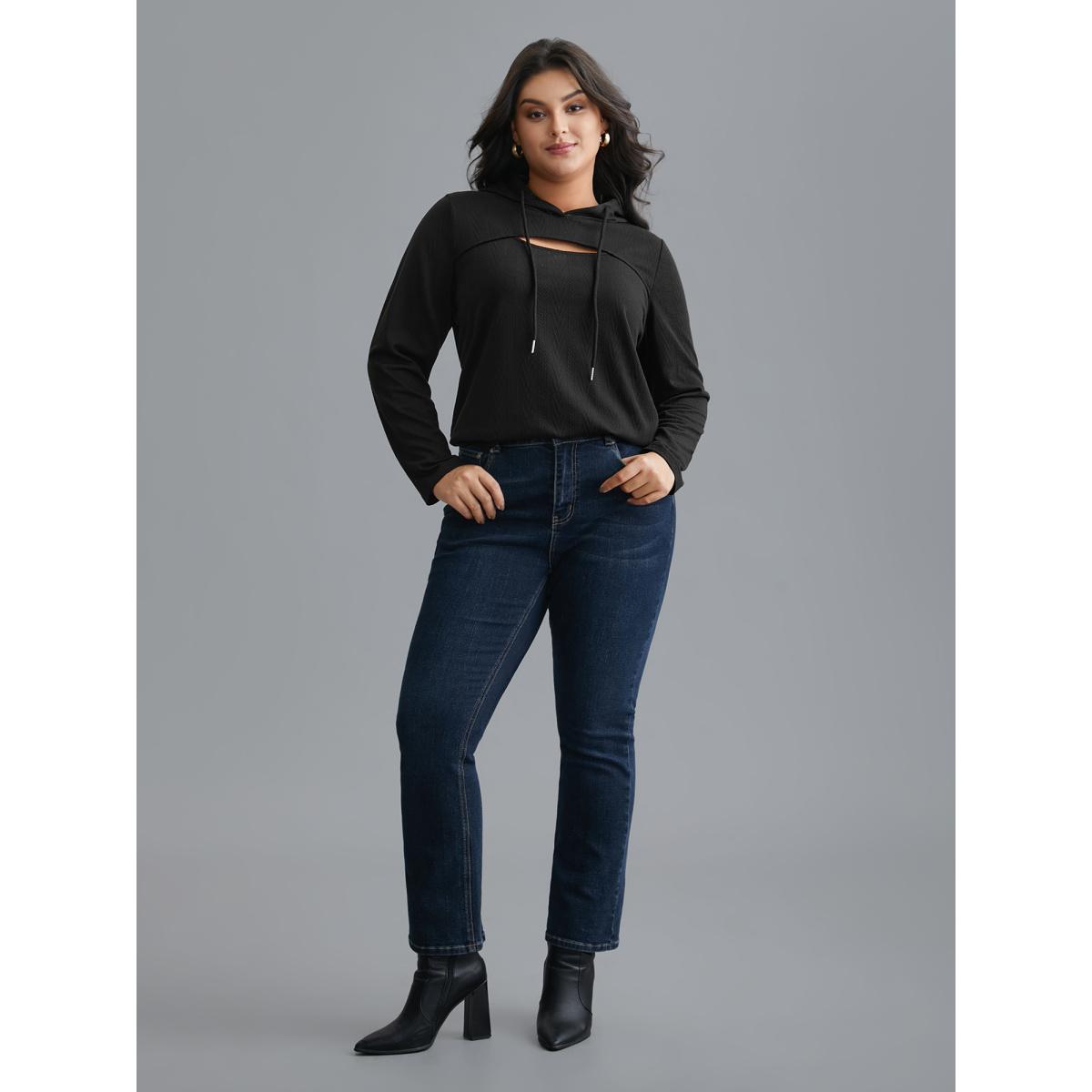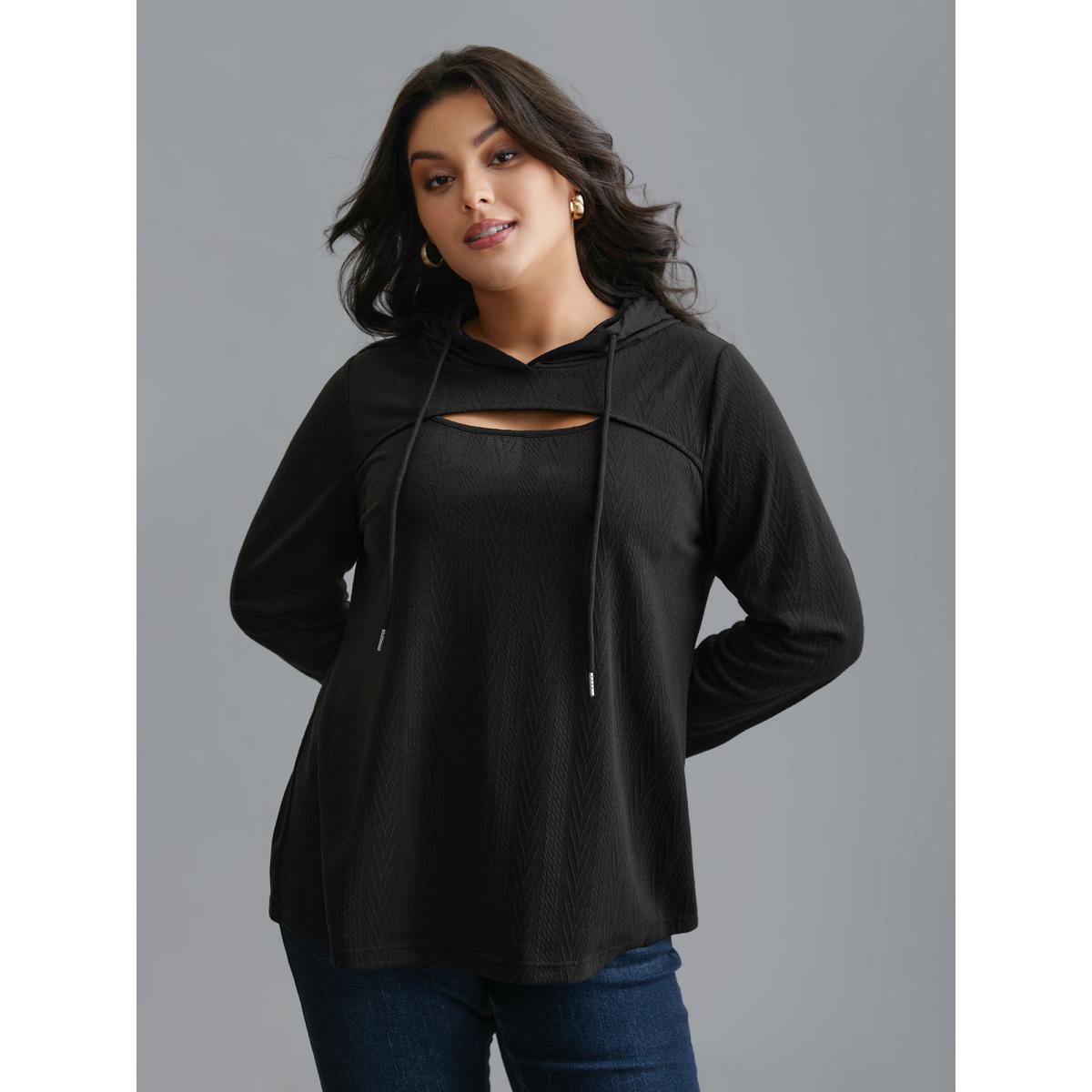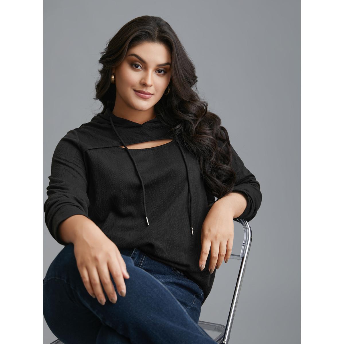 Plus Size Neck Cut-Out Elastic Textured Hoodie Women Black Elegant Texture Bodycon Hooded Everyday Sweatshirts BloomChic 26/4X