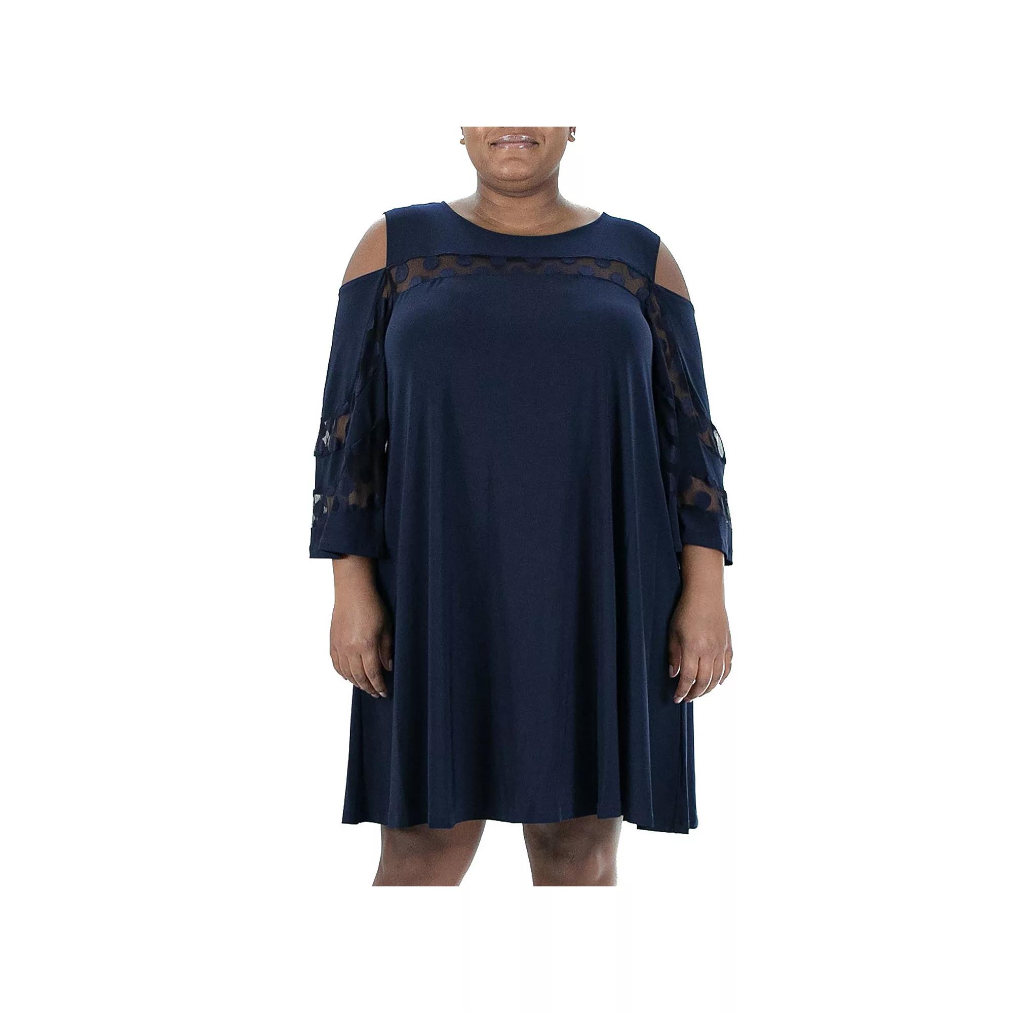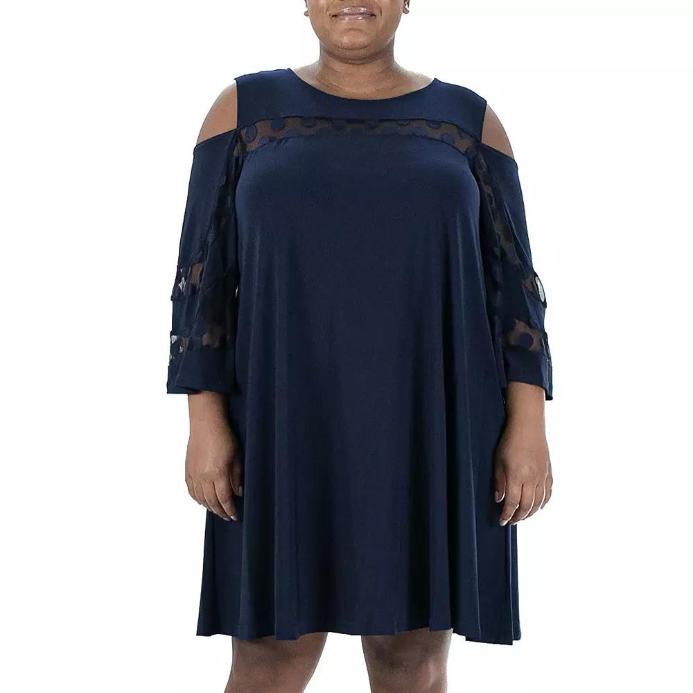 For a fun, flowing look, reach for this women's Nina Leonard mesh-yoke swing dress. Plus, it has pockets! For a fun, flowing look, reach for this women's Nina Leonard mesh-yoke swing dress. Plus, it has pockets! Cold-shoulder design Sheer dot mesh yoke & sleeve insets Scoopneck 3/4-length sleeves Jersey construction 2 pocketsFIT & SIZING 38-in. approximate length from shoulder to hem Swing cut Pull-on designFABRIC & CARE Polyester, spandex Machine wash - Delicate Imported Size: 1X. Color: Navy. Gender: female. Age Group: adult.