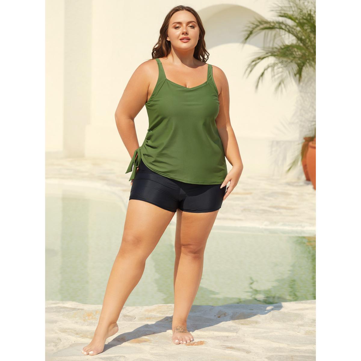 Plus Size Non-Removable Cups Asymmetrical Hem Swim Tankini Women's Swimwear ArmyGreen Beach High stretch Skinny Heart neckline Curve Swim Tops BloomChic 18-20/2X