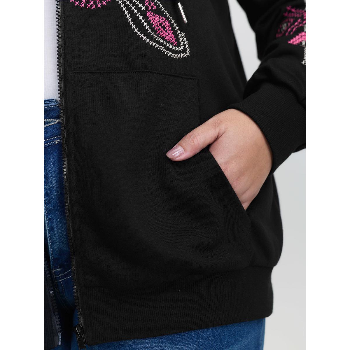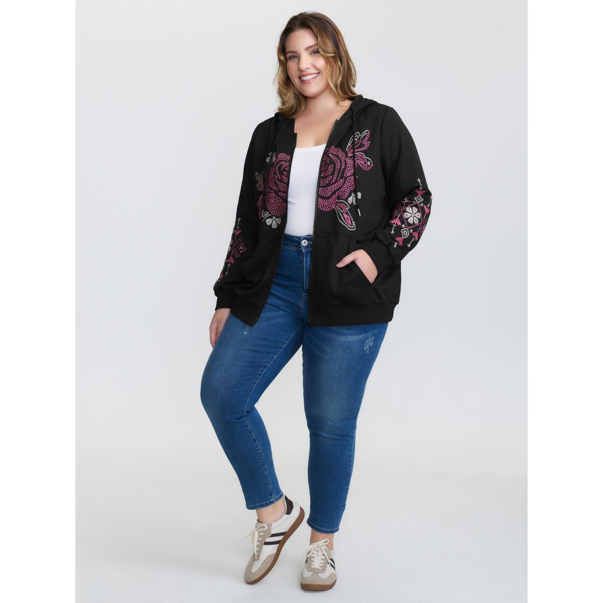 Plus Size Nostalgic Rose Embroidery Drawstring Hoodie Women Black Embroidered Patch pocket Casual Jackets BloomChic 28/5X