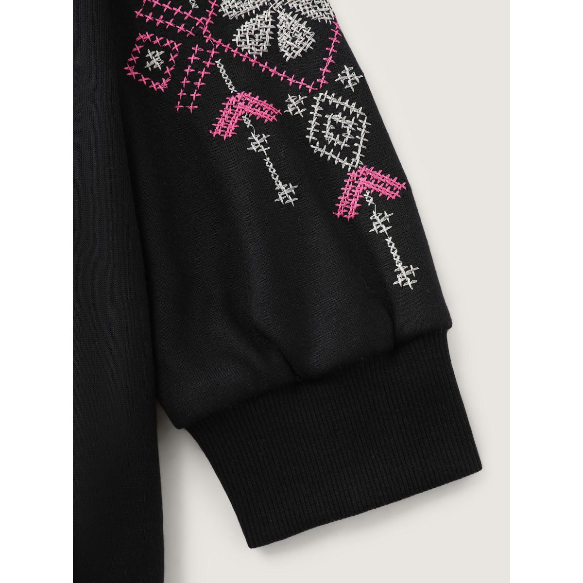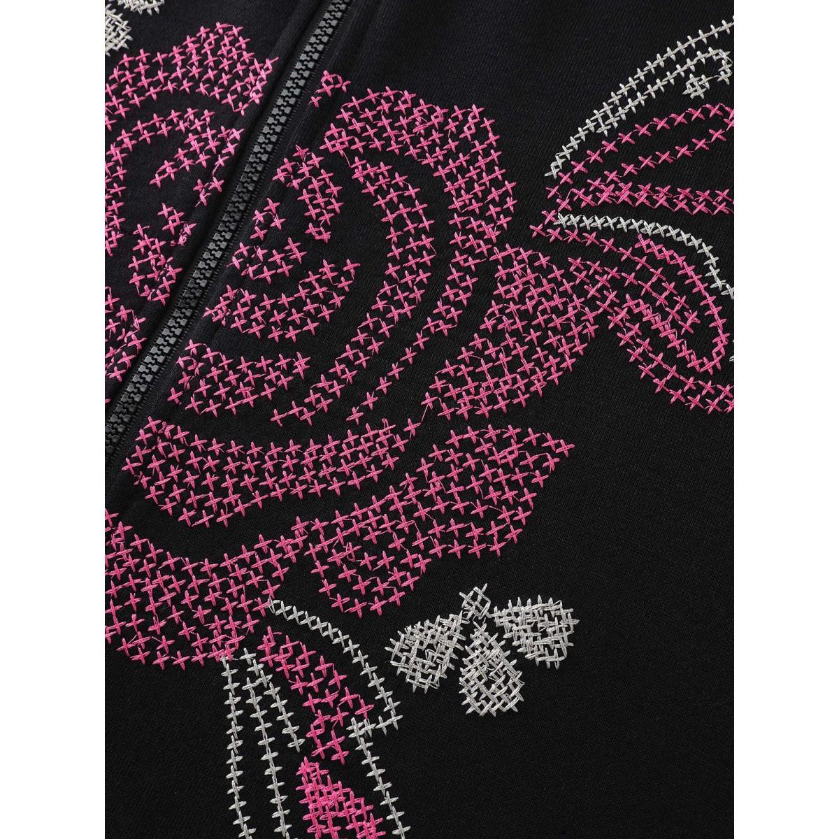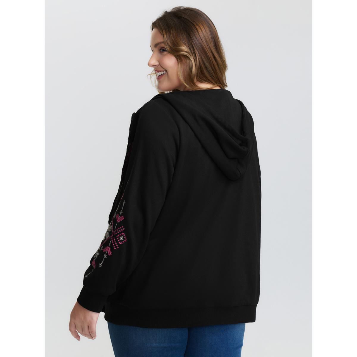 Plus Size Nostalgic Rose Embroidery Drawstring Hoodie Women Black Embroidered Patch pocket Casual Jackets BloomChic 28/5X Product Image