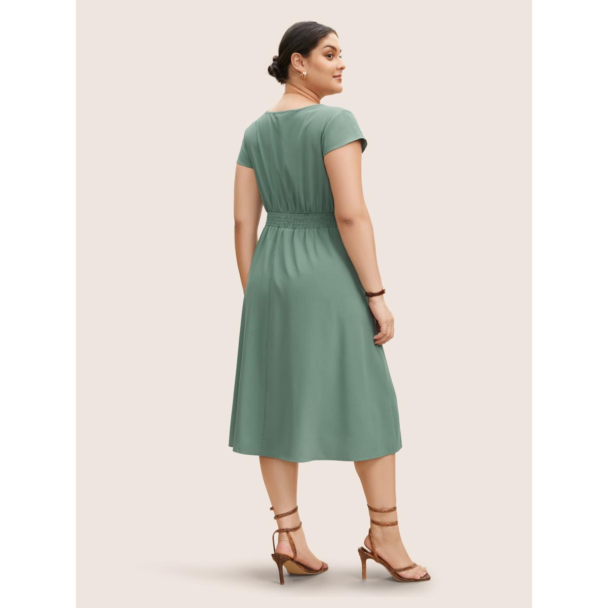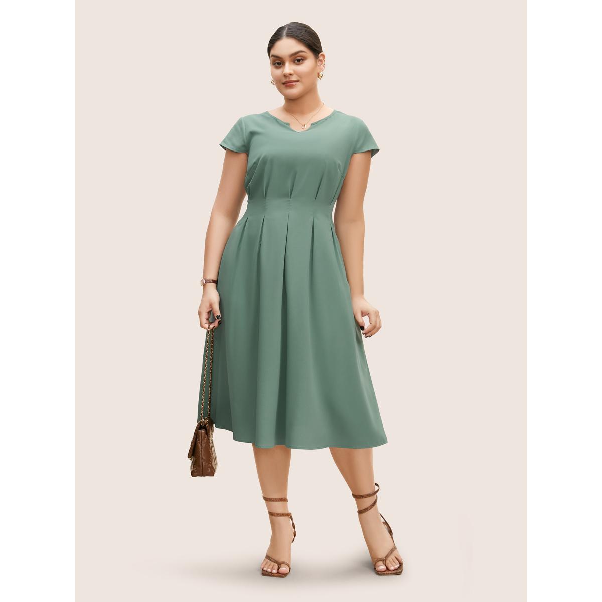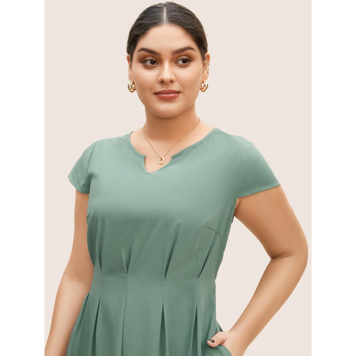 Plus Size Notched Collar Shirred Pleated Cap Sleeve Dress Emerald Women Work From Home Pleated Notched collar Cap Sleeve Curvy BloomChic 10/M