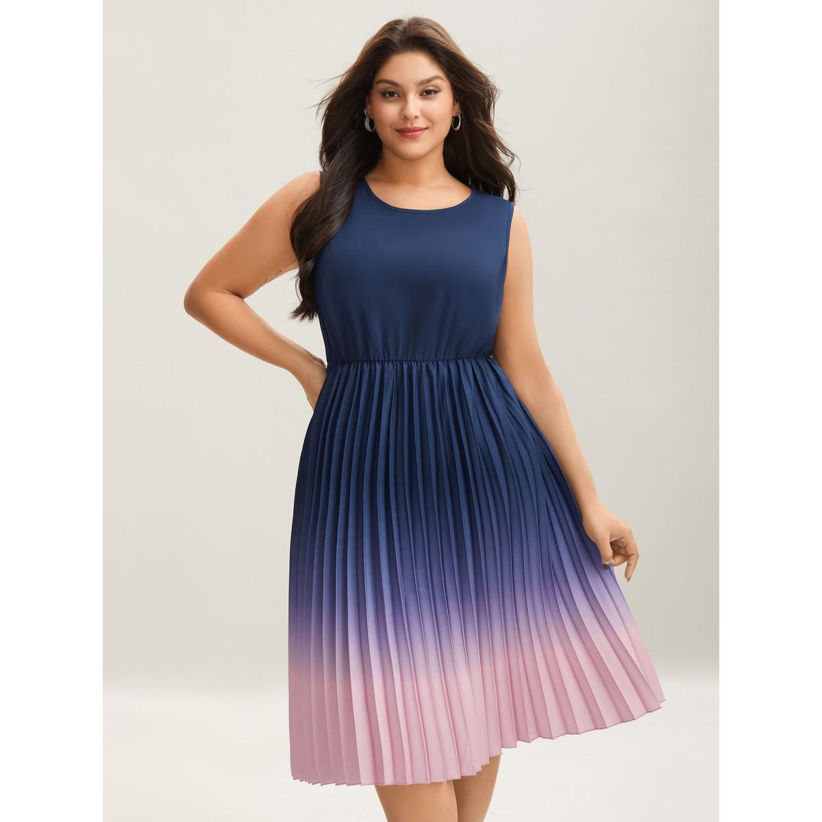 Plus Size Ombre Gradient Pleated Sleeveless Midi Dress Navy Women Office Pleated Round Neck Sleeveless Curvy BloomChic 22-24/3X
