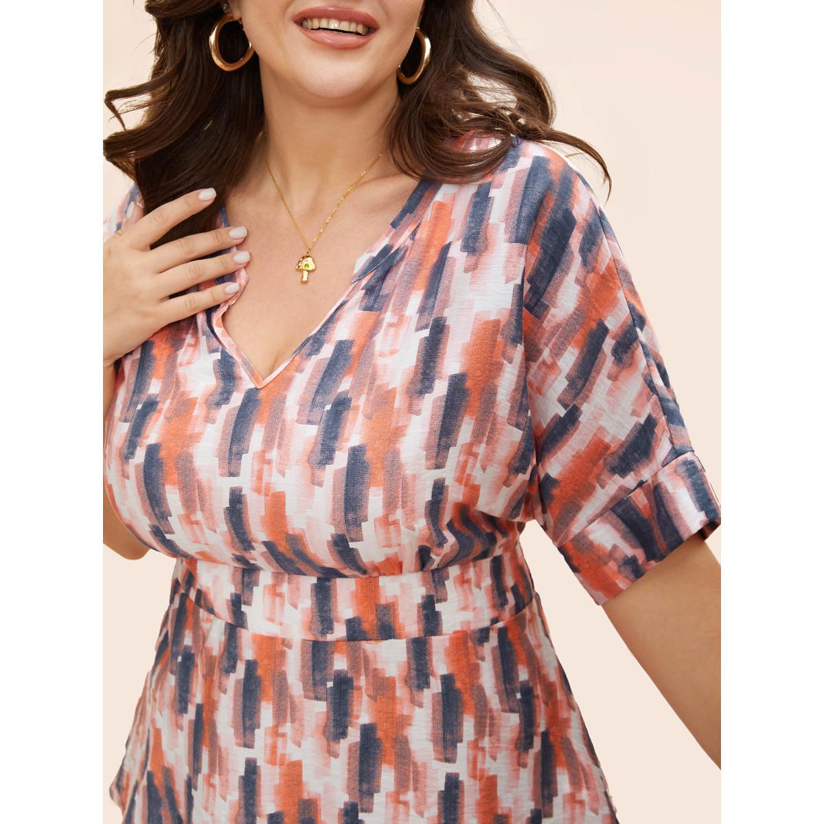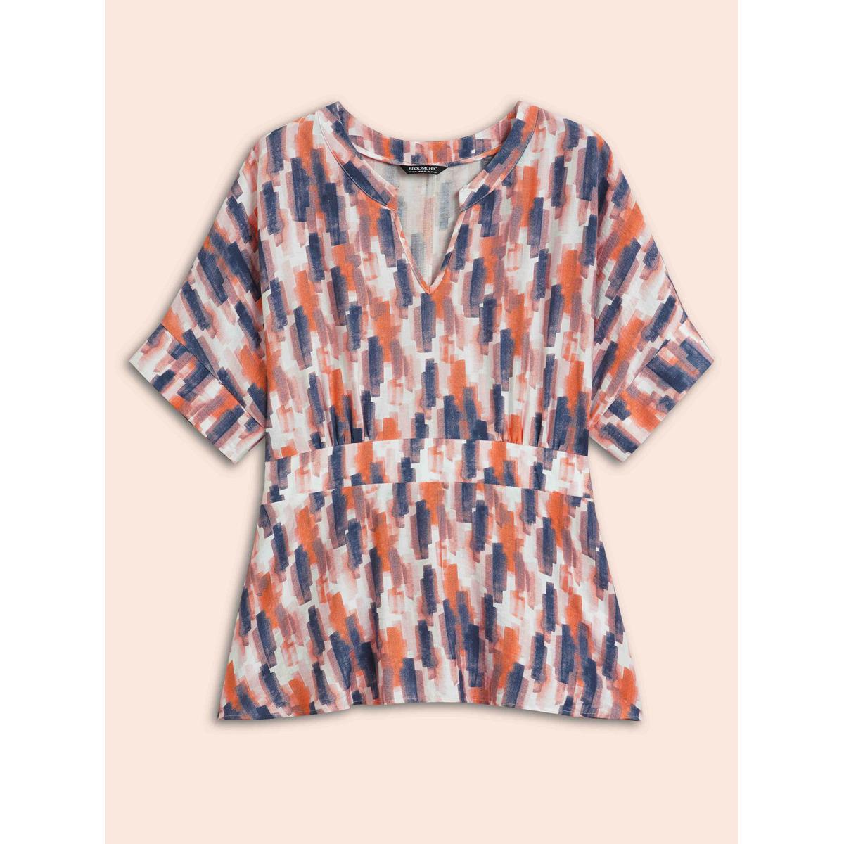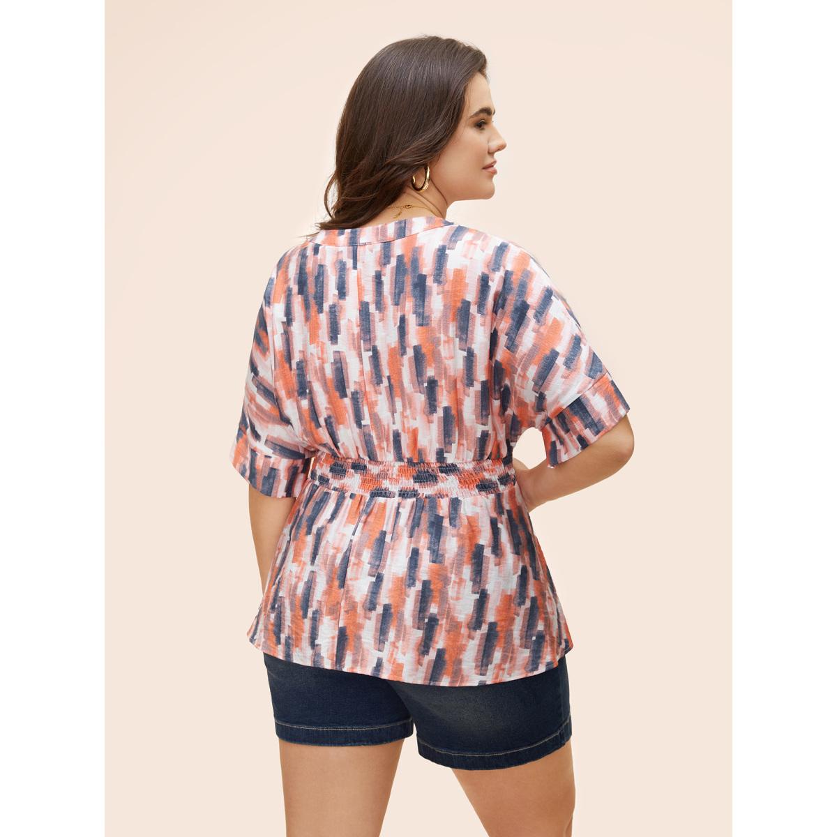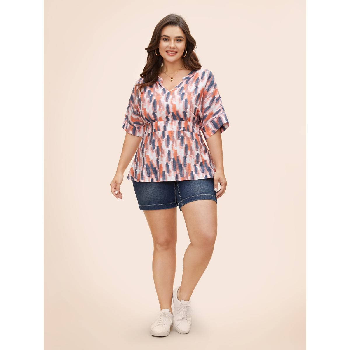 Plus Size OrangeRed Brush Print Shirred Split Neck Blouse Women Casual Half Sleeve Flat collar with V-notch Everyday Blouses BloomChic 28/5X