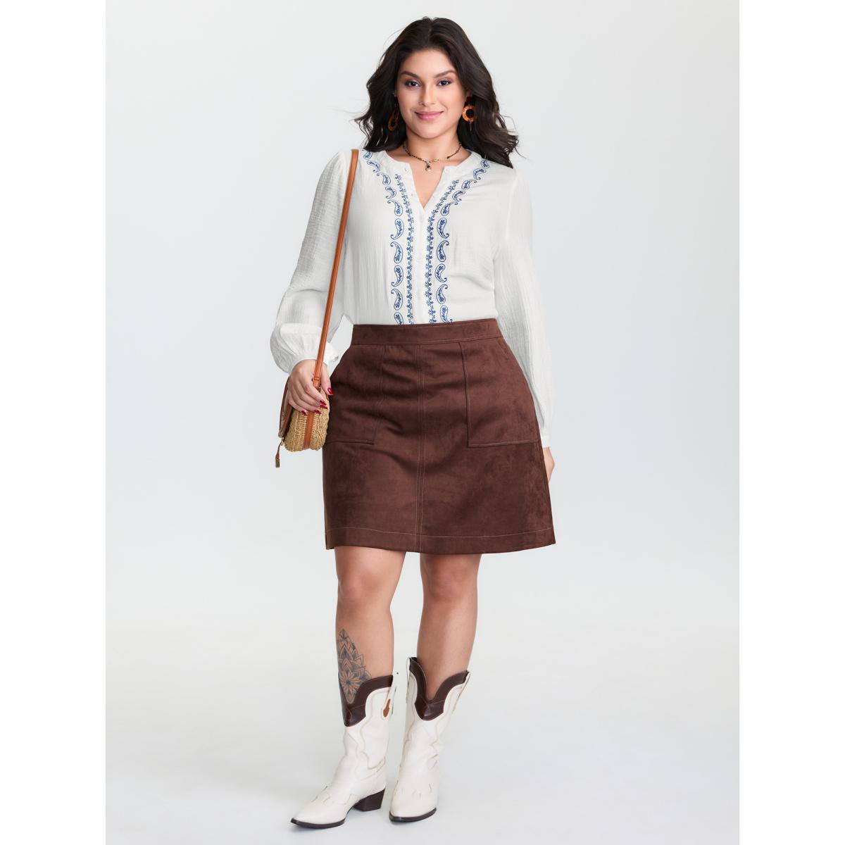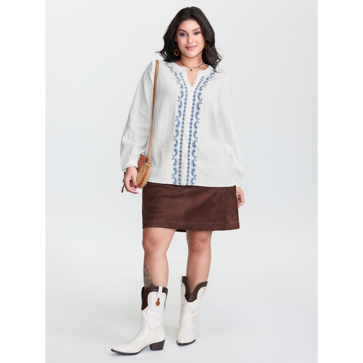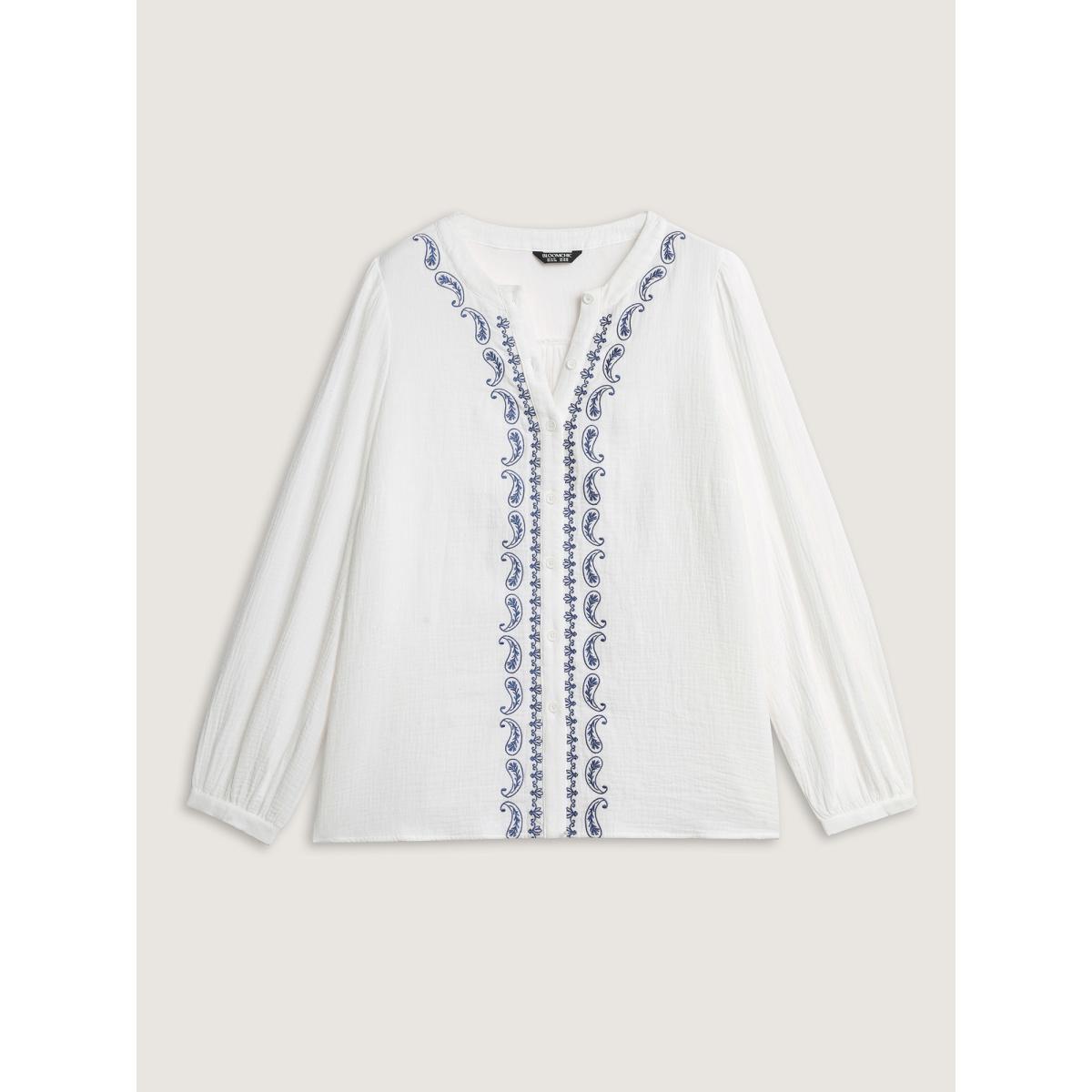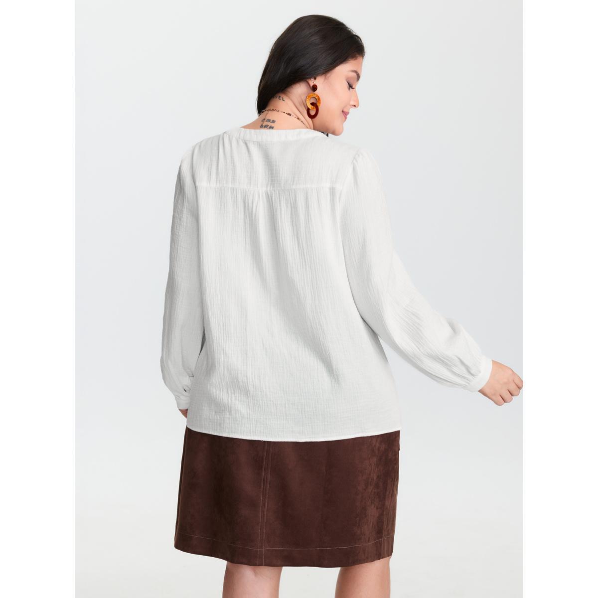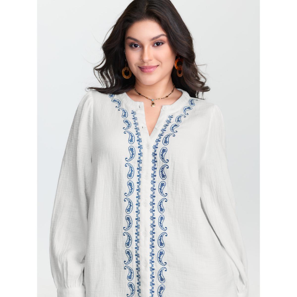 Plus Size Originalwhite Cotton Textured Embroidered Notched Collar Blouse Women Resort Long Sleeve Flat collar with V-notch Vacation Blouses BloomChic 10/M