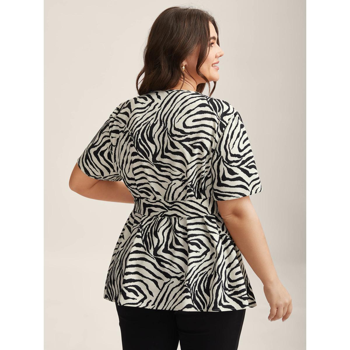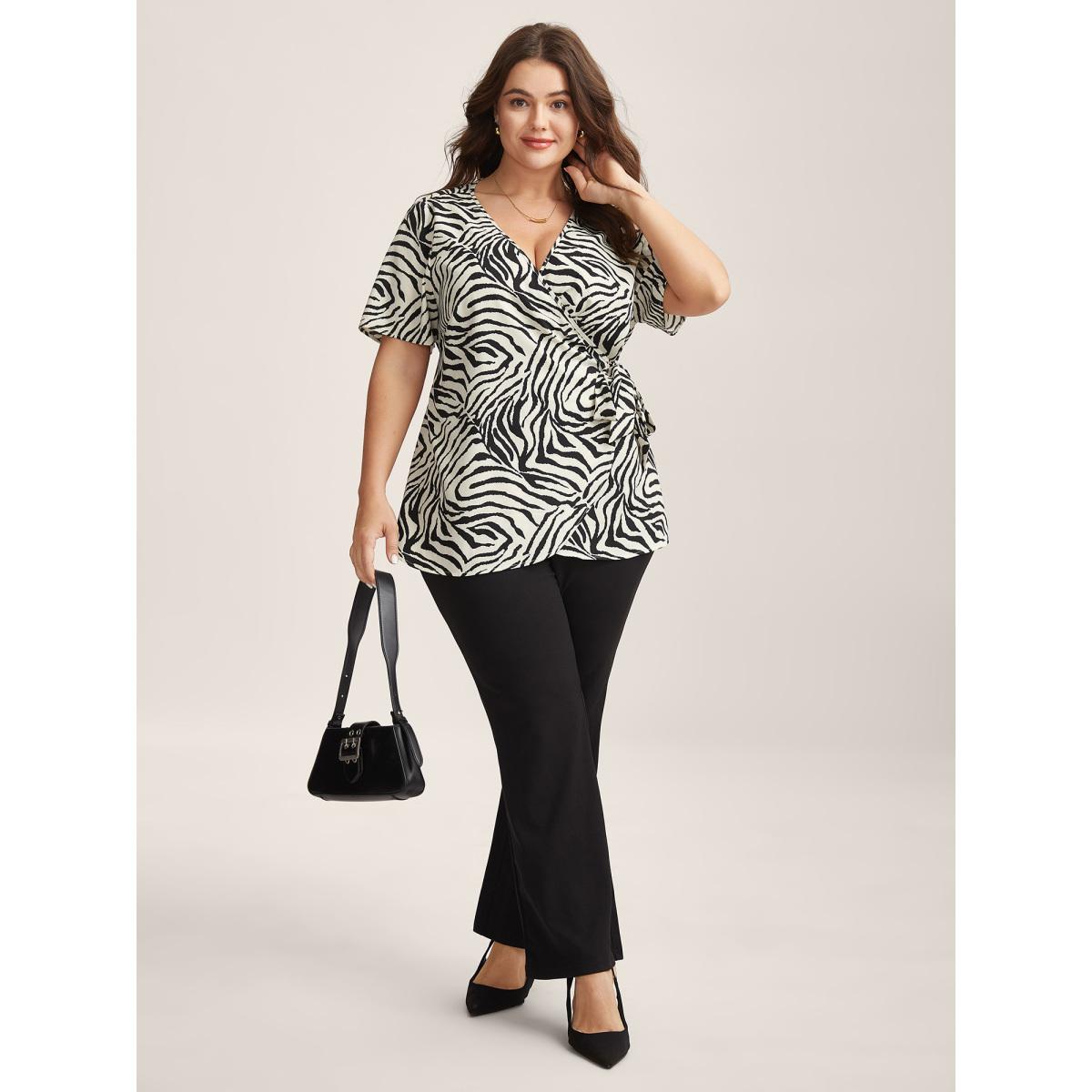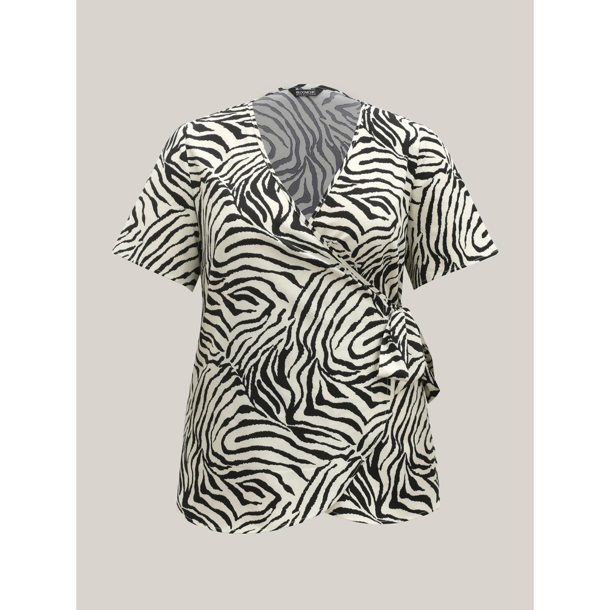 Plus Size Originalwhite Zebra Print Wrap Tie Flowy Blouse Women Short sleeve Overlap Collar Work Blouses BloomChic 14-16/1X Product Image