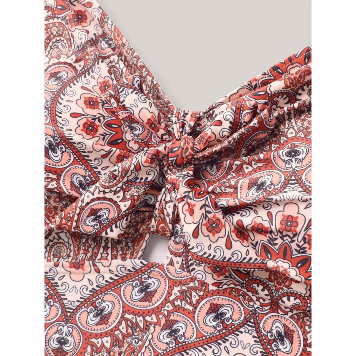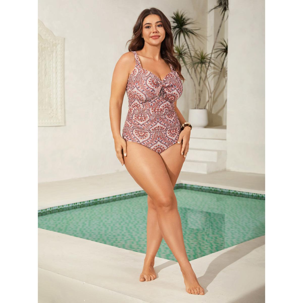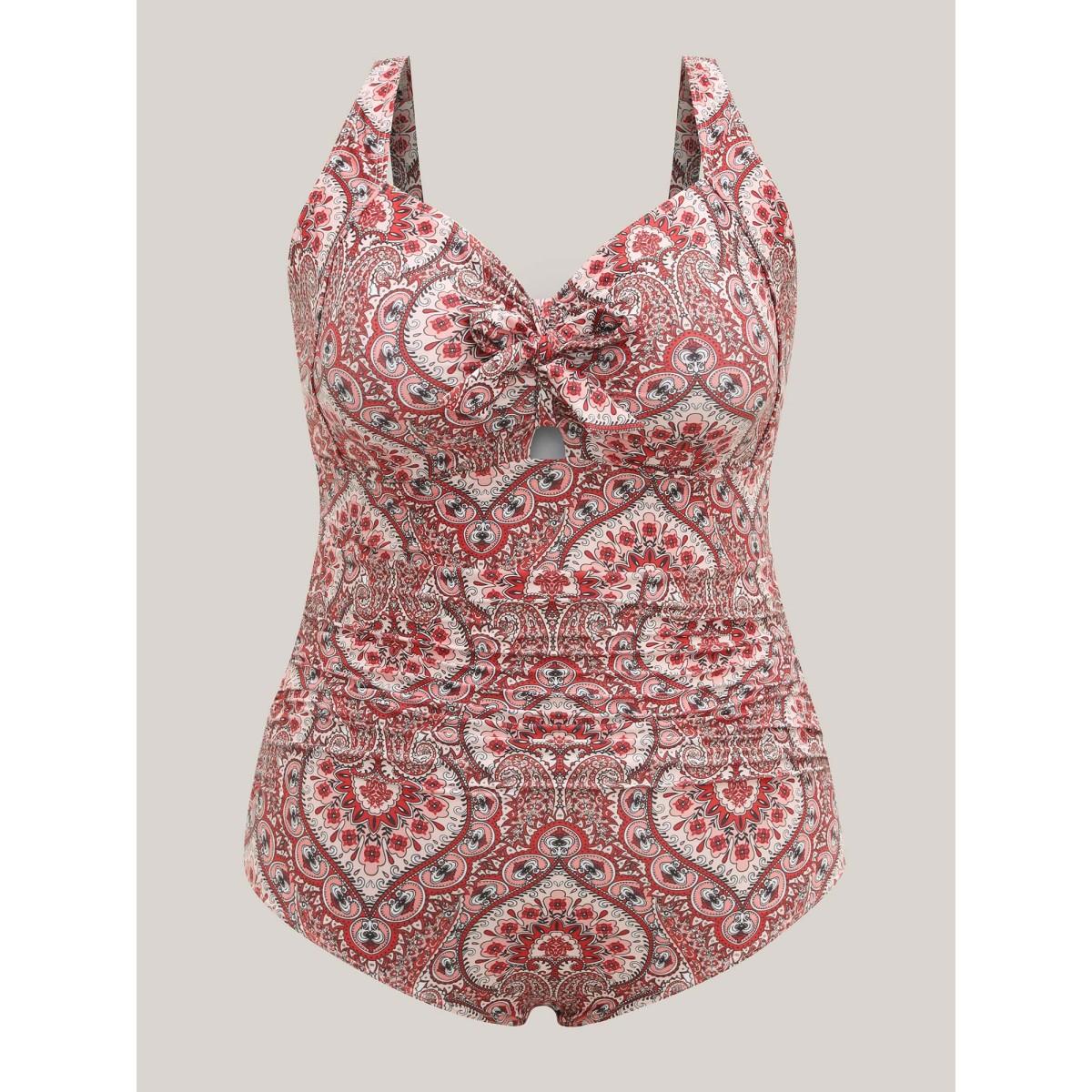 Plus Size Ornate Print Ties One-Piece Swimsuit Women's Swimwear Rust Beach Tie knot Curve Bathing Suits High stretch One Pieces BloomChic 22-24/3X