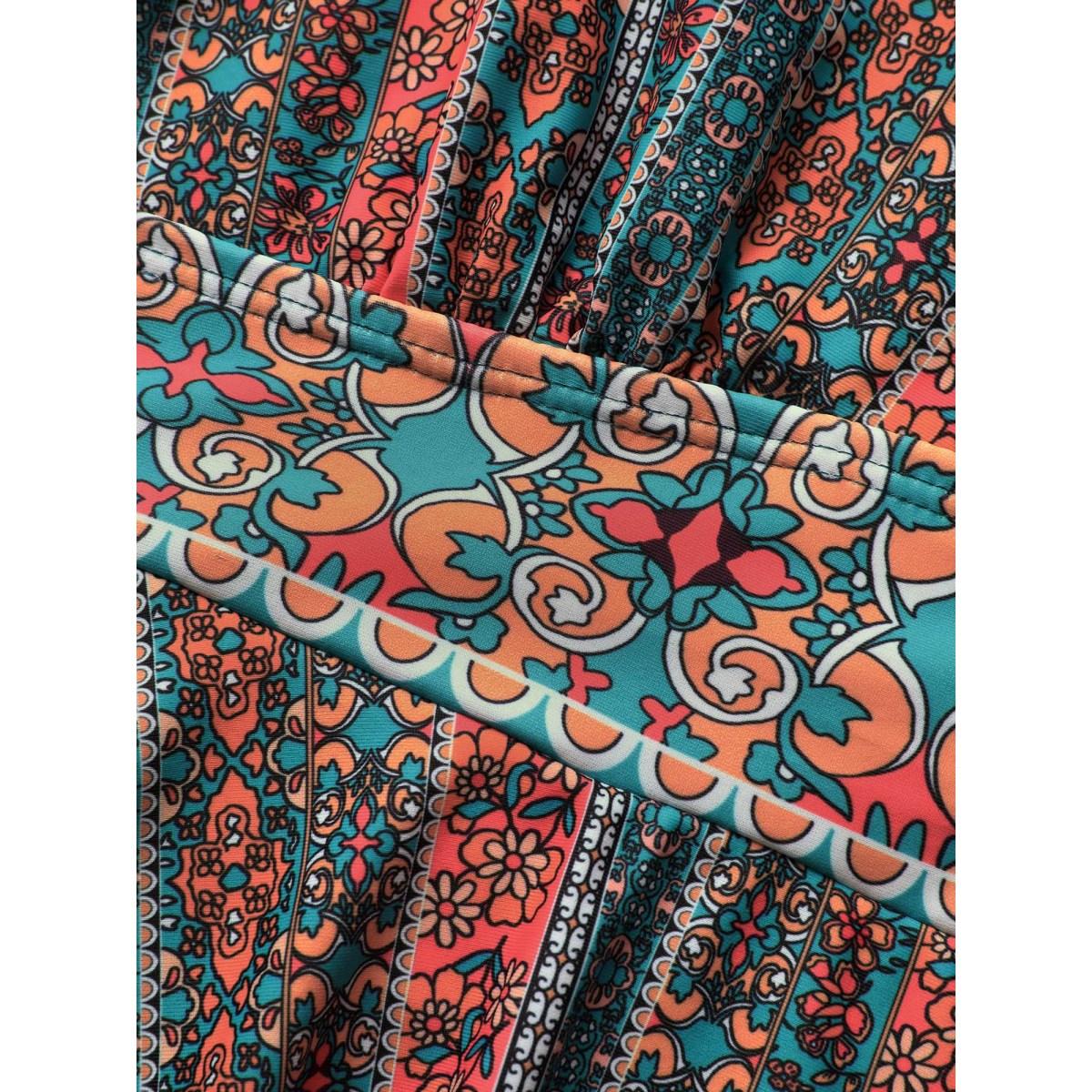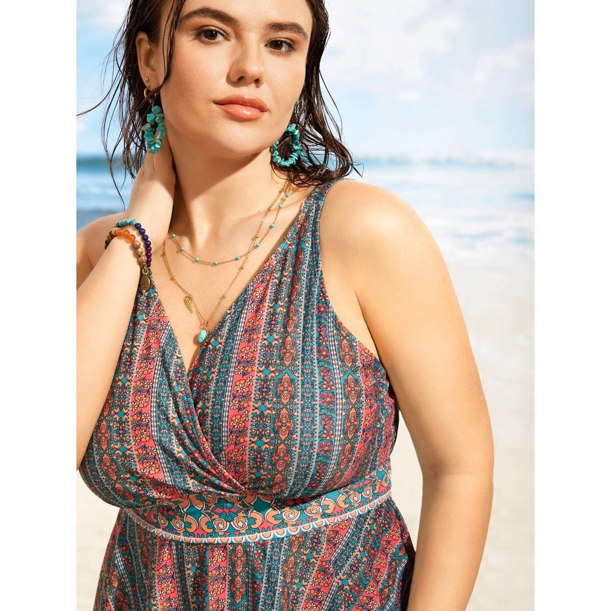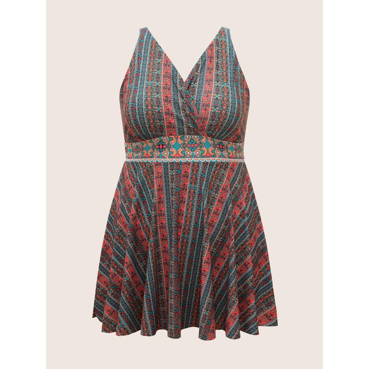 Plus Size Overlap Collar Bandana Print Patchwork Swim Dress Women's Swimwear Crimson Beach Bodycon V-neck High stretch Curve Swim Dresses BloomChic 30/6X