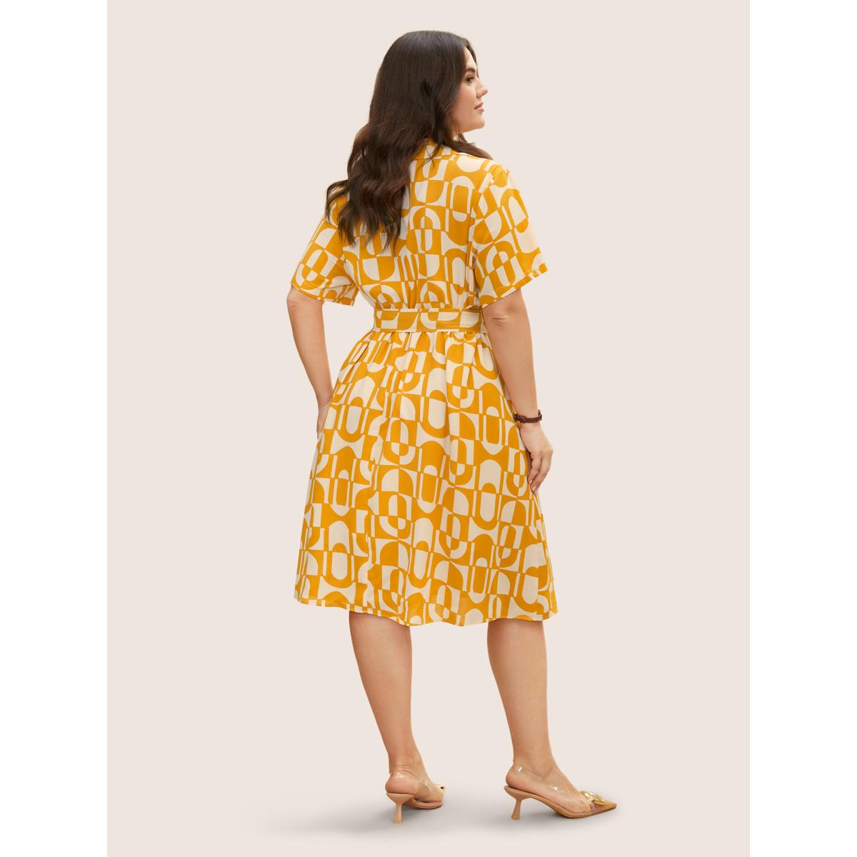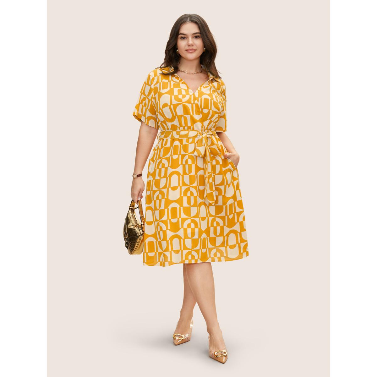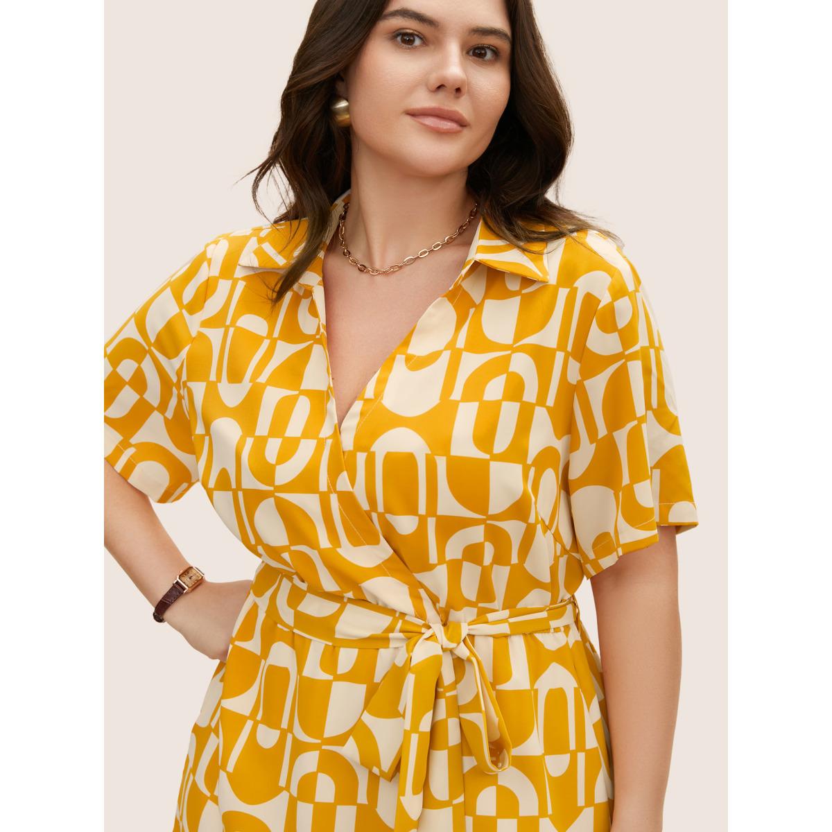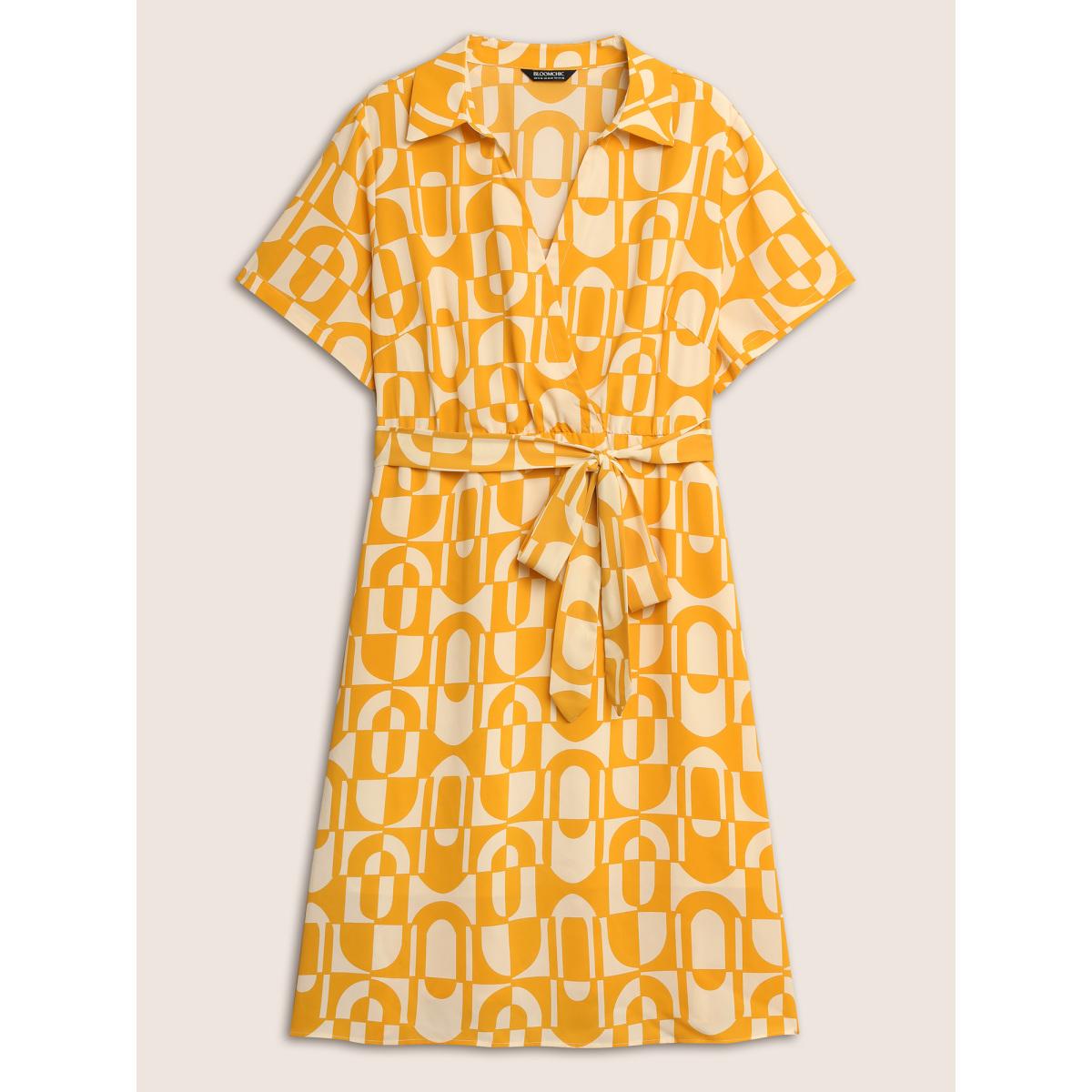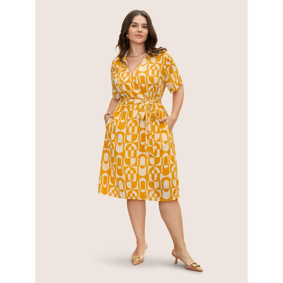 Plus Size Overlap Collar Geometric Belted Midi Dress Lightyellow Women At the Office Belted Overlap Collar Short sleeve Curvy BloomChic 26/4X
