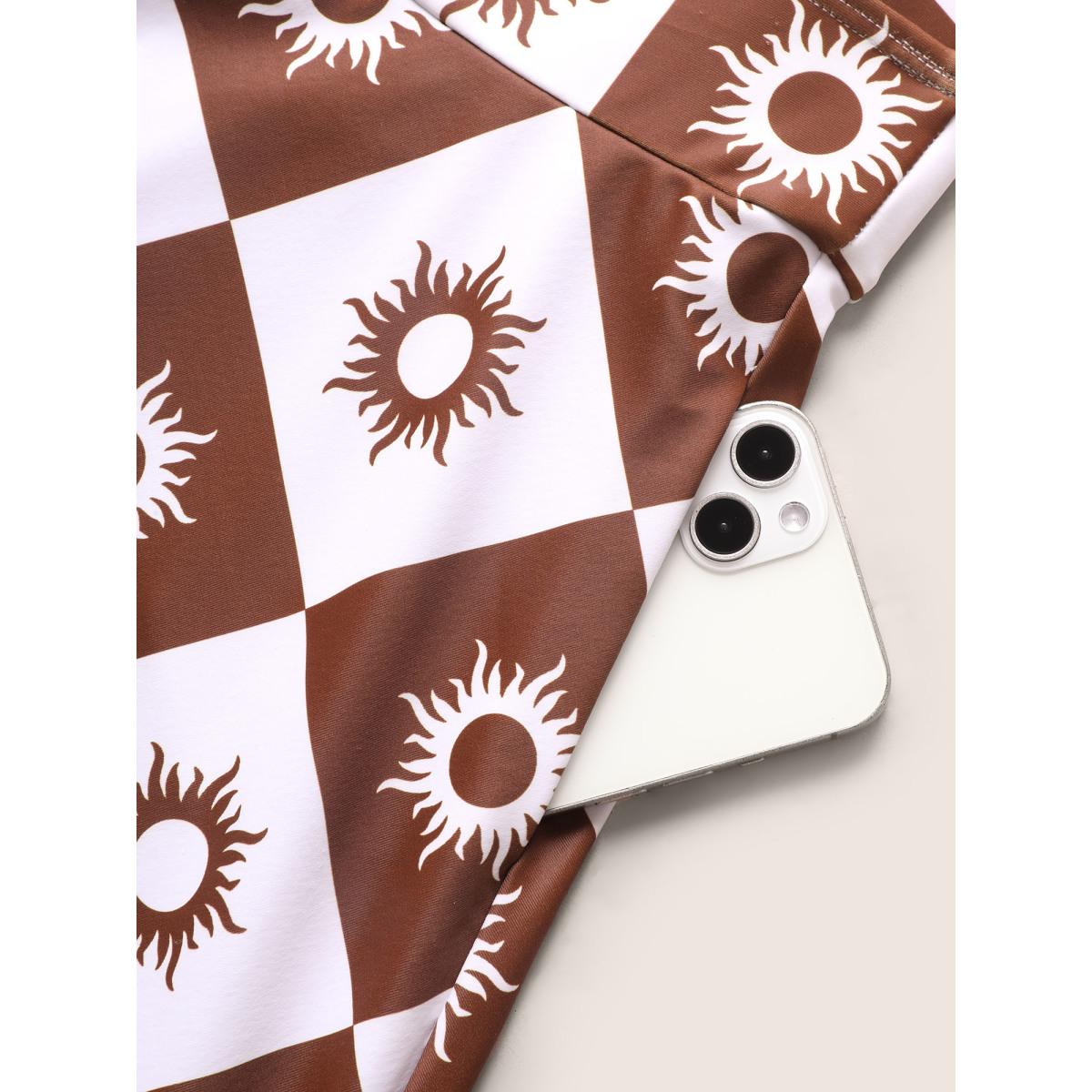 Plus Size Overlap Collar Sun Print Pocket Swim Dress Women's Swimwear DarkBrown Beach Bodycon Overlap Collar High stretch Curve Swim Dresses BloomChic 10/M