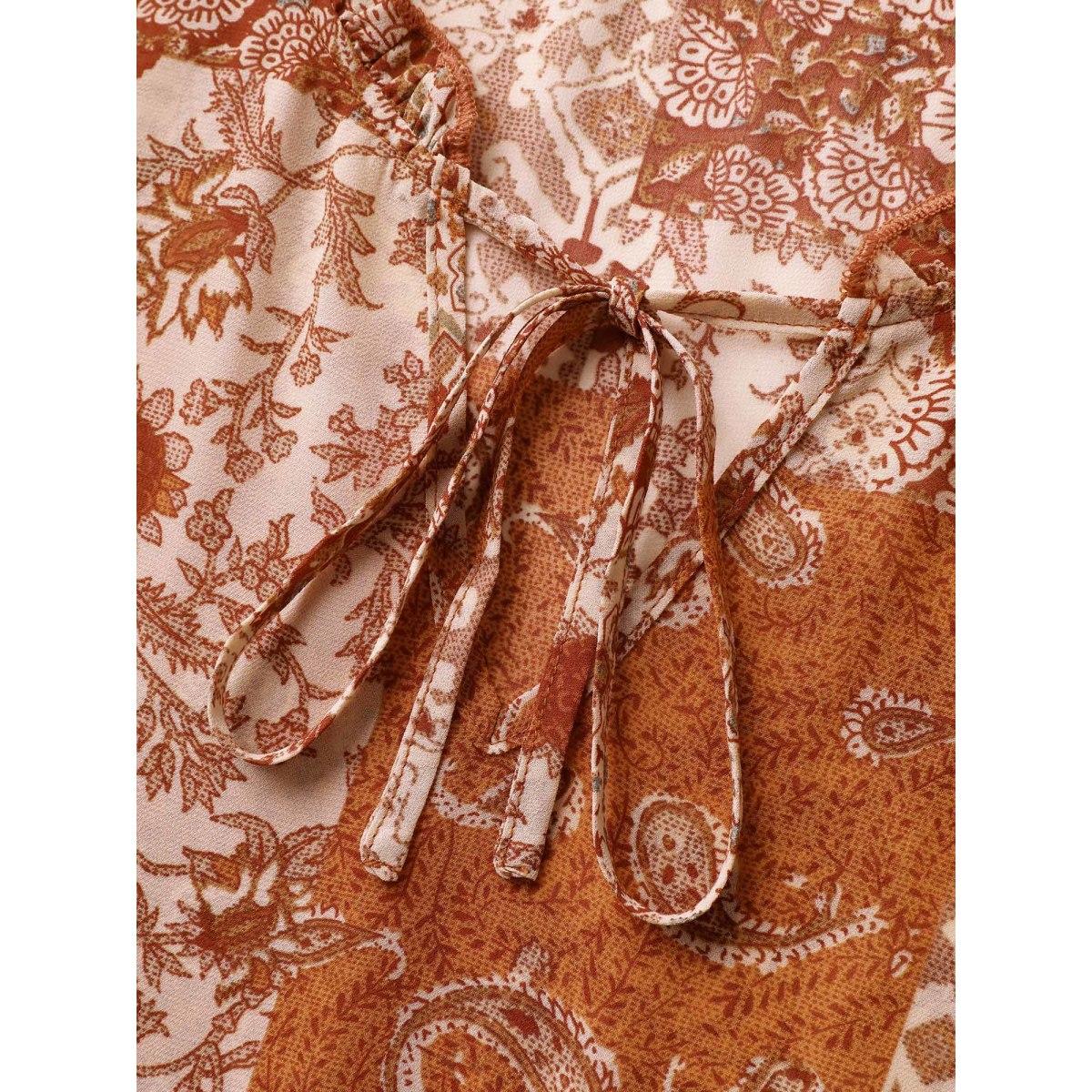 Plus Size Paisely Collage Ruffled Lined Knee-Length Dress Rust Women Boho Ribbon V-neck Short sleeve Curvy BloomChic 10/M Product Image