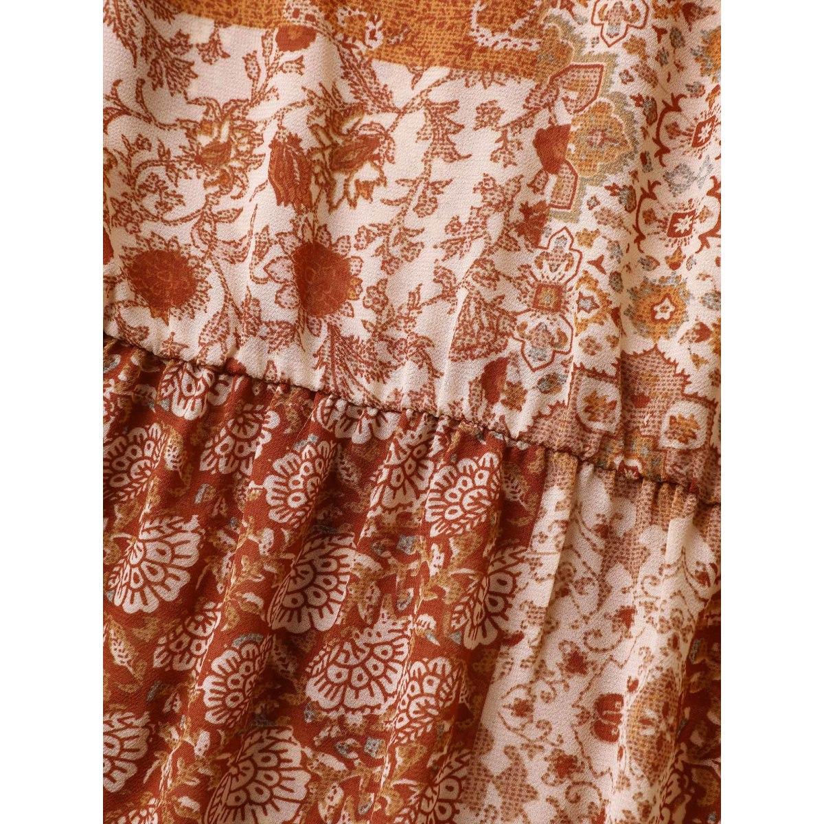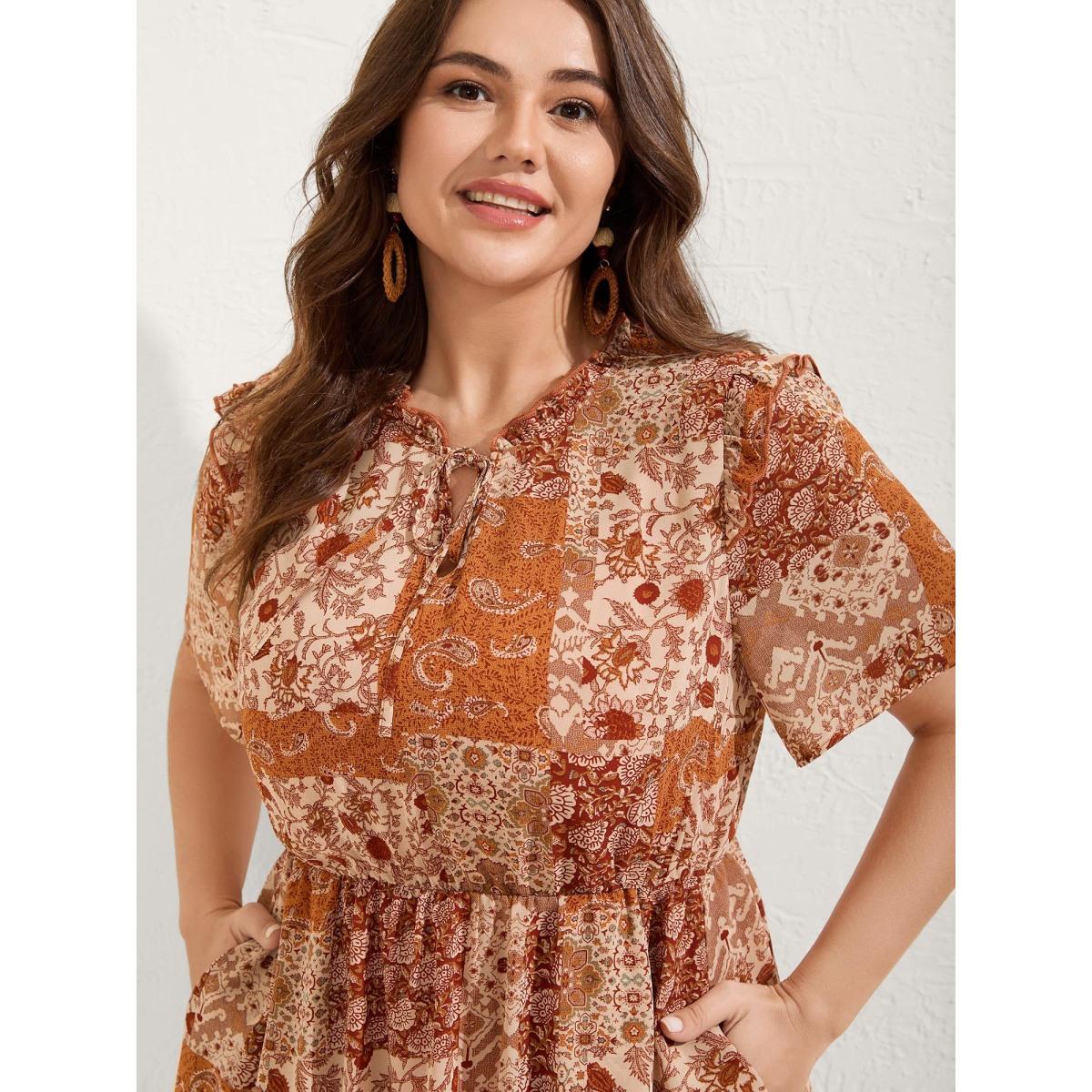 Plus Size Paisely Collage Ruffled Lined Knee-Length Dress Rust Women Boho Ribbon V-neck Short sleeve Curvy BloomChic 10/M