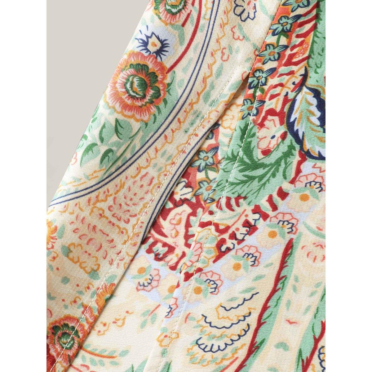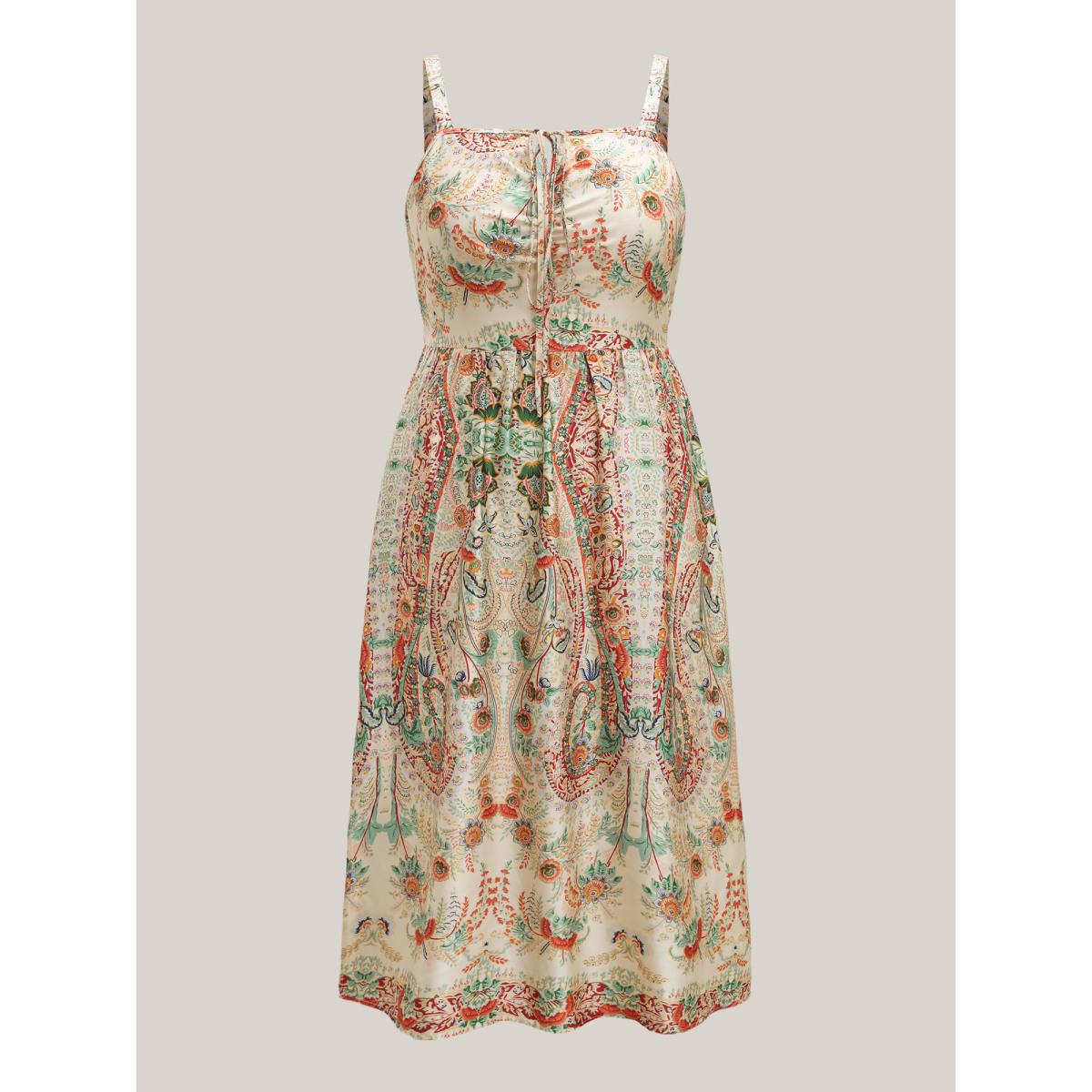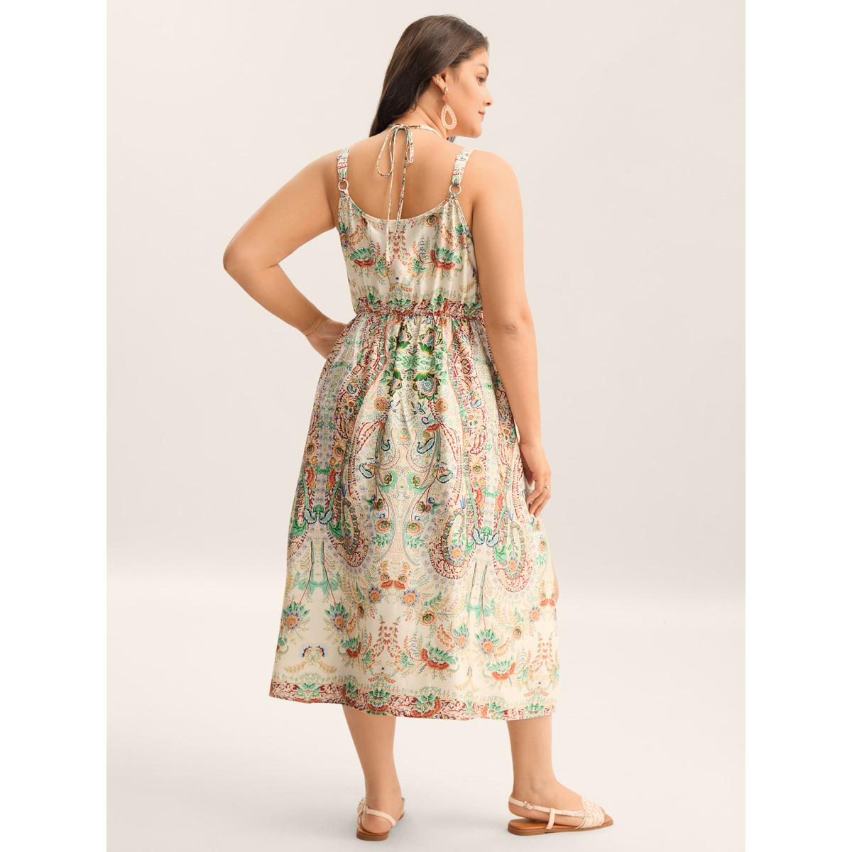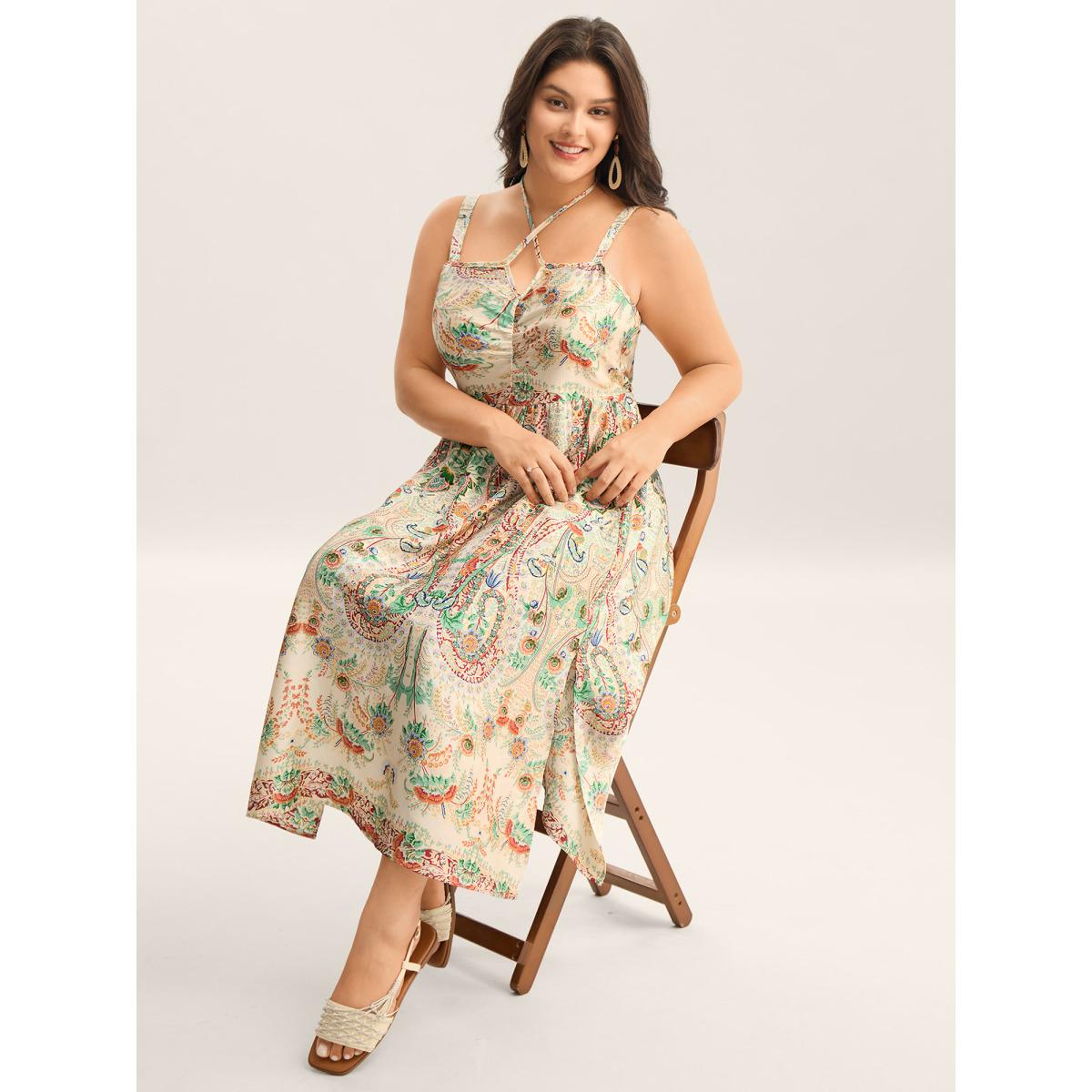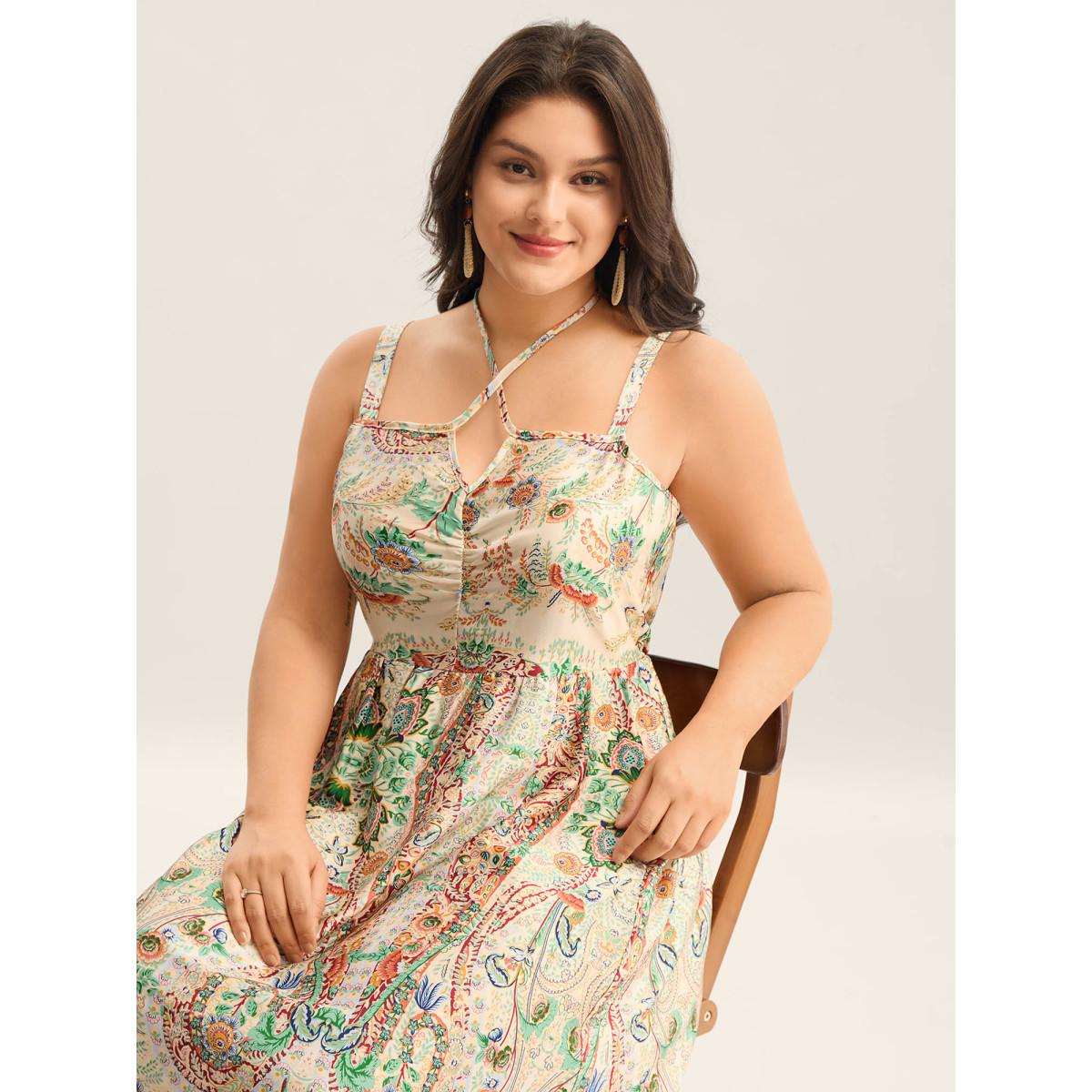 Plus Size Paisley Print Halter Neck A-Line Midi Dress Ivory Women Asymmetrical Neck Sleeveless Curvy BloomChic 10/M
