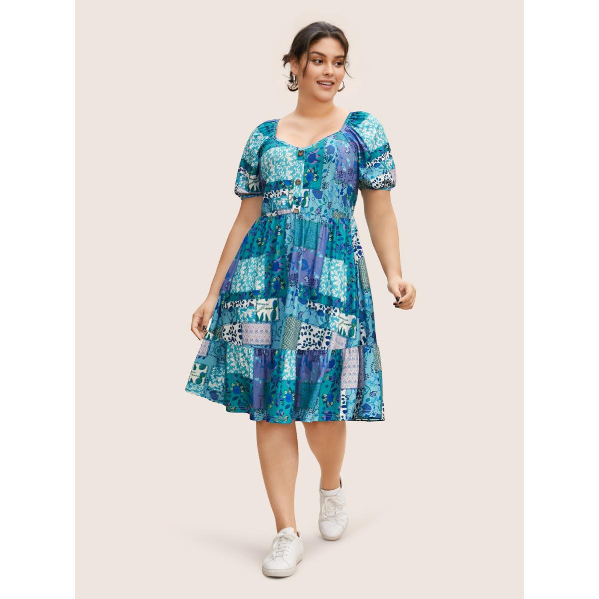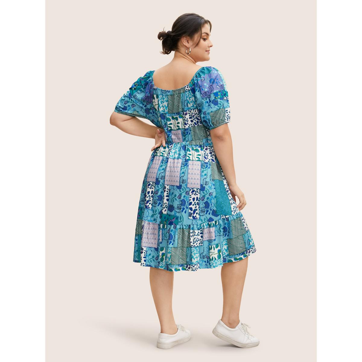 Plus Size Patchwork Boho Print Raglan Sleeve Midi Dress Cerulean Women Casual V-neck Short sleeve Curvy BloomChic 10/M