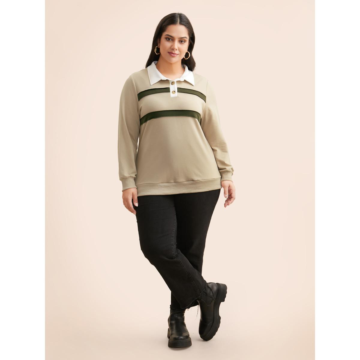 Plus Size Patchwork Contrast Button Up Sweatshirt Women Champagne Casual Contrast Shirt collar Everyday Sweatshirts BloomChic 28/5X