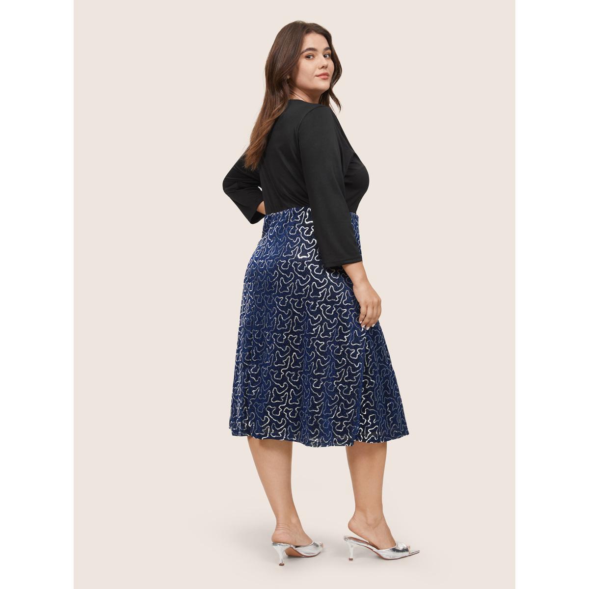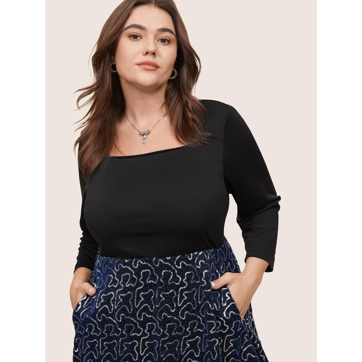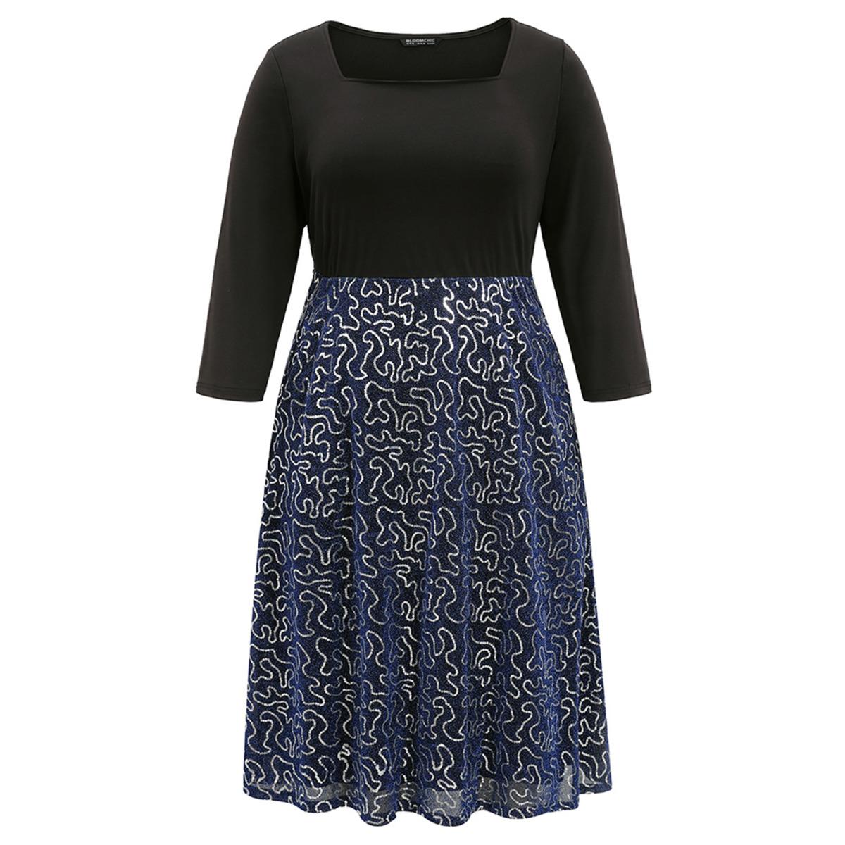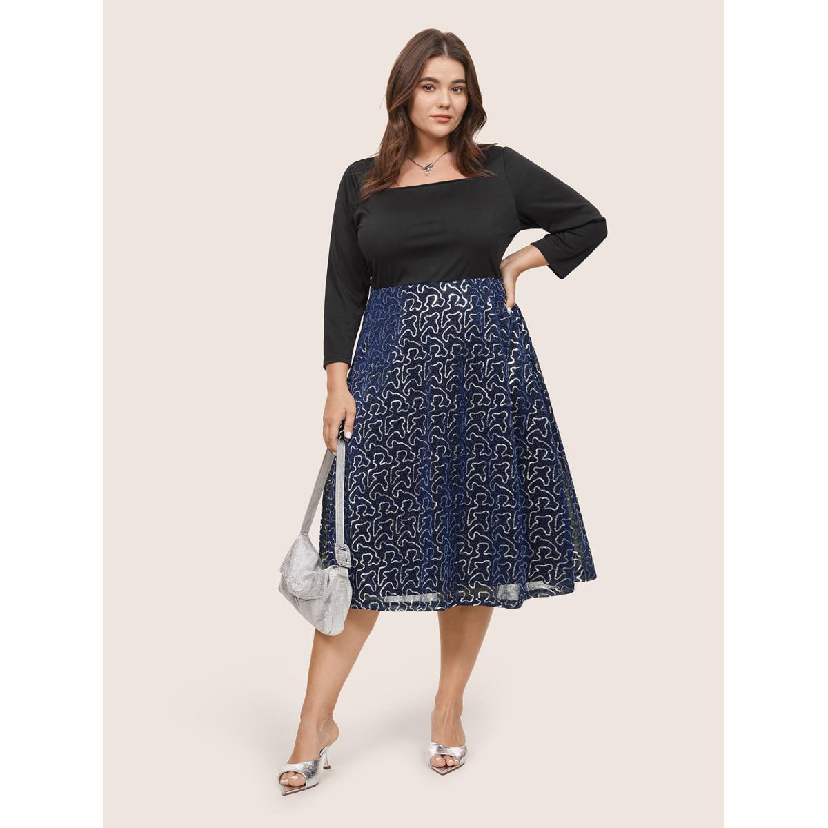 Plus Size Patchwork Sequin Elastic Waist Square Neck Dress Black Women Party Sequin Square Neck Long Sleeve Curvy Midi Dress BloomChic 28/5X