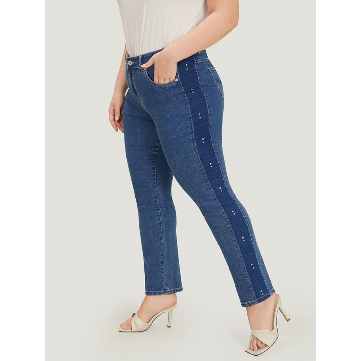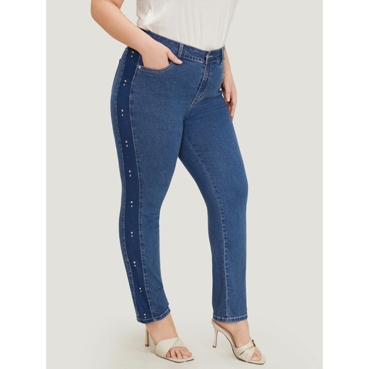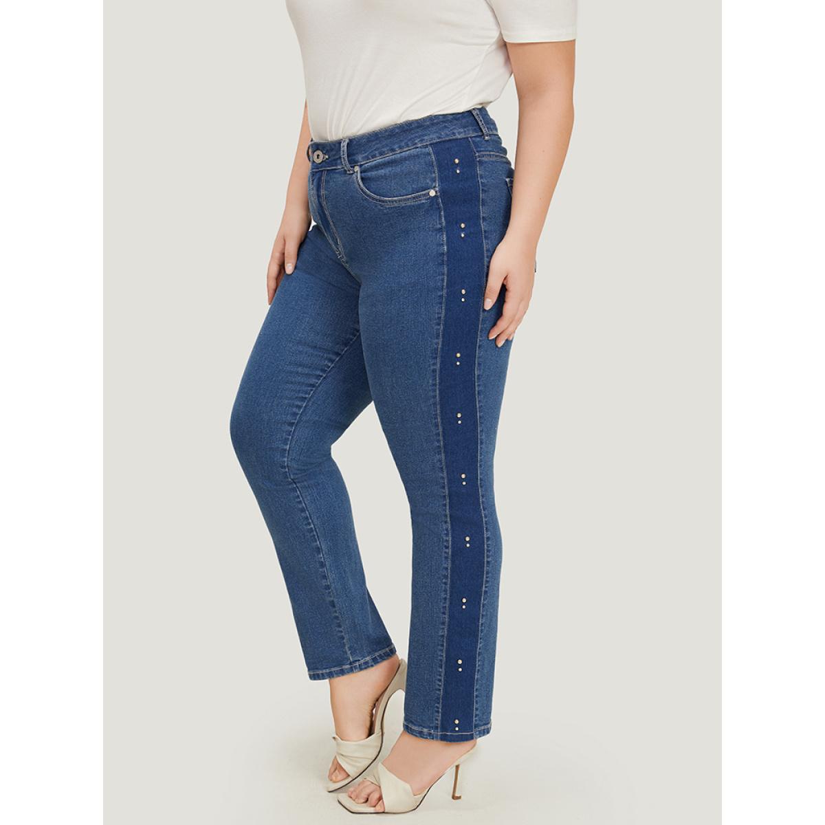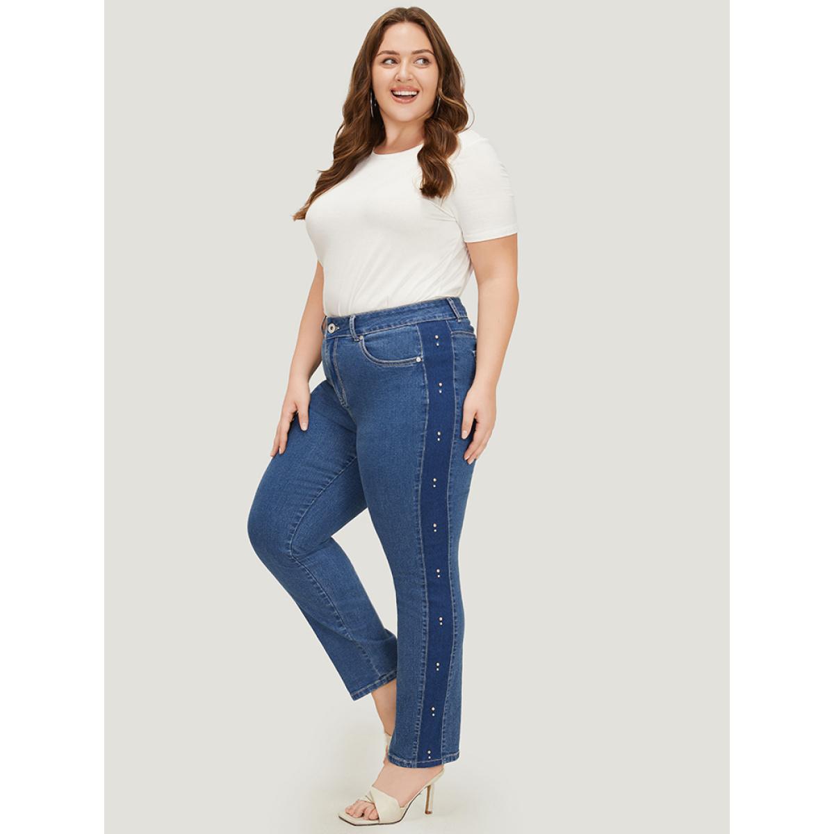 Plus Size Pearl Beaded Patchwork Medium Wash Jeans Women Indigo Casual Colorblock Beaded High stretch Pocket Jeans BloomChic 18/2X
