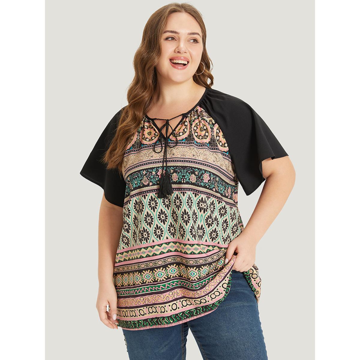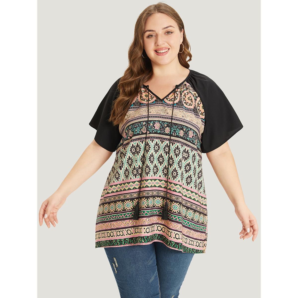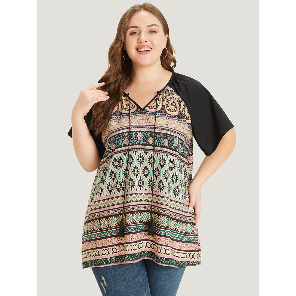 Plus Size Pink Moroccan Print Raglan Sleeve Tassels Tie Neck Blouse Women Vacation Short sleeve Tie Neck Dailywear Blouses BloomChic 28/5X